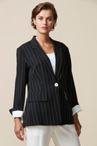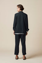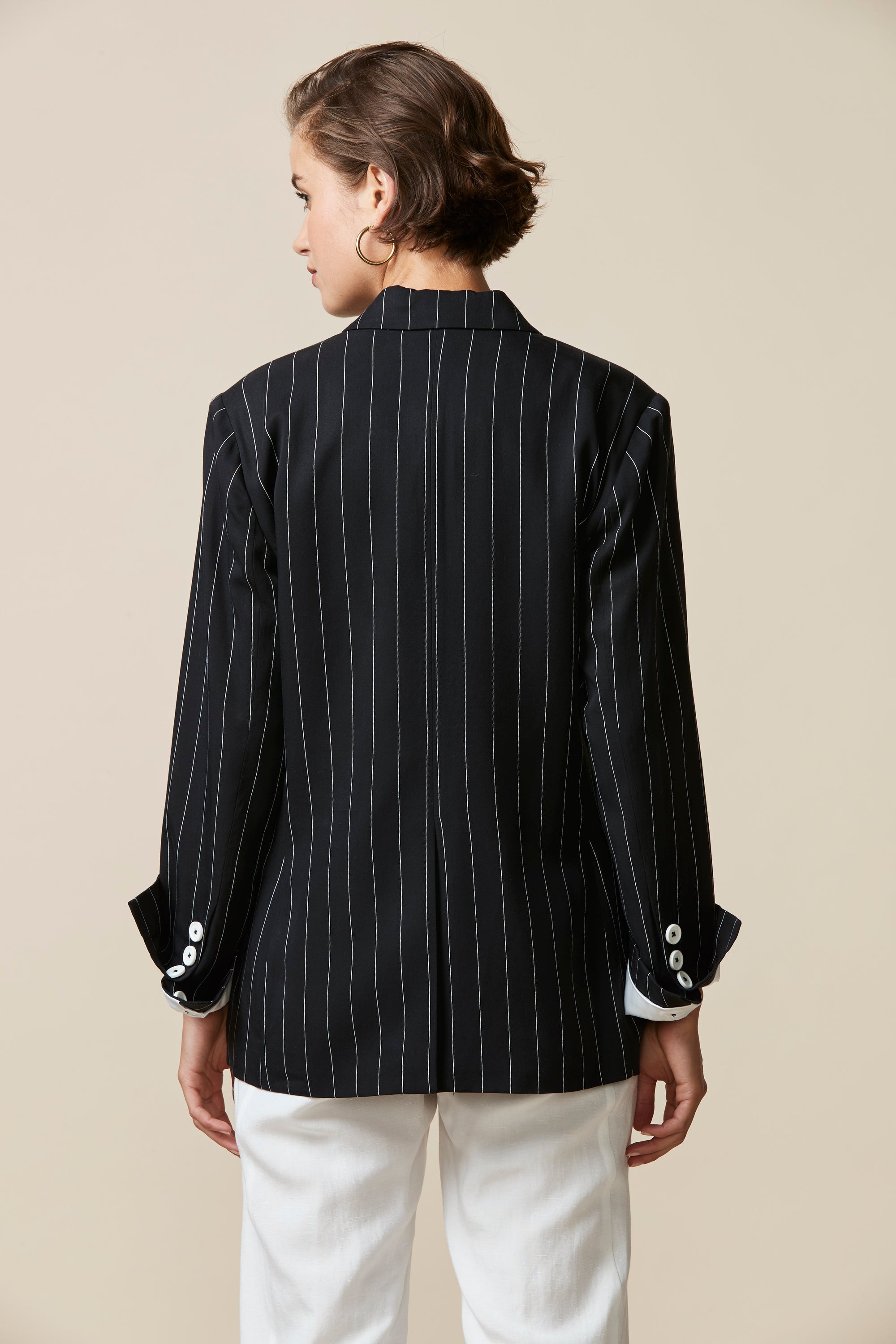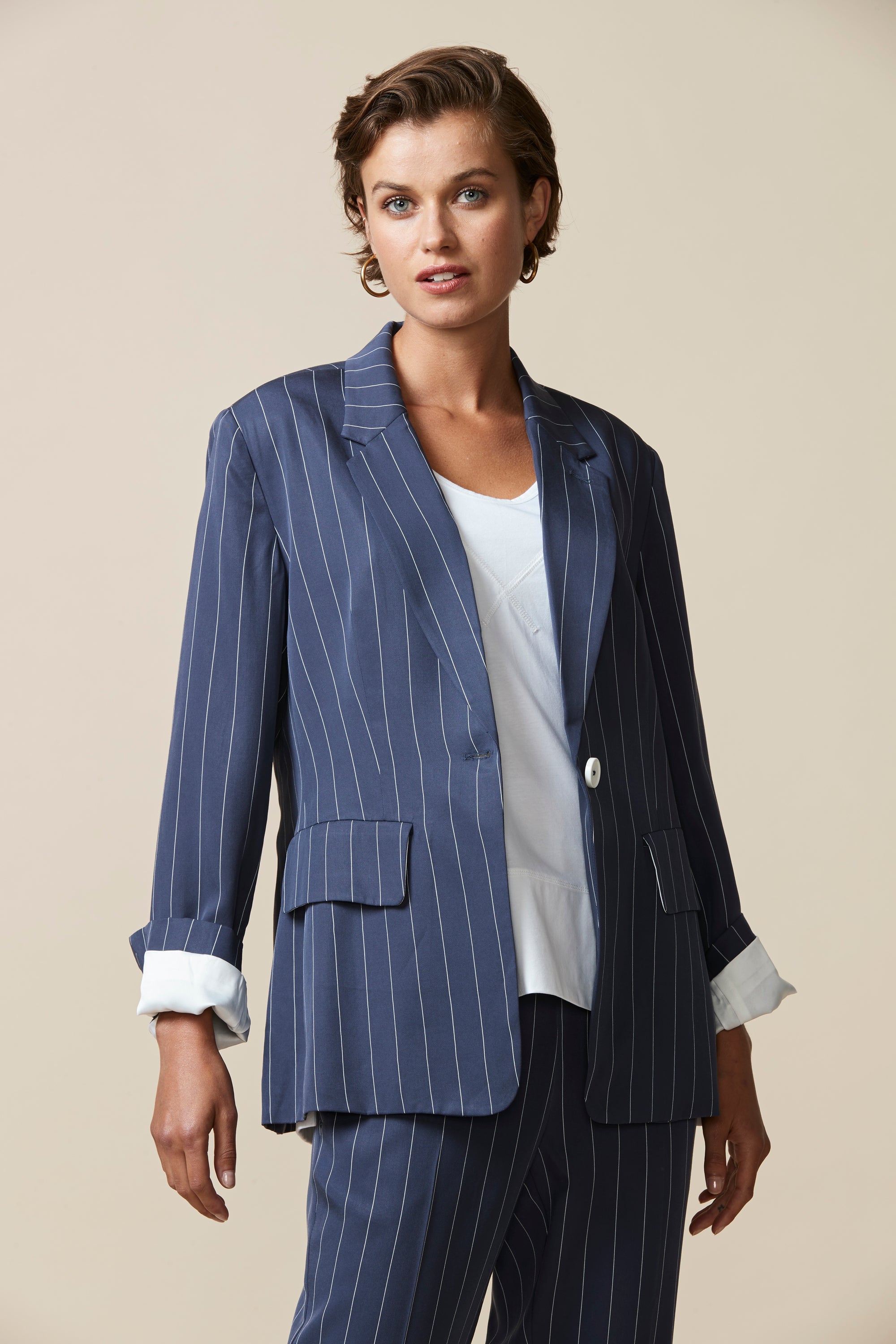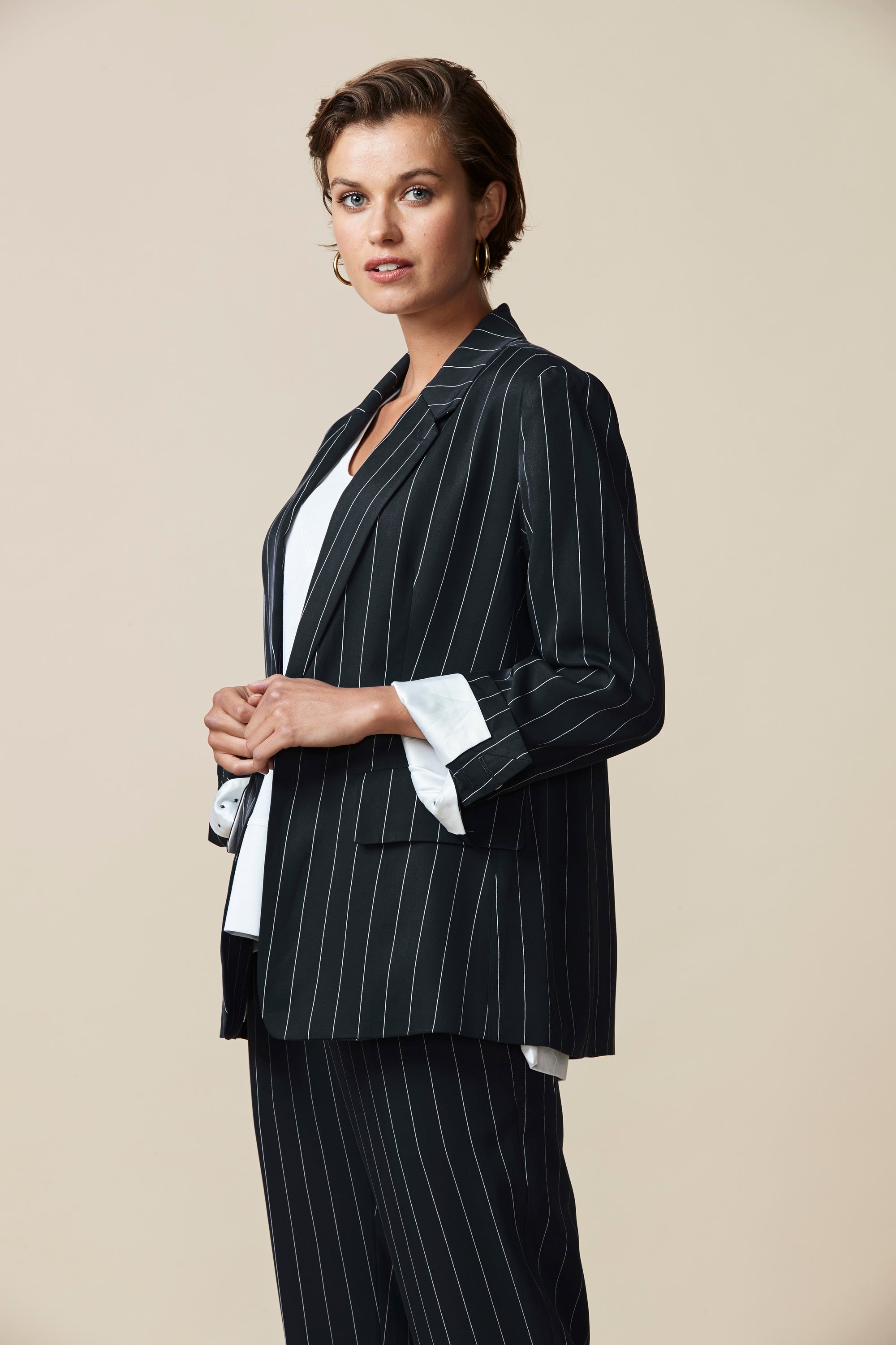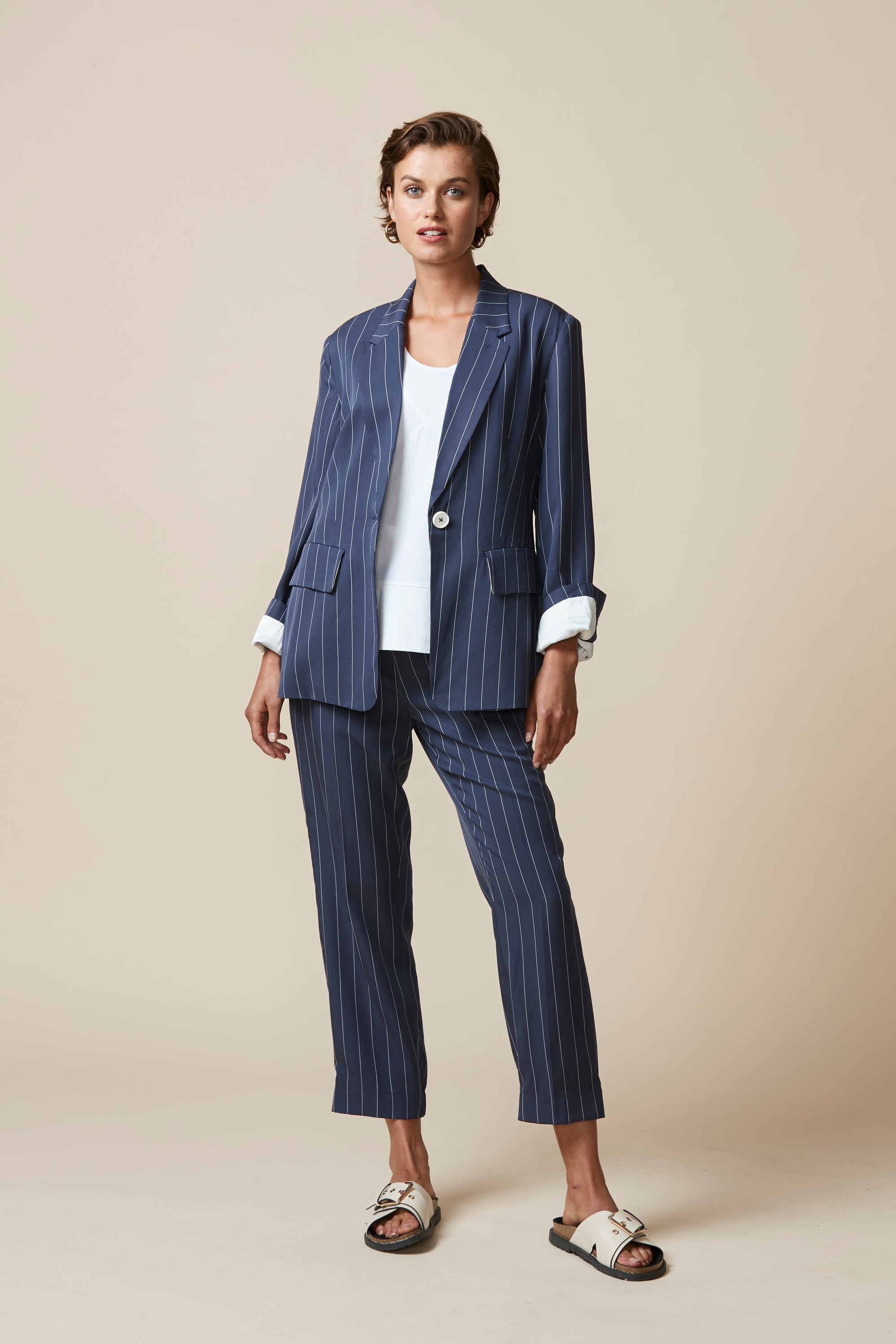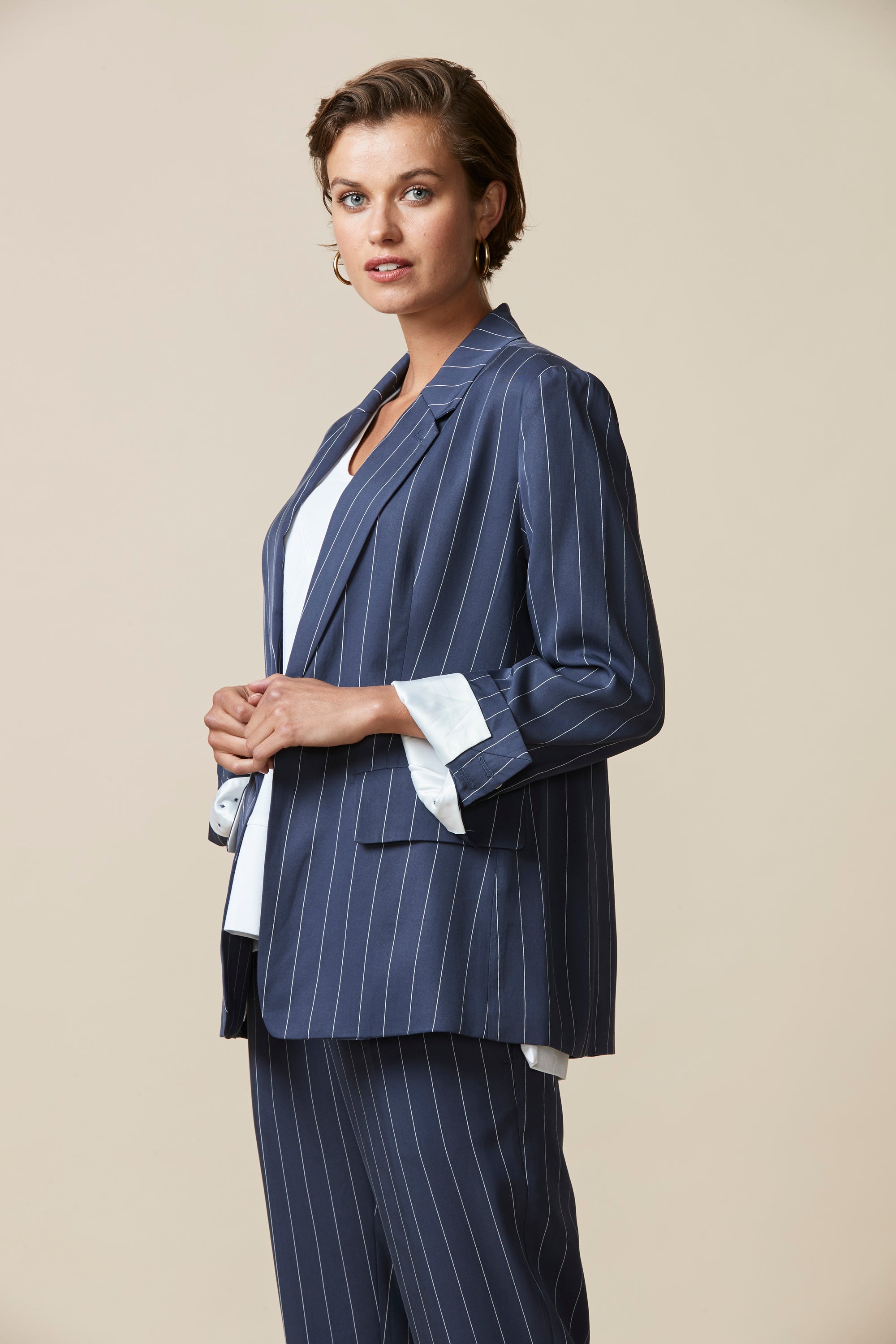 Tailored stripe jacket featuring fully functioning cuff, flap pockets, contrast lining and statement buttons. Wear as a suit with our Tram Pant, or slip on over one of our essential tees with jeans for comfort in style.