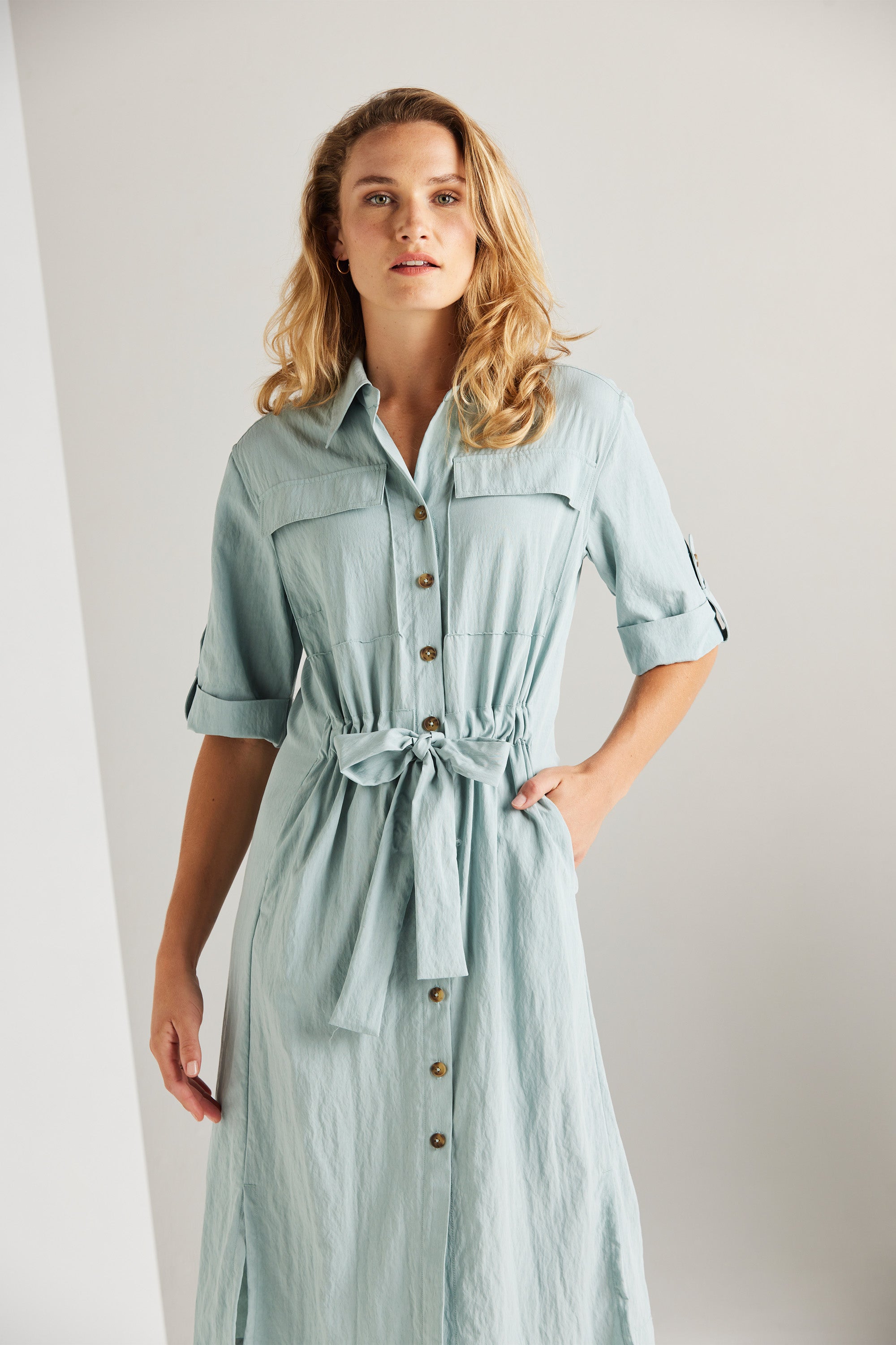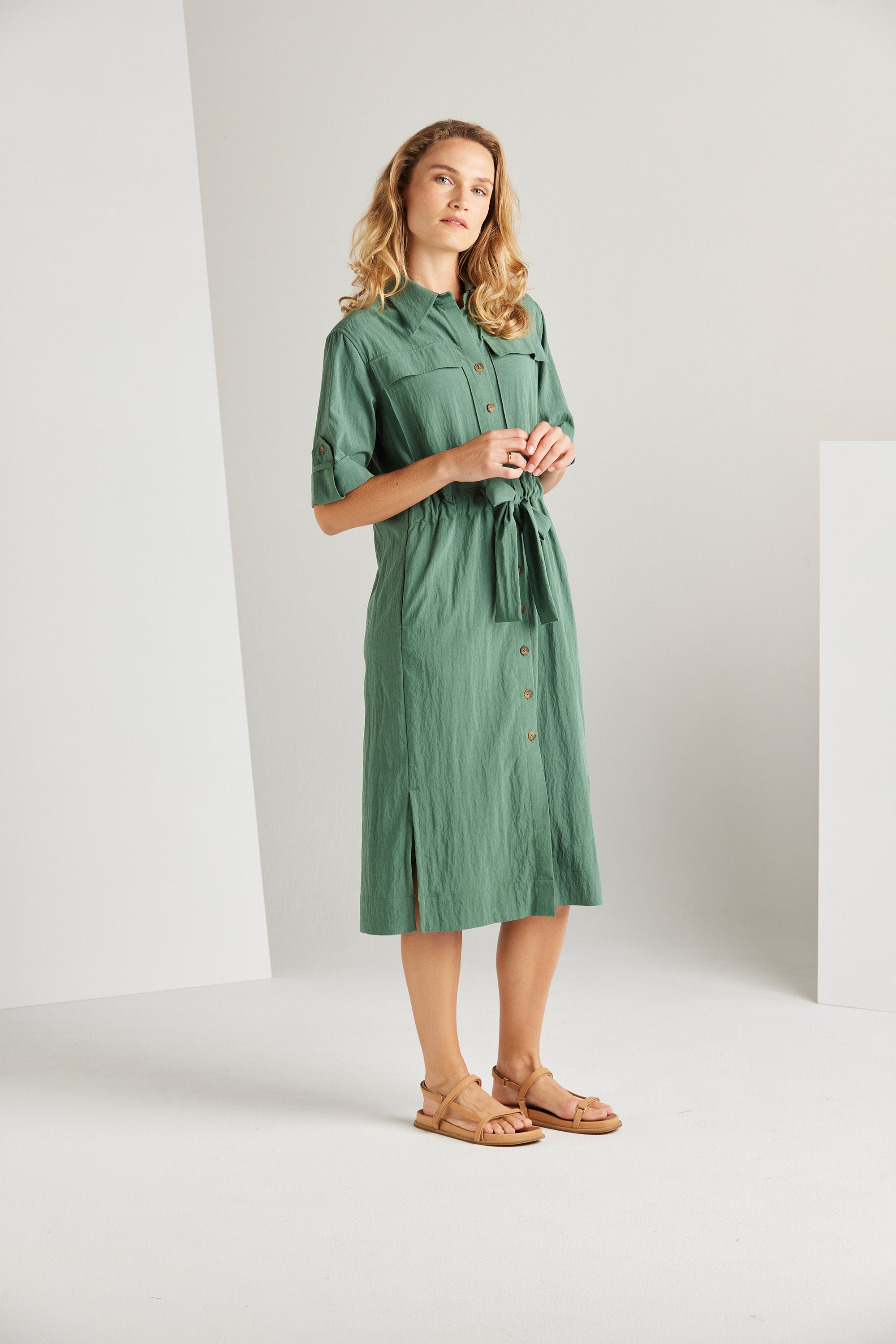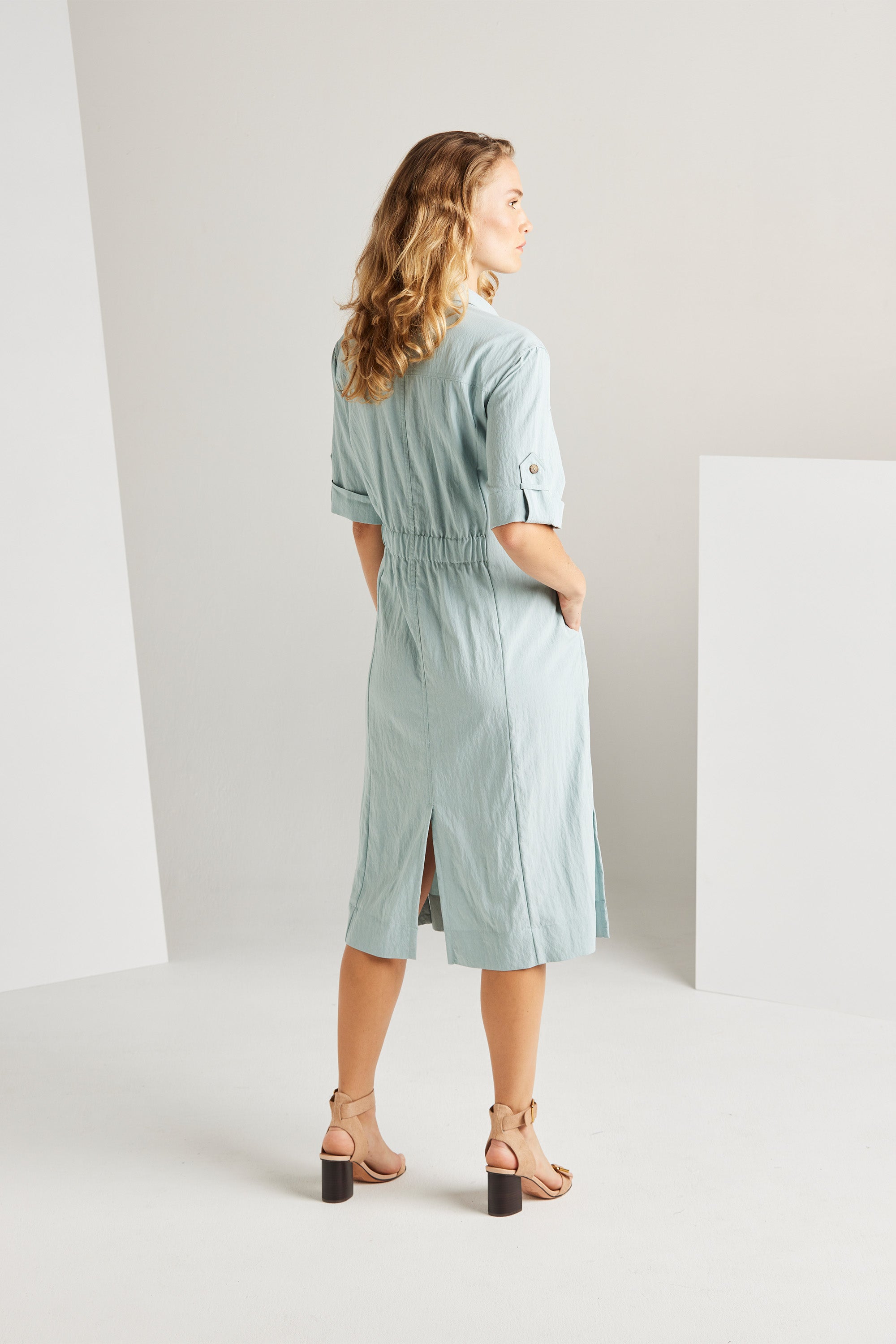 The Trench Dress blends feminine aesthetics with a contemporary edge, resulting in a stylish and functional piece. Its key features include side splits, a central front placket, and a waist casing, adding to its modern appeal. Combine it with heels for a dressy look or sneakers for a relaxed style.