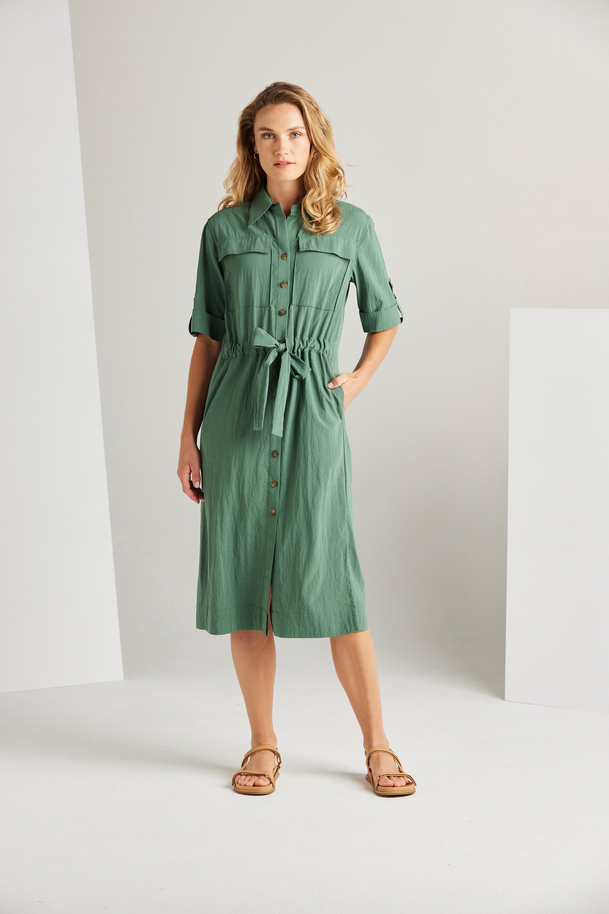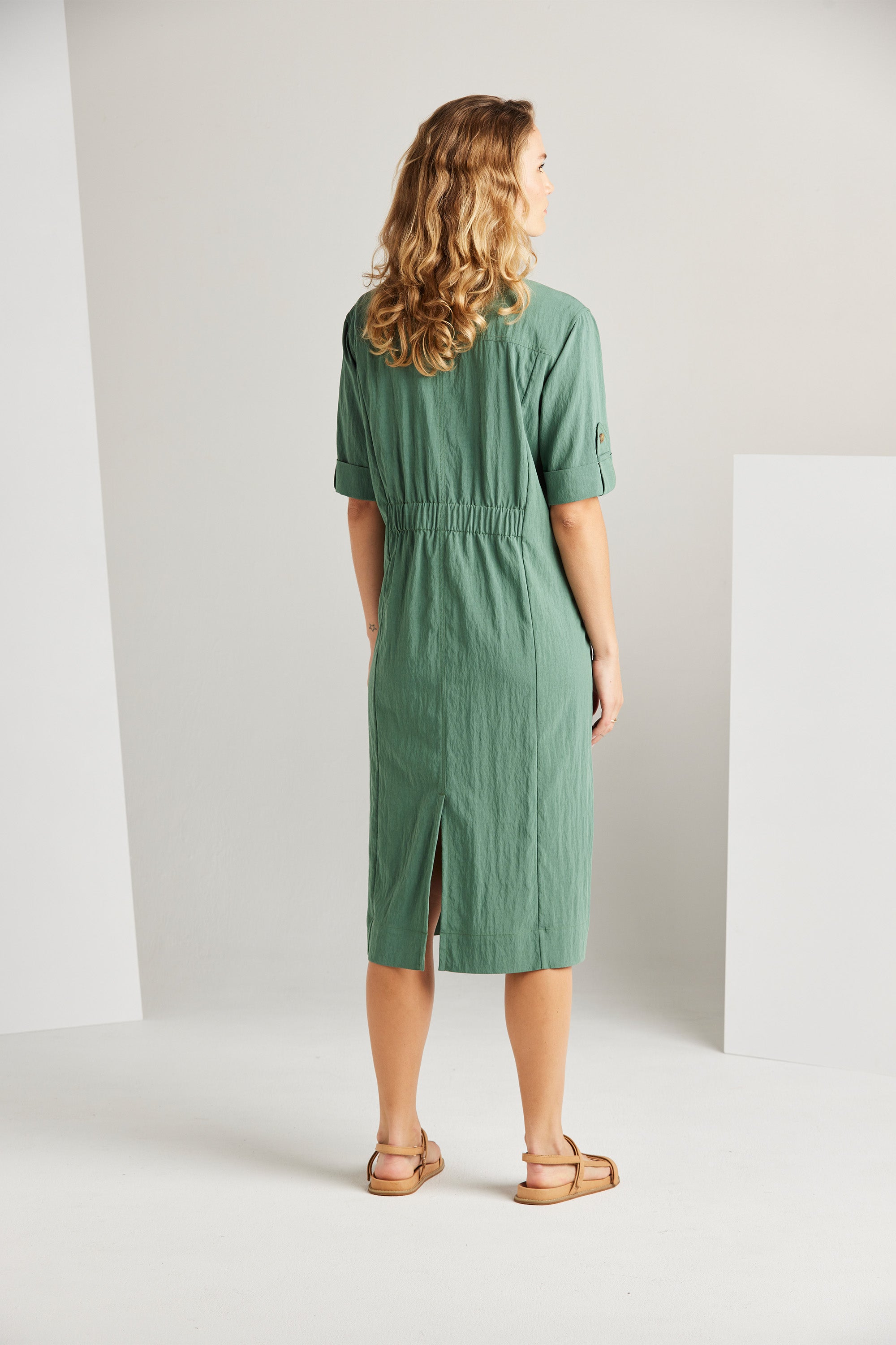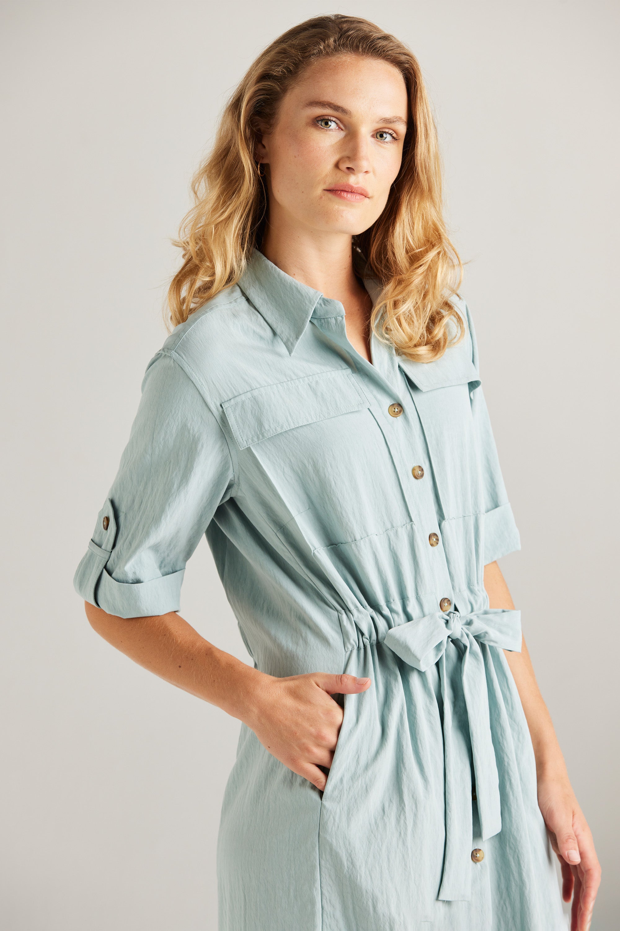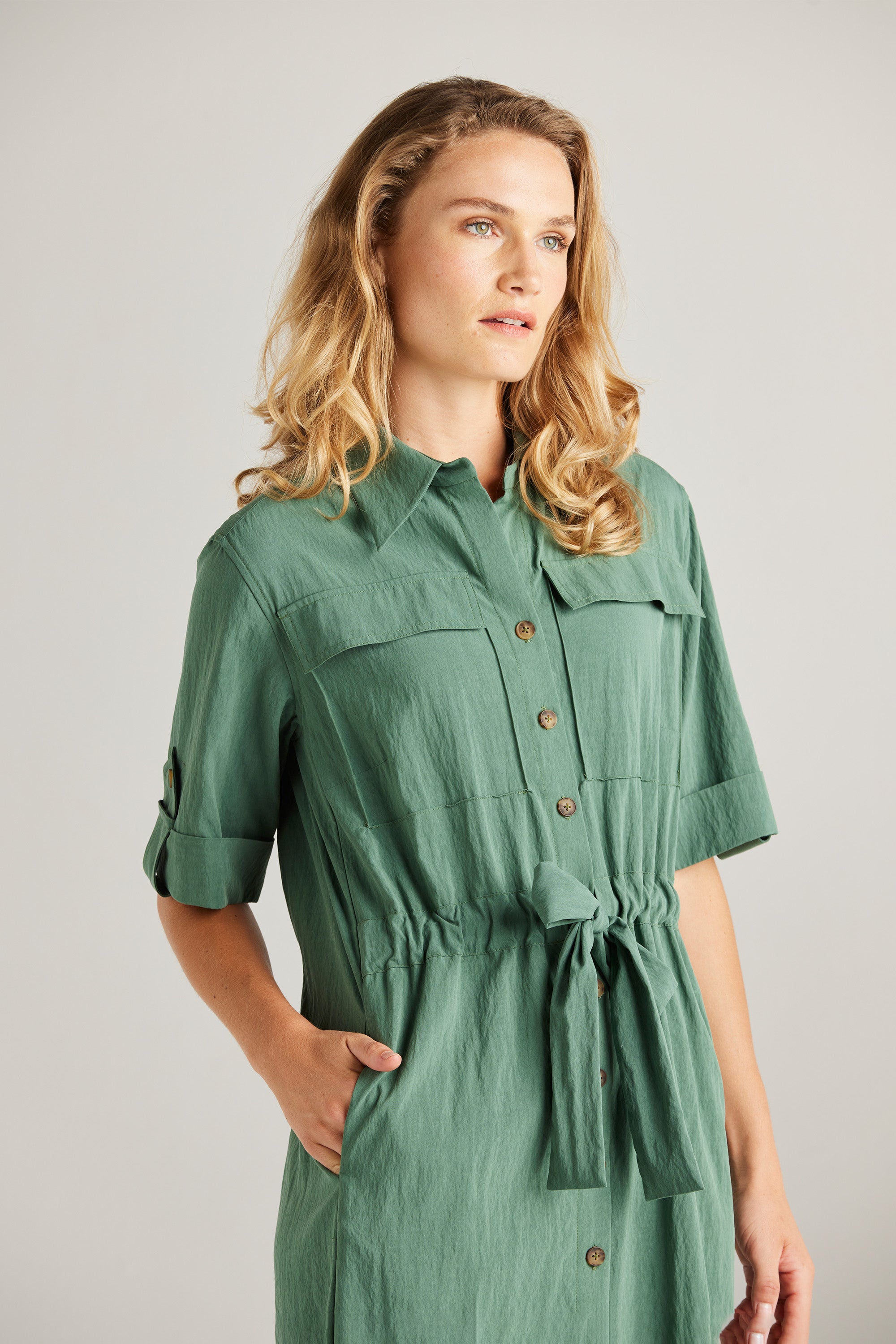 The Trench Dress blends feminine aesthetics with a contemporary edge, resulting in a stylish and functional piece. Its key features include side splits, a central front placket, and a waist casing, adding to its modern appeal. Combine it with heels for a dressy look or sneakers for a relaxed style.