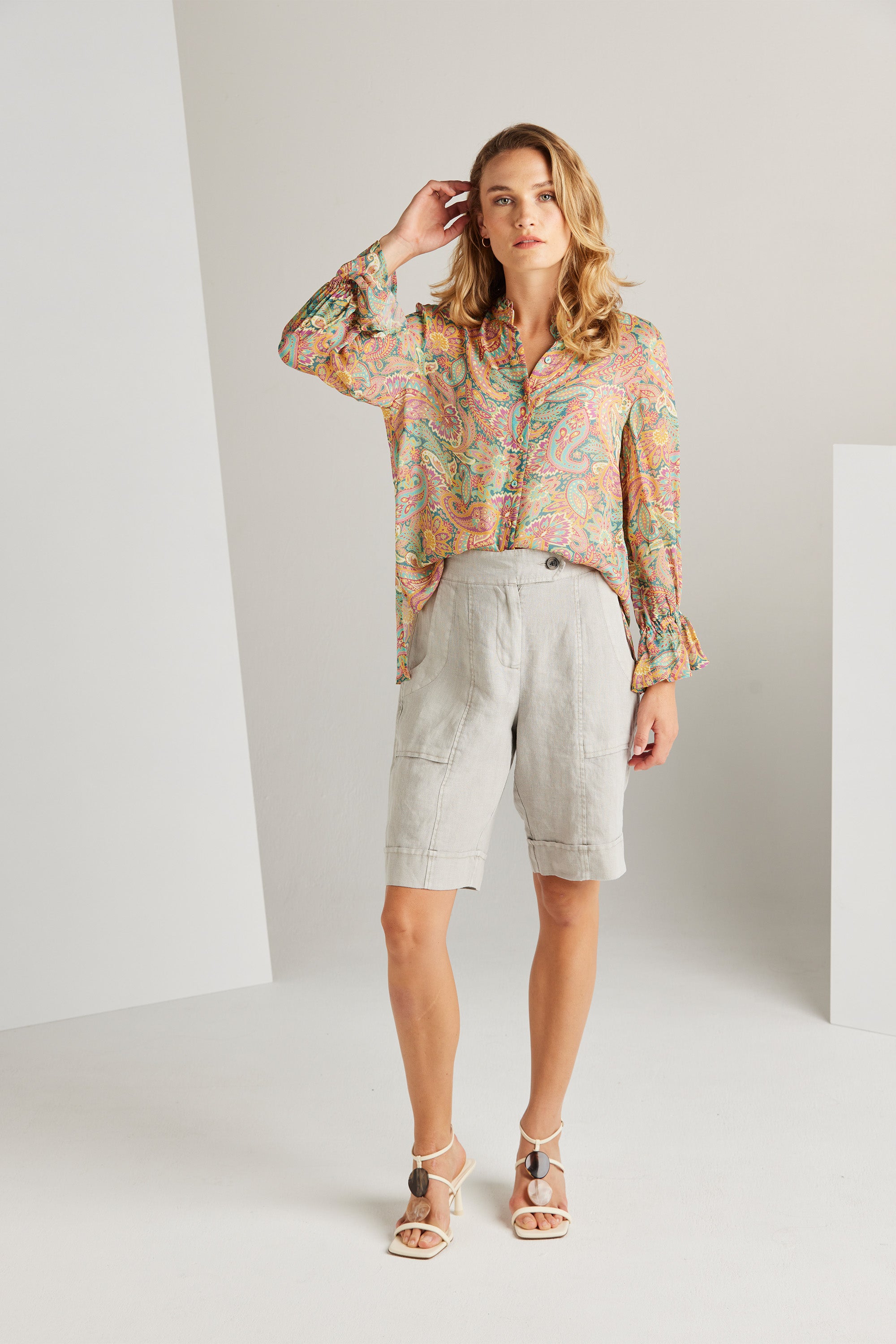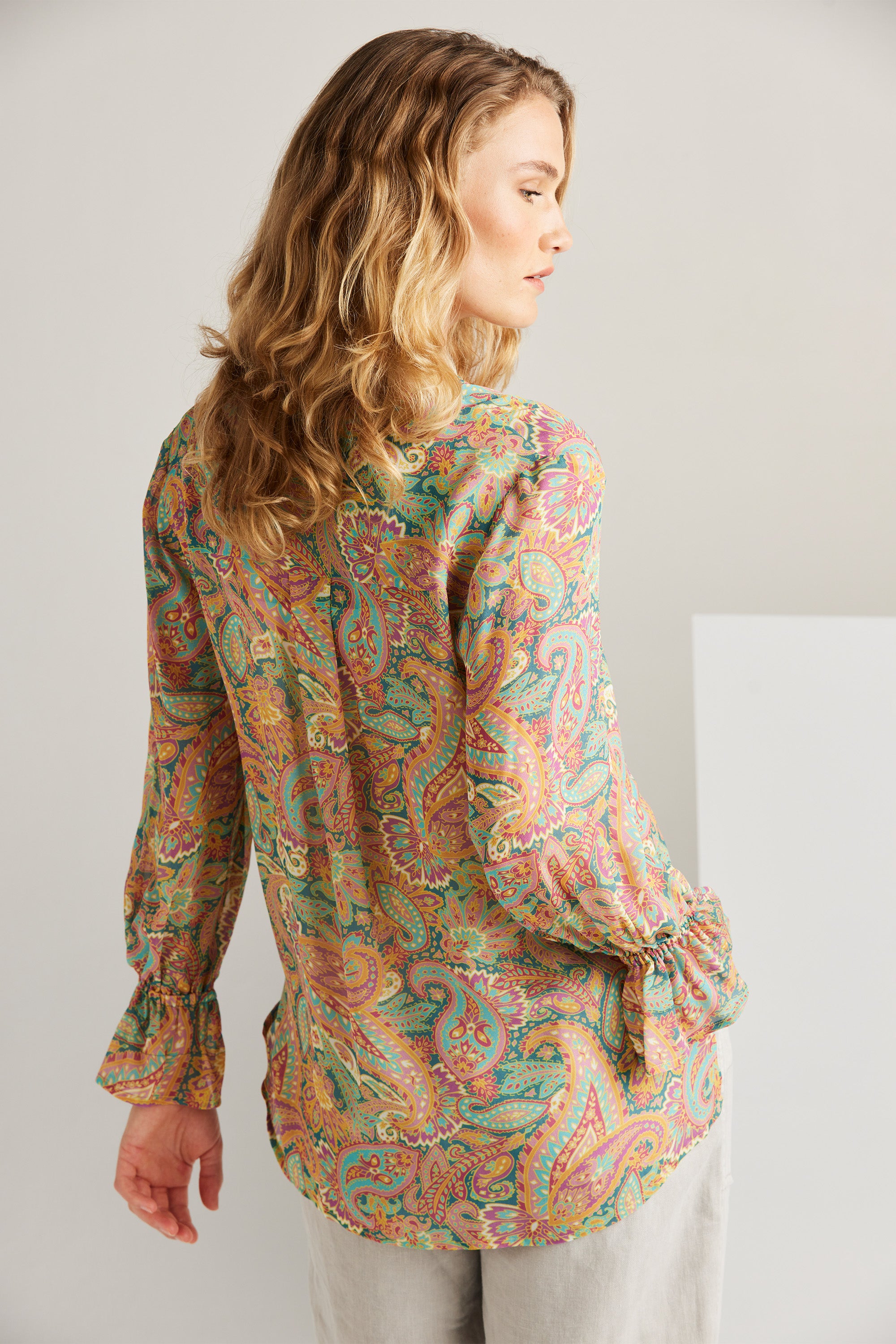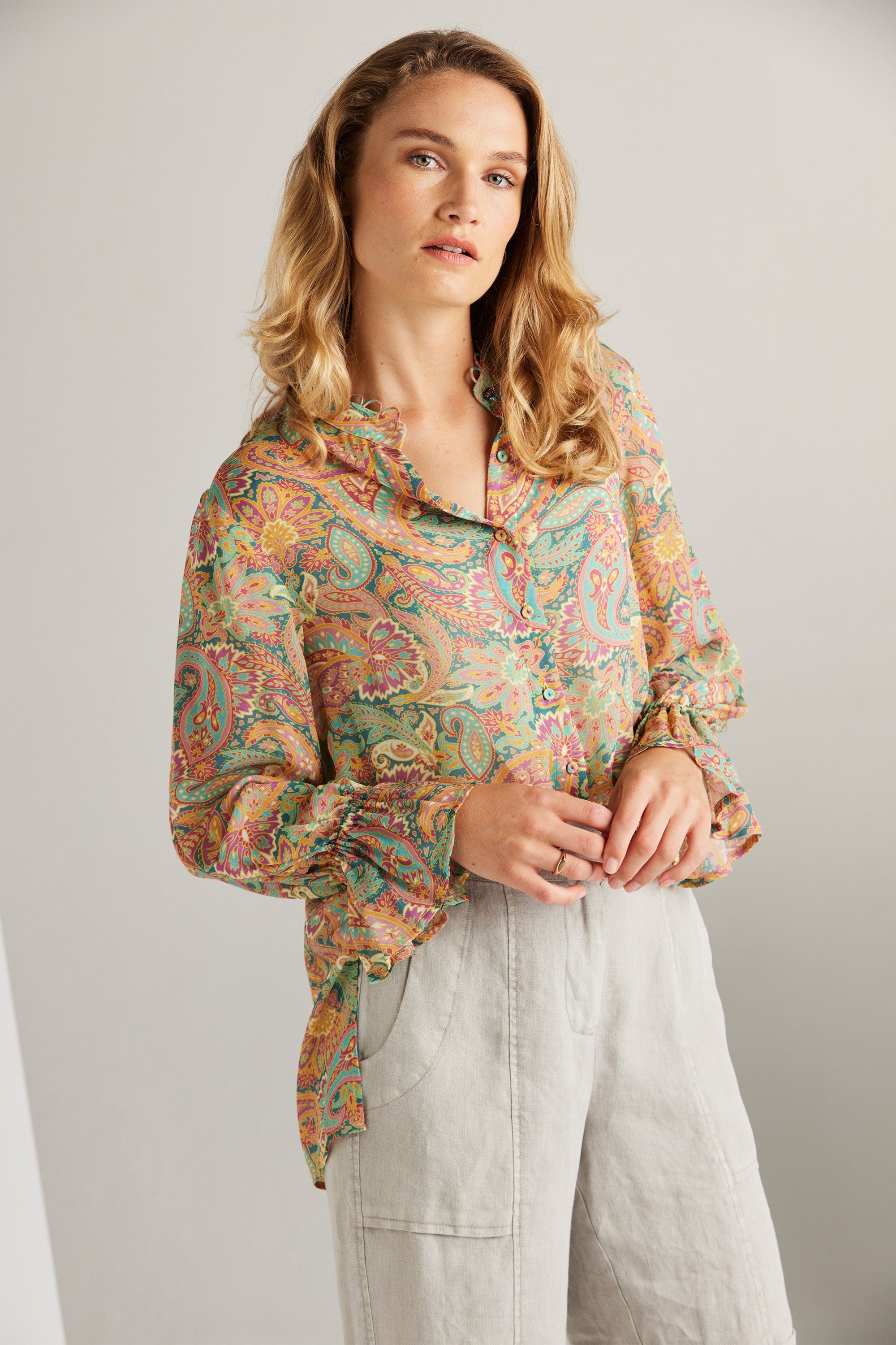 The Trinity shirt exudes sophistication with its intricate paisley print in vibrant hues. Highlighted by a jewel button at the neckband and delicate looped trim along the neckline, these details enhance the beauty of this stunning shirt—perfect for embracing the spirit of spring.