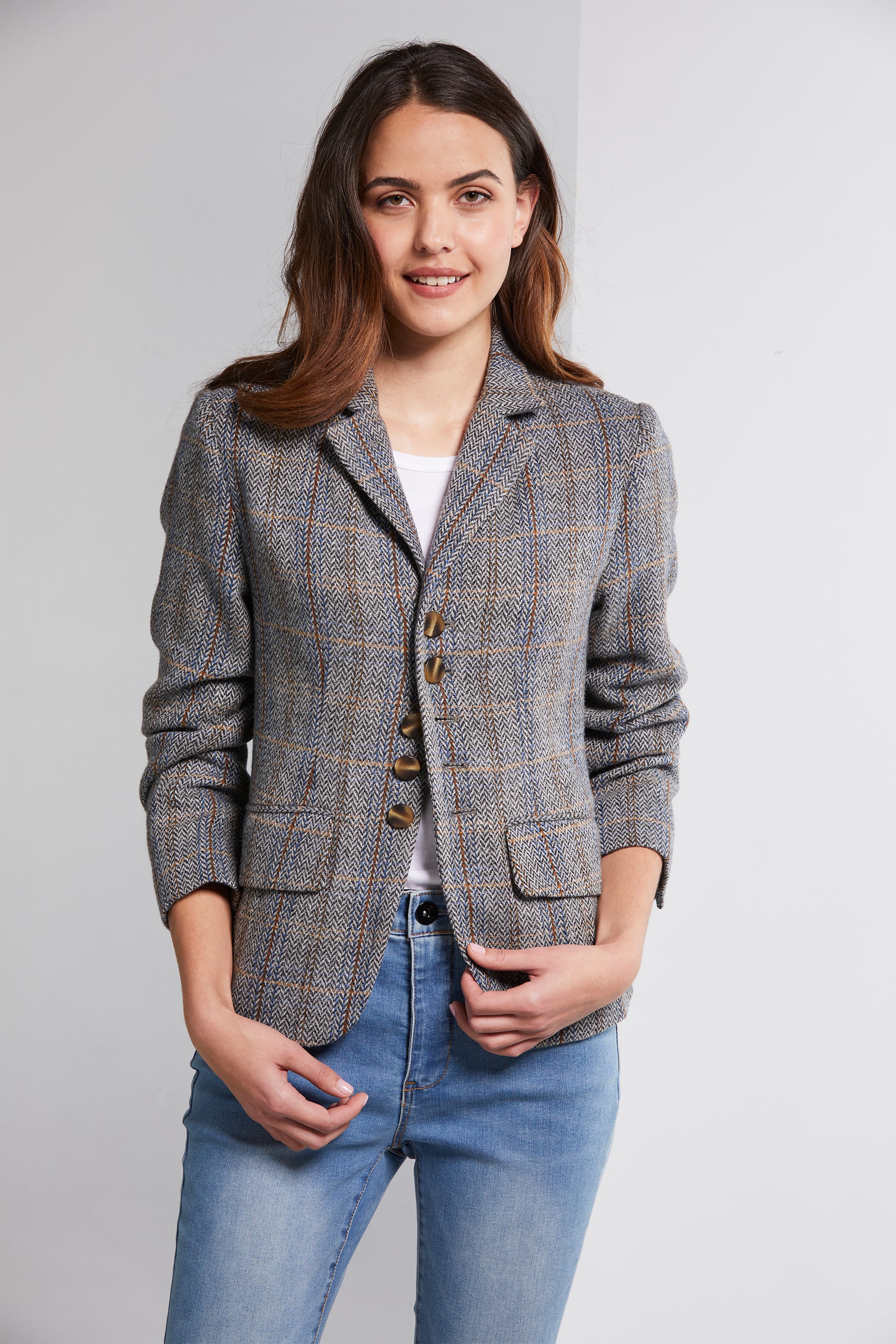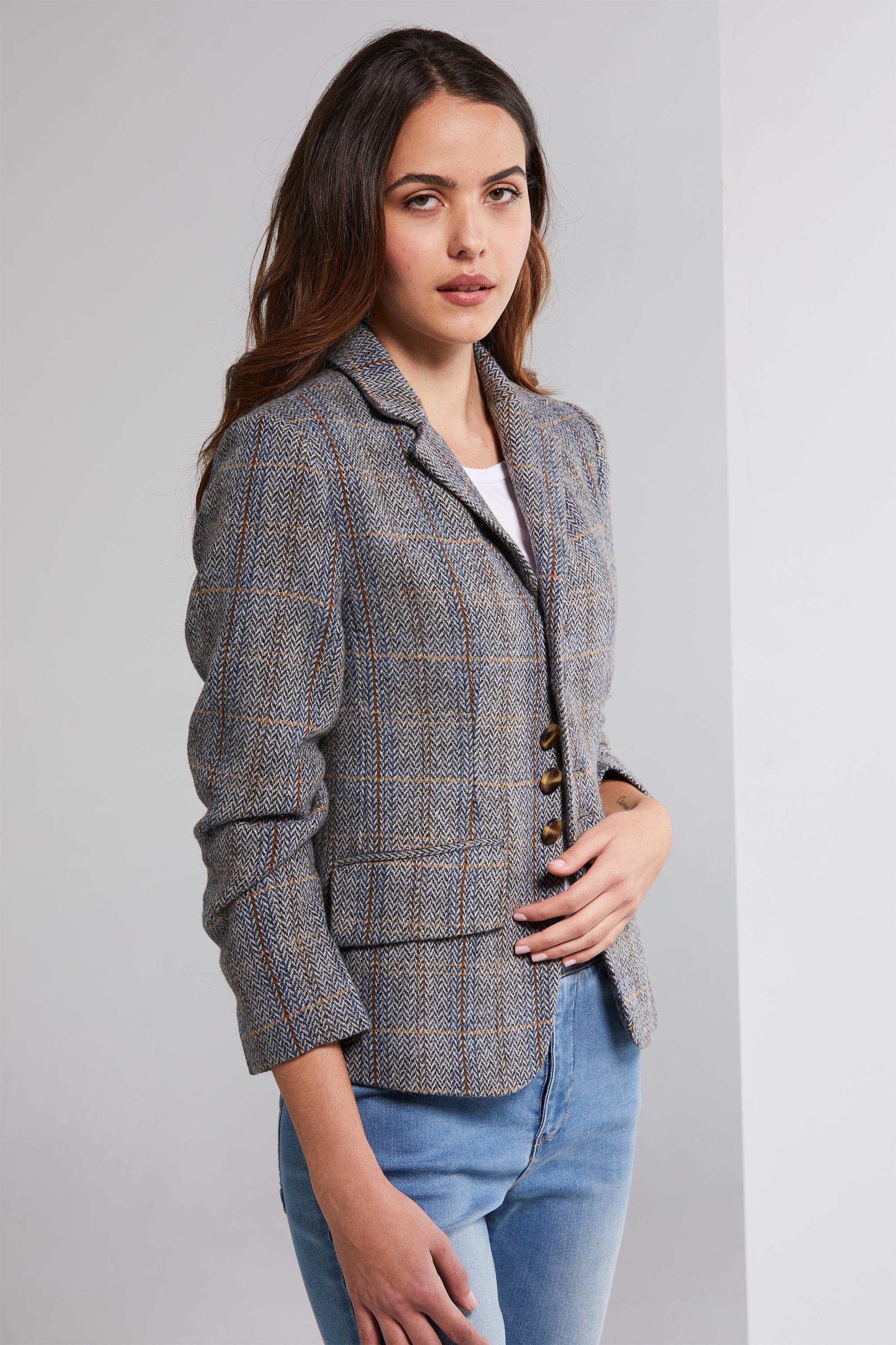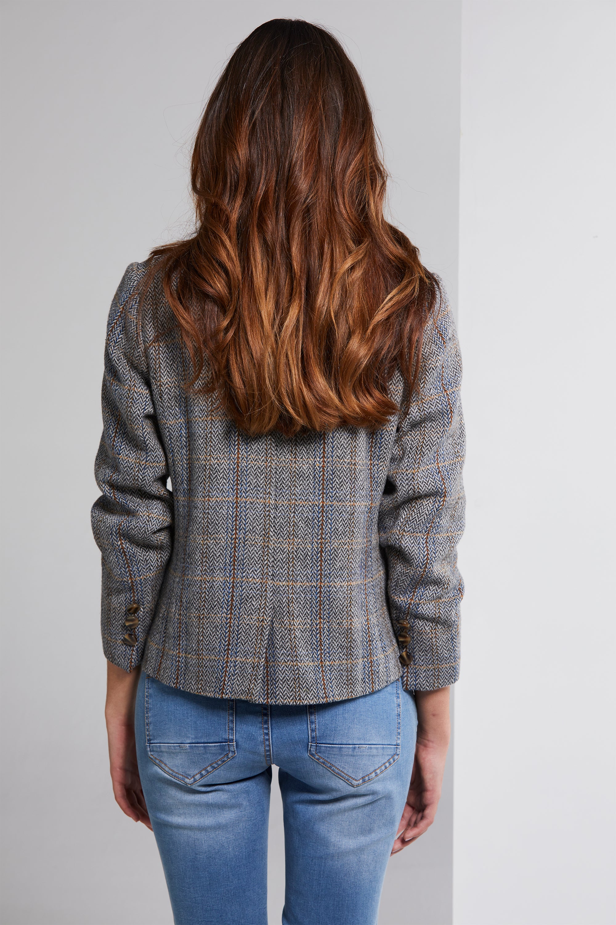 Embrace timeless elegance with our fitted Tweed Jacket. Crafted in charcoal herringbone tweed, it features a subtle check pattern in shades of red, blue, and natural tans. The flattering rounded hemline with a centre-back vent adds a touch of sophistication. Dark tortoiseshell buttons adorn the front closure and sleeve cuffs, elevating your style with every wear.