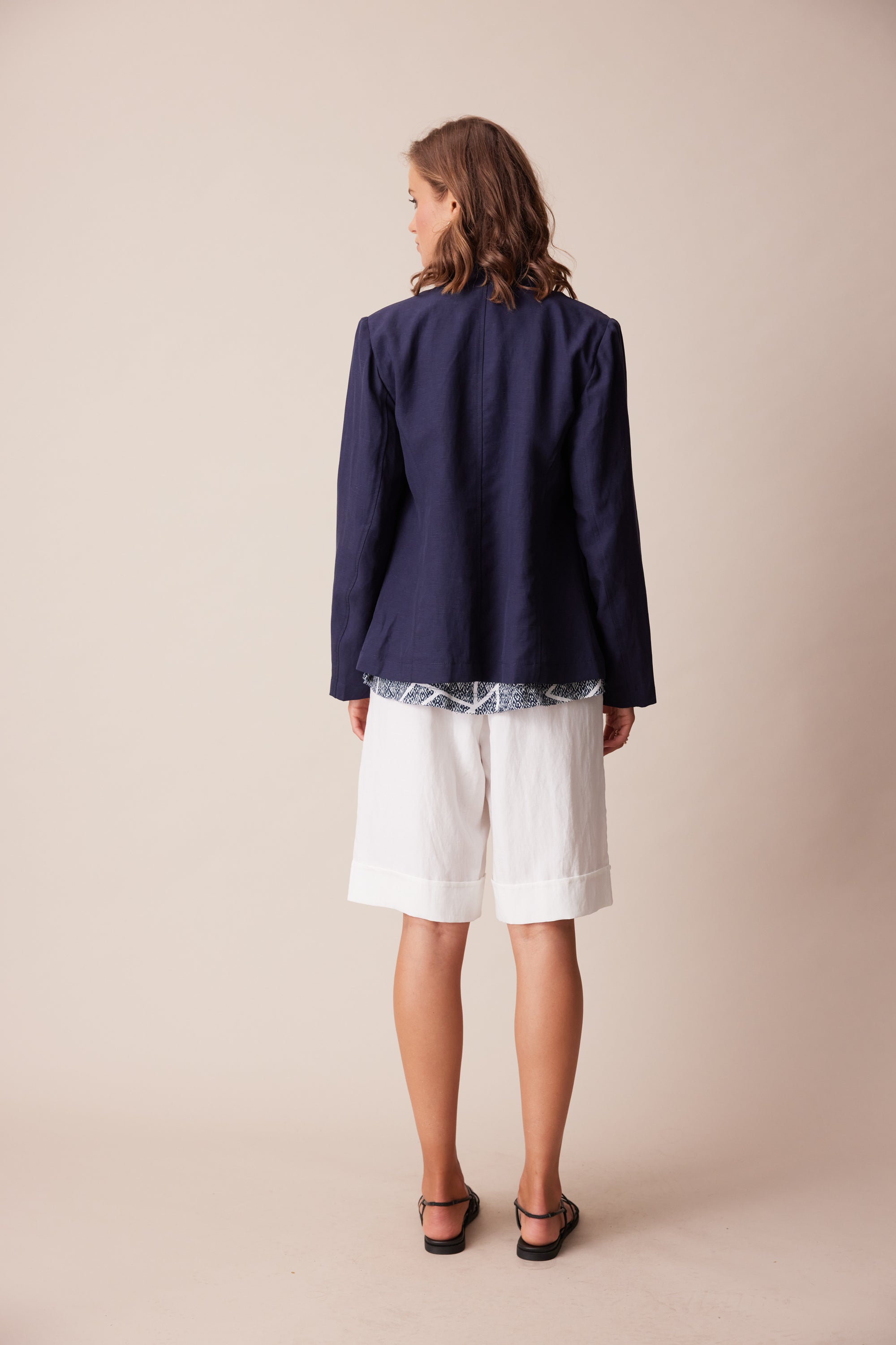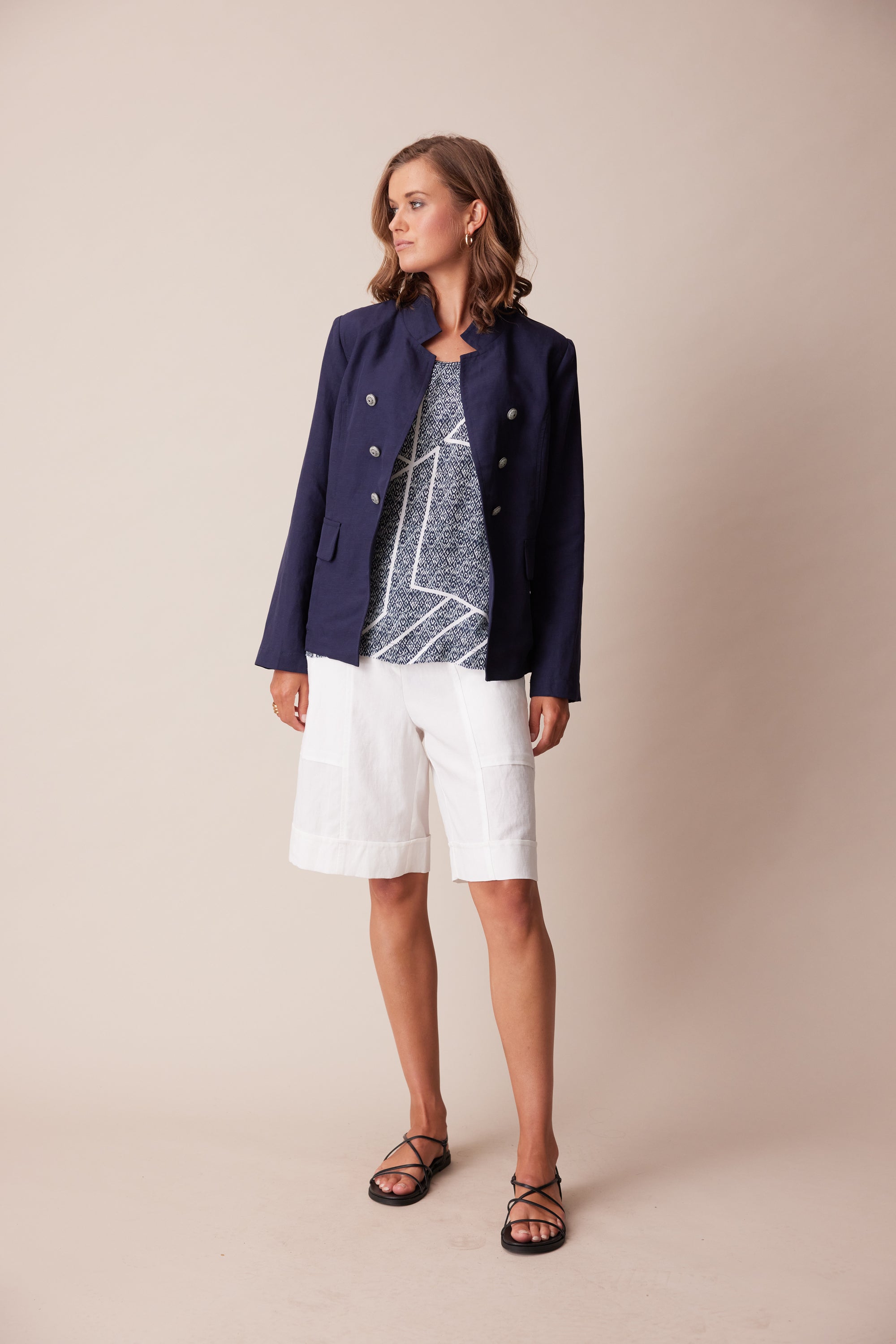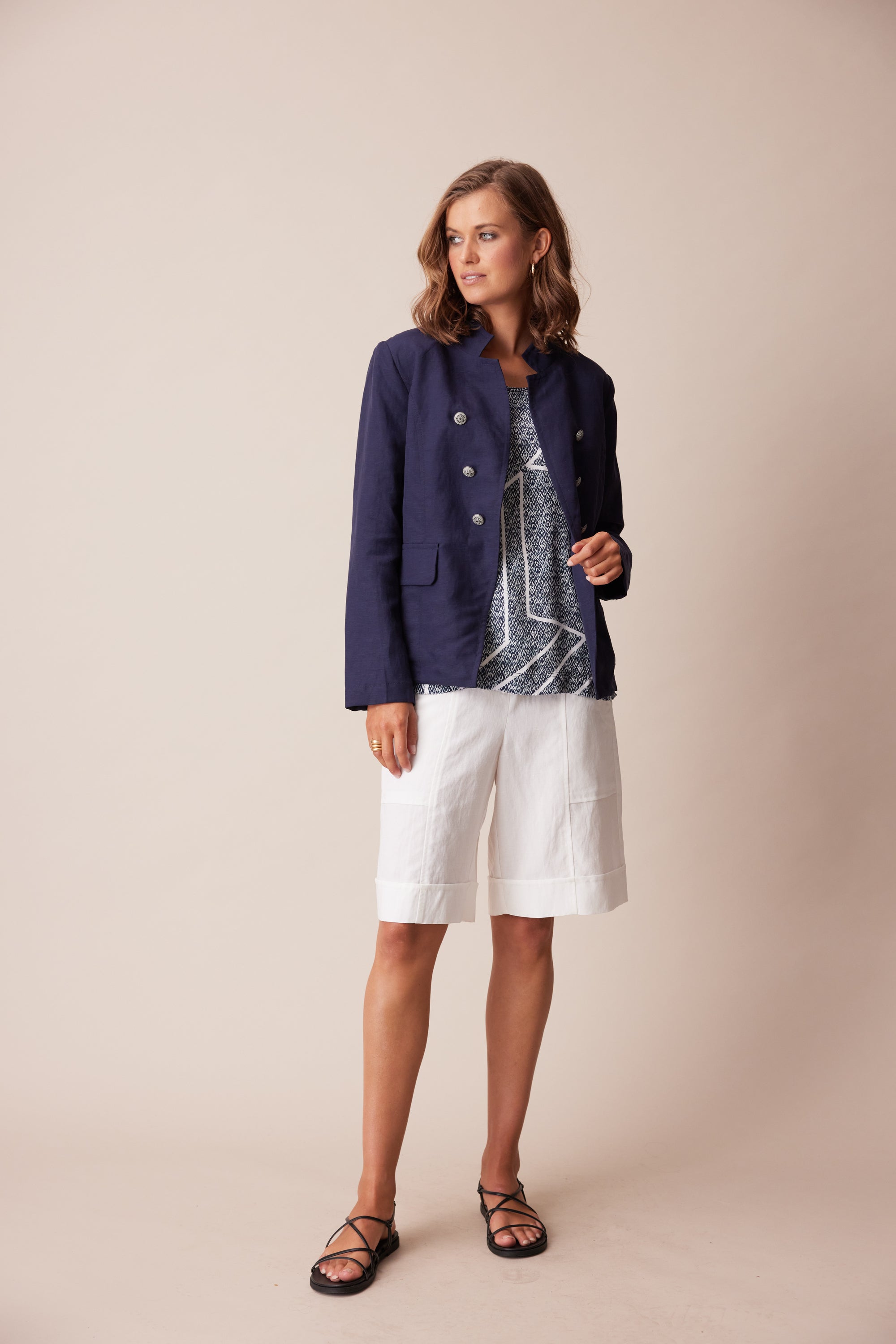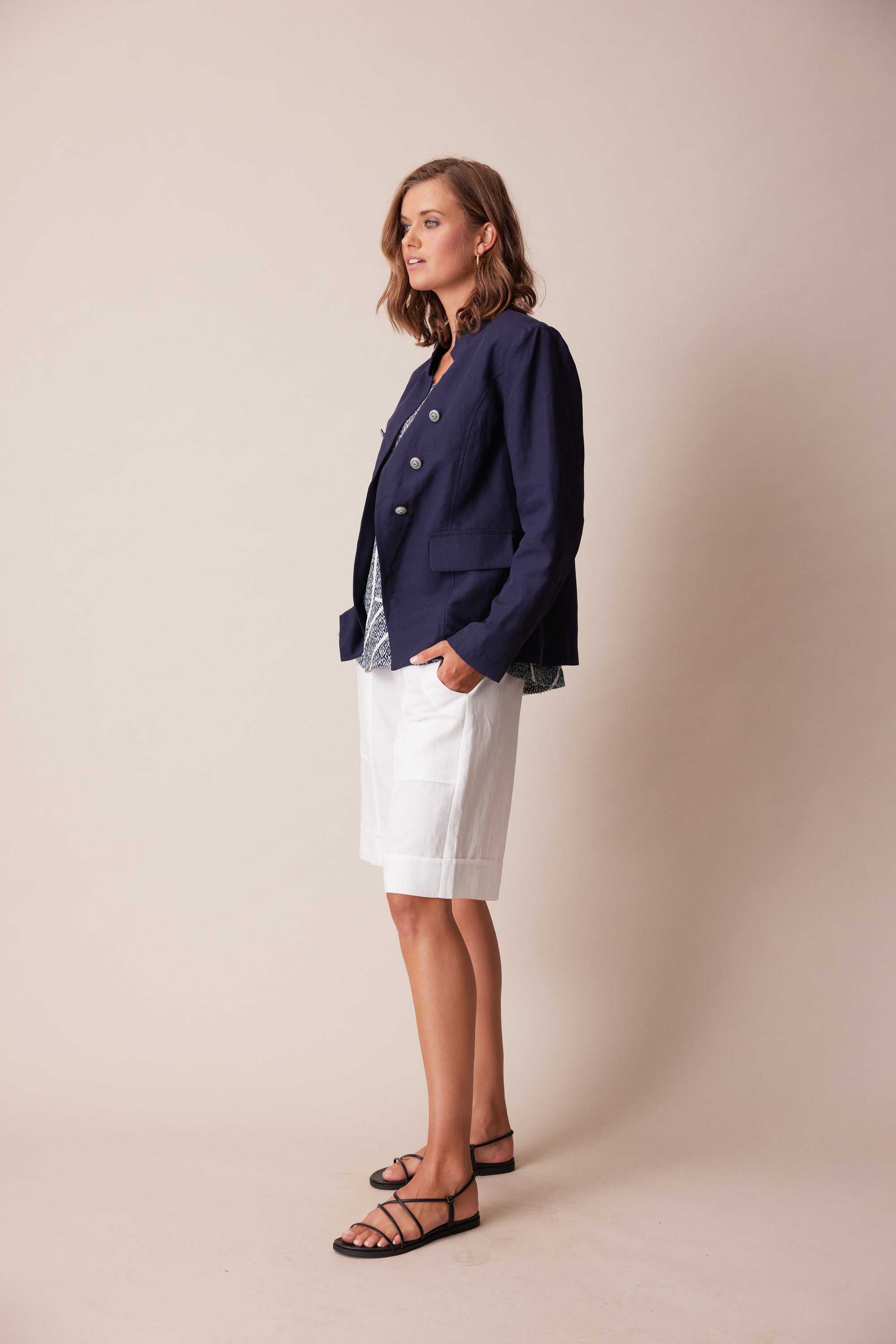 A tailored jacket with stand collar, faux flap pockets, topstitched seams and decorative crested shank buttons. Panel seams and a two-piece sleeve give this jacket a fitted silhouette. Wear as a suit with the Twin pant, or Twin Short.