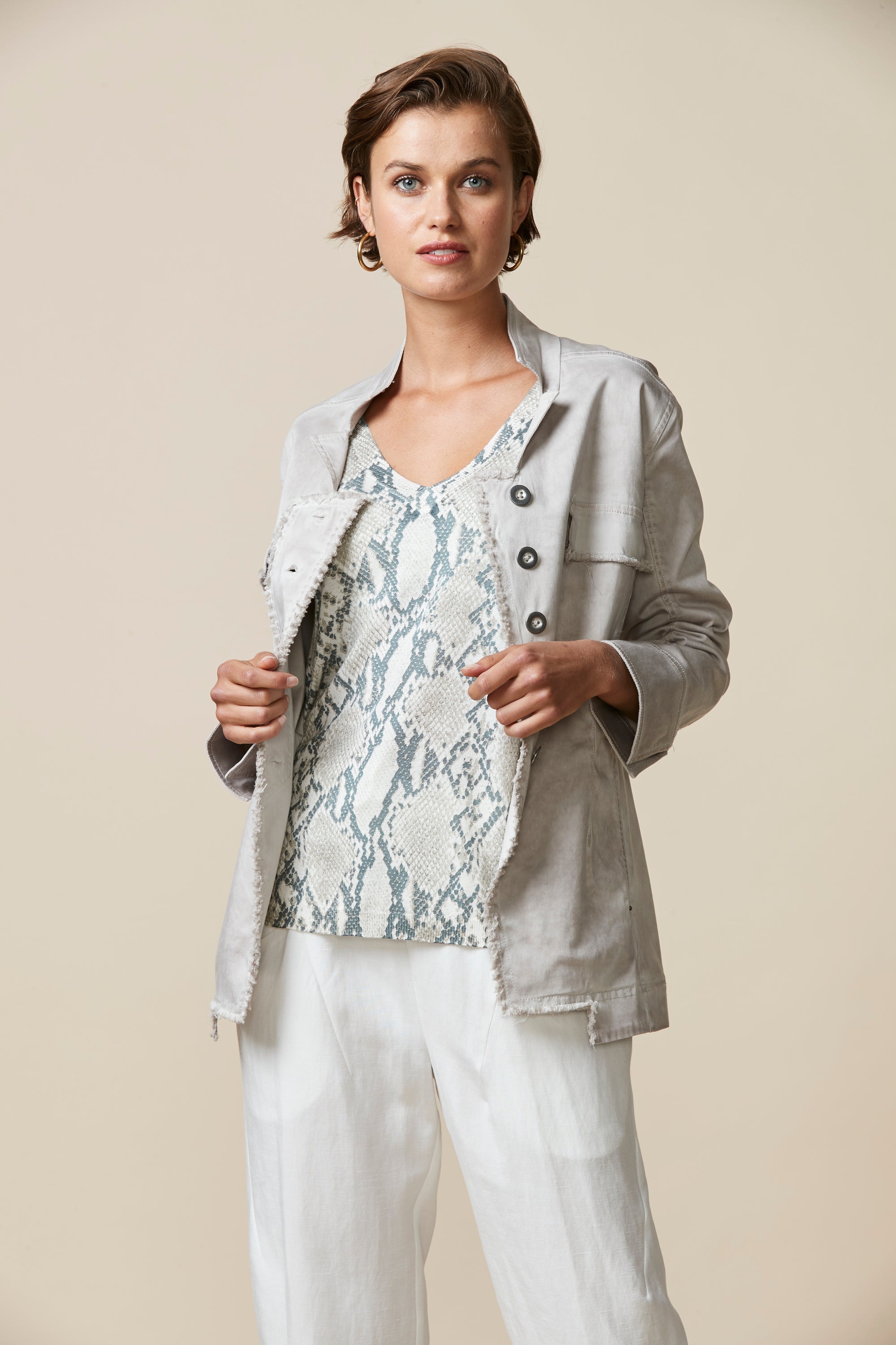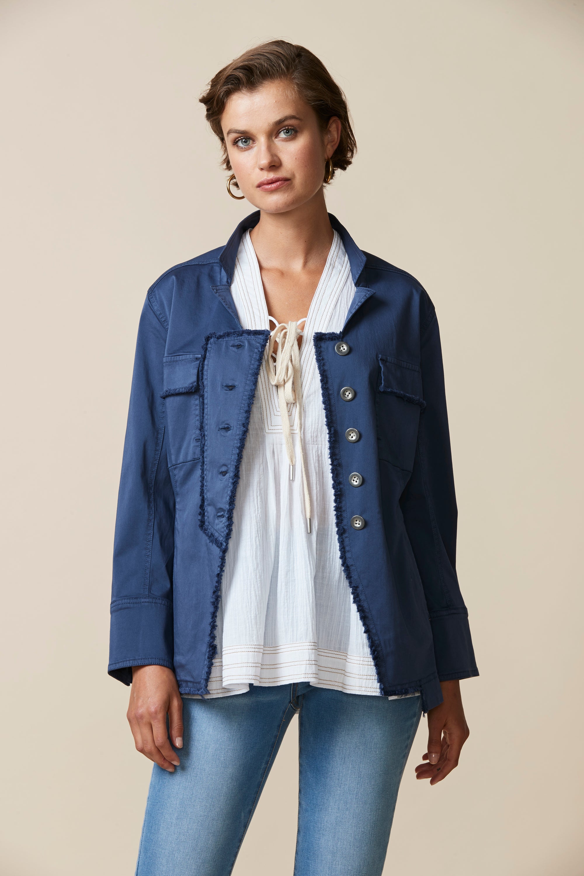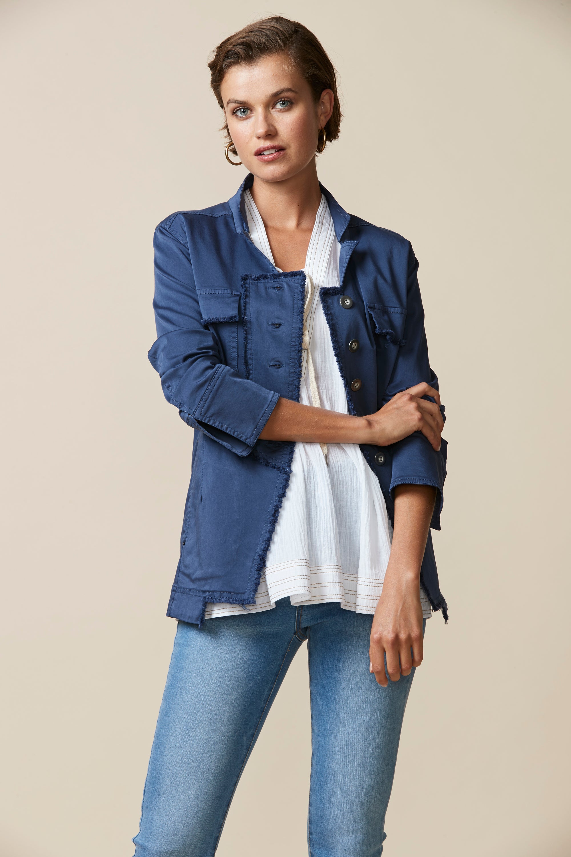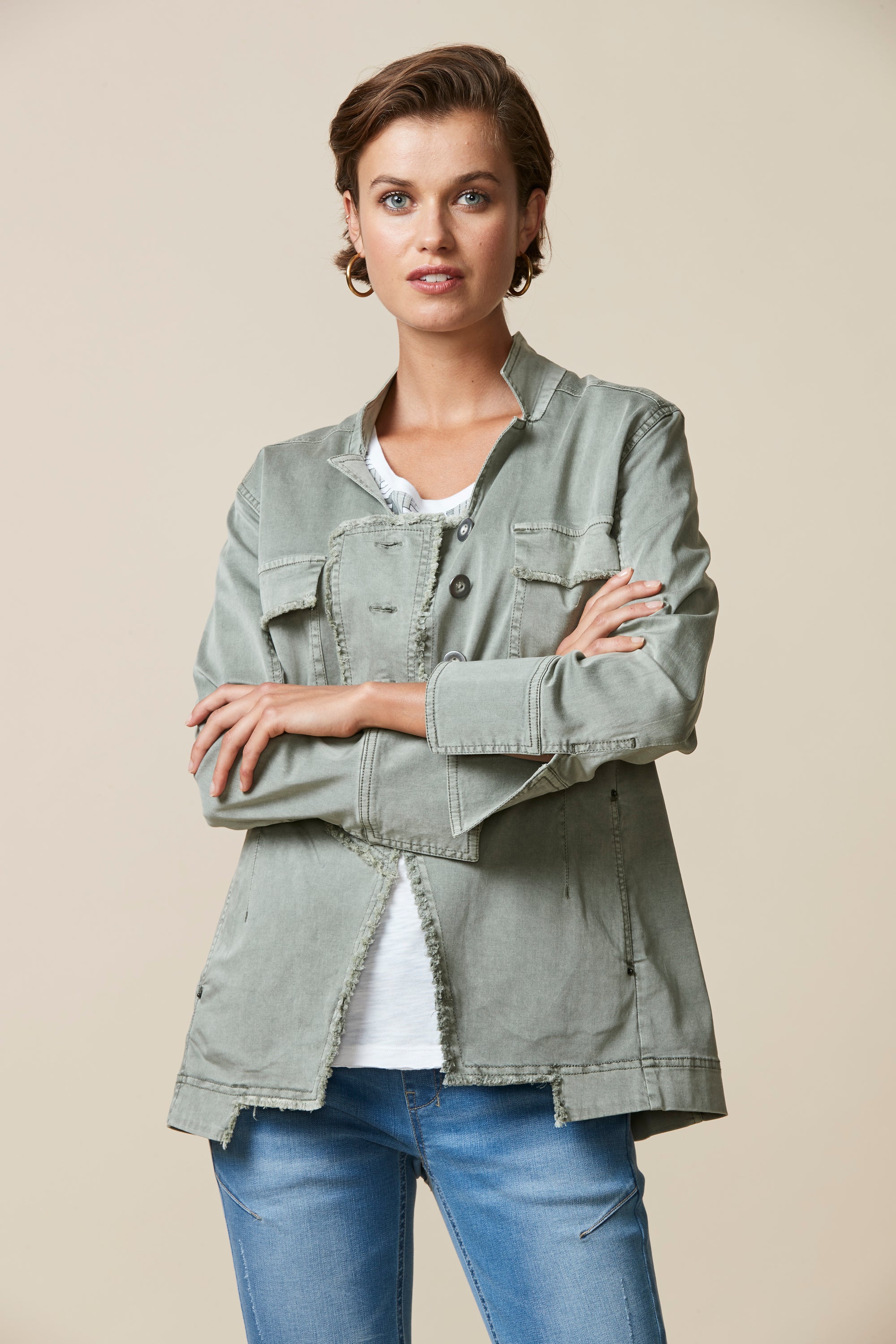 Soft cotton modal jacket with stand up collar & frayed detailing around front placket edge. The soft handle and slightly distressed finish is achieved by special garment wash.