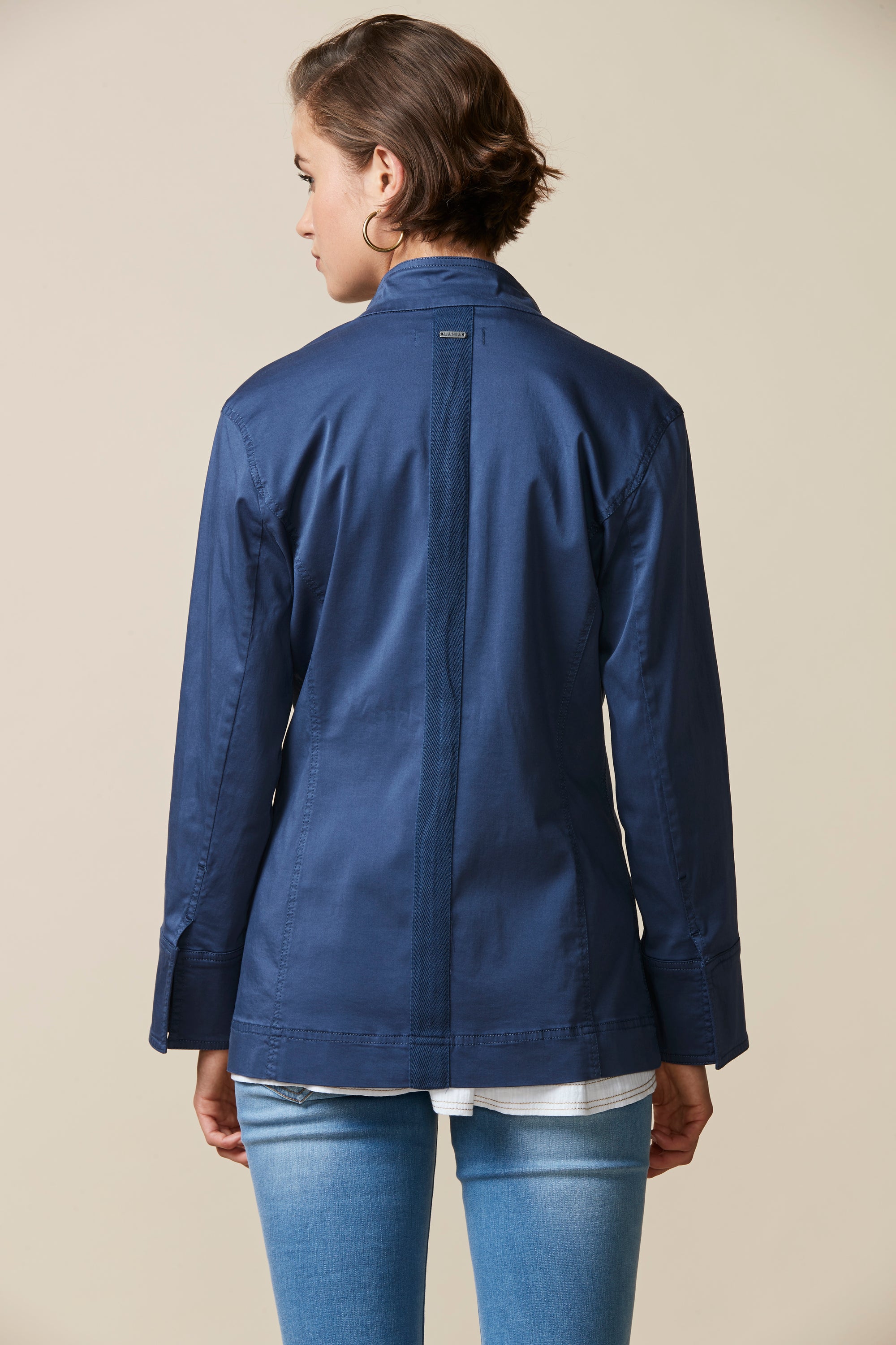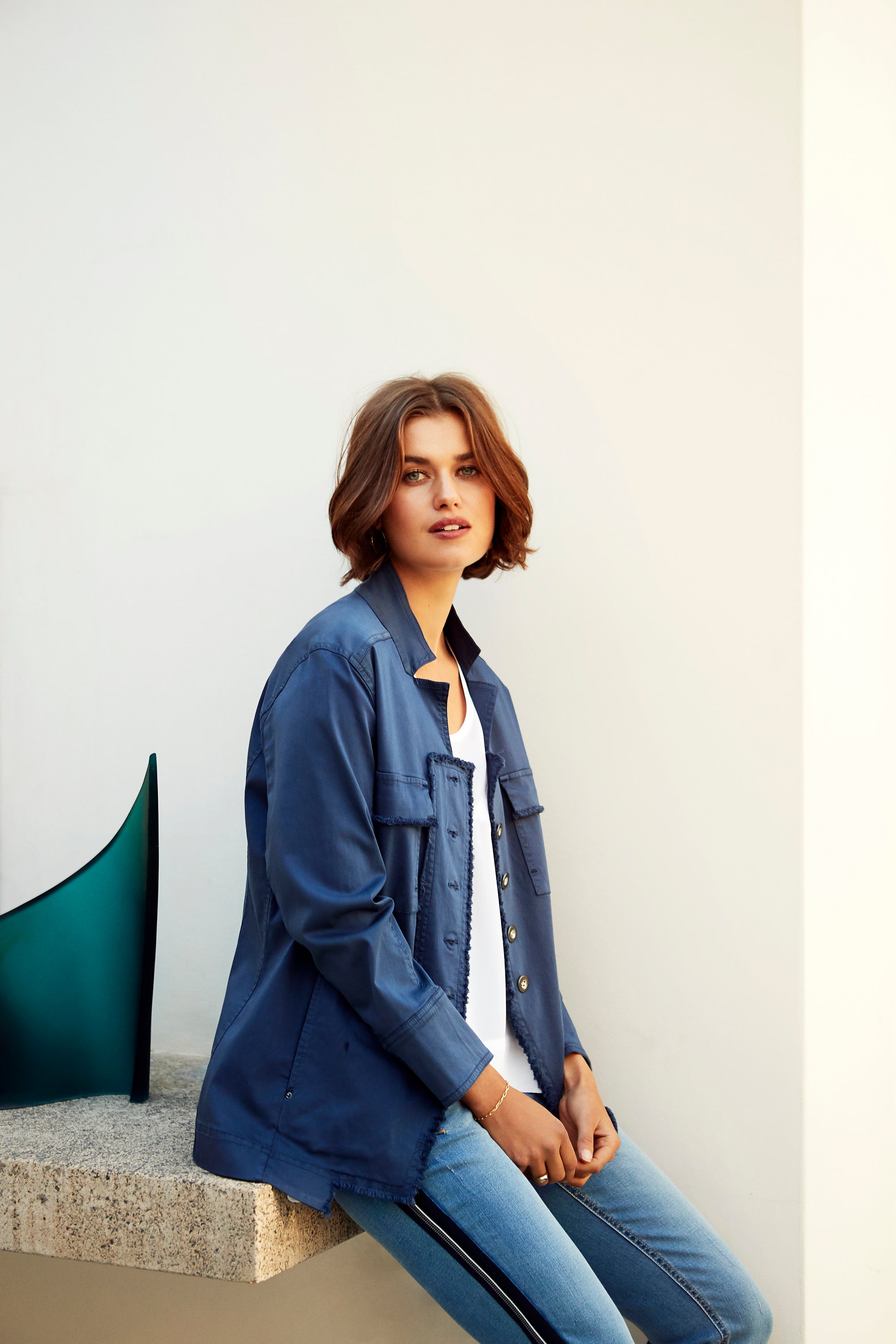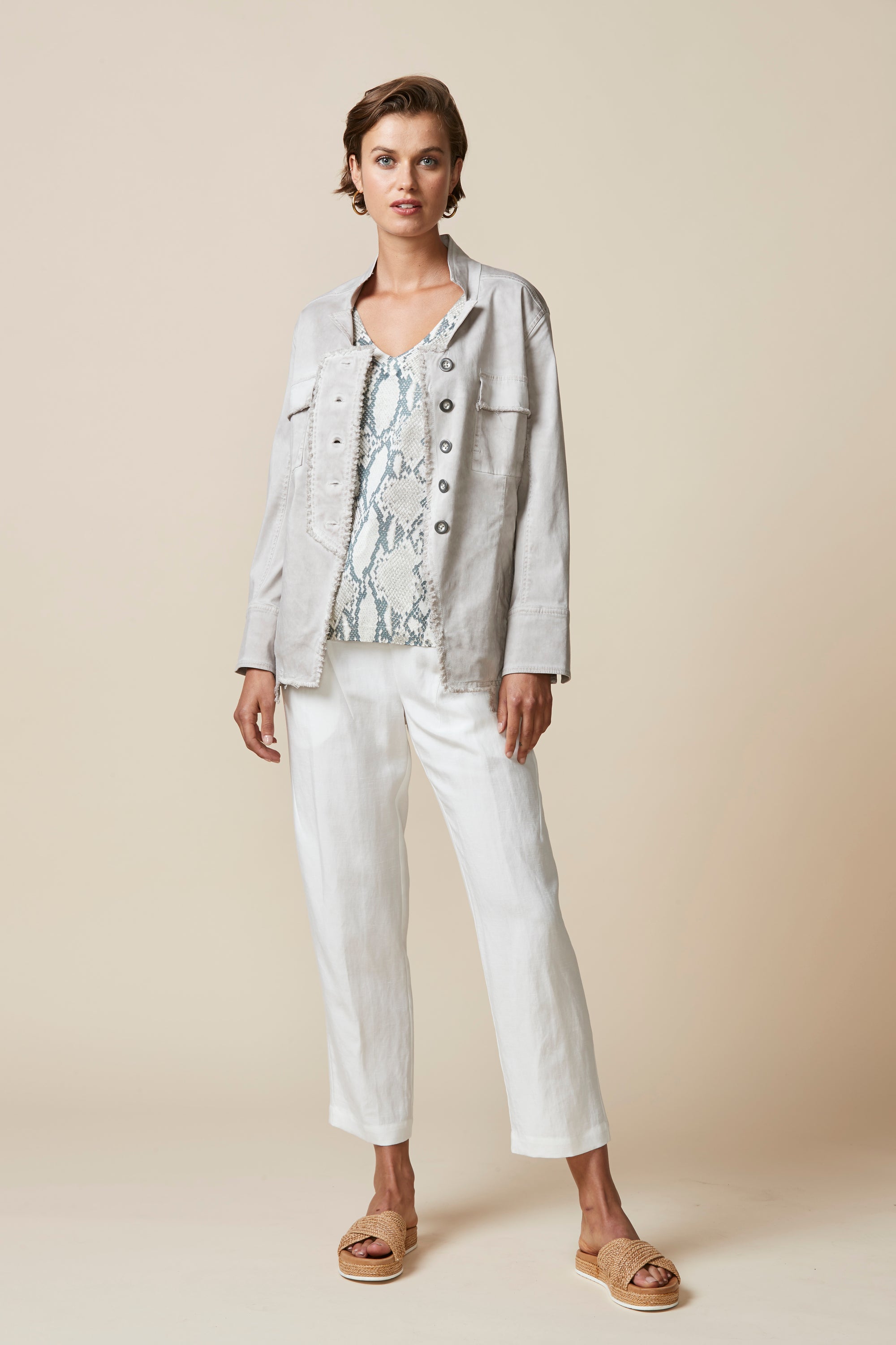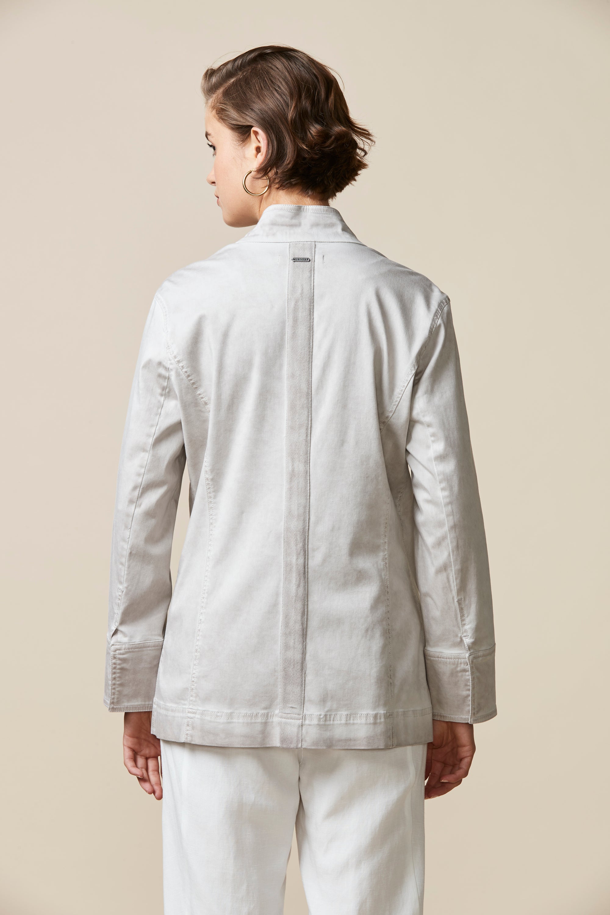 Soft cotton modal jacket with stand up collar & frayed detailing around front placket edge. The soft handle and slightly distressed finish is achieved by special garment wash.