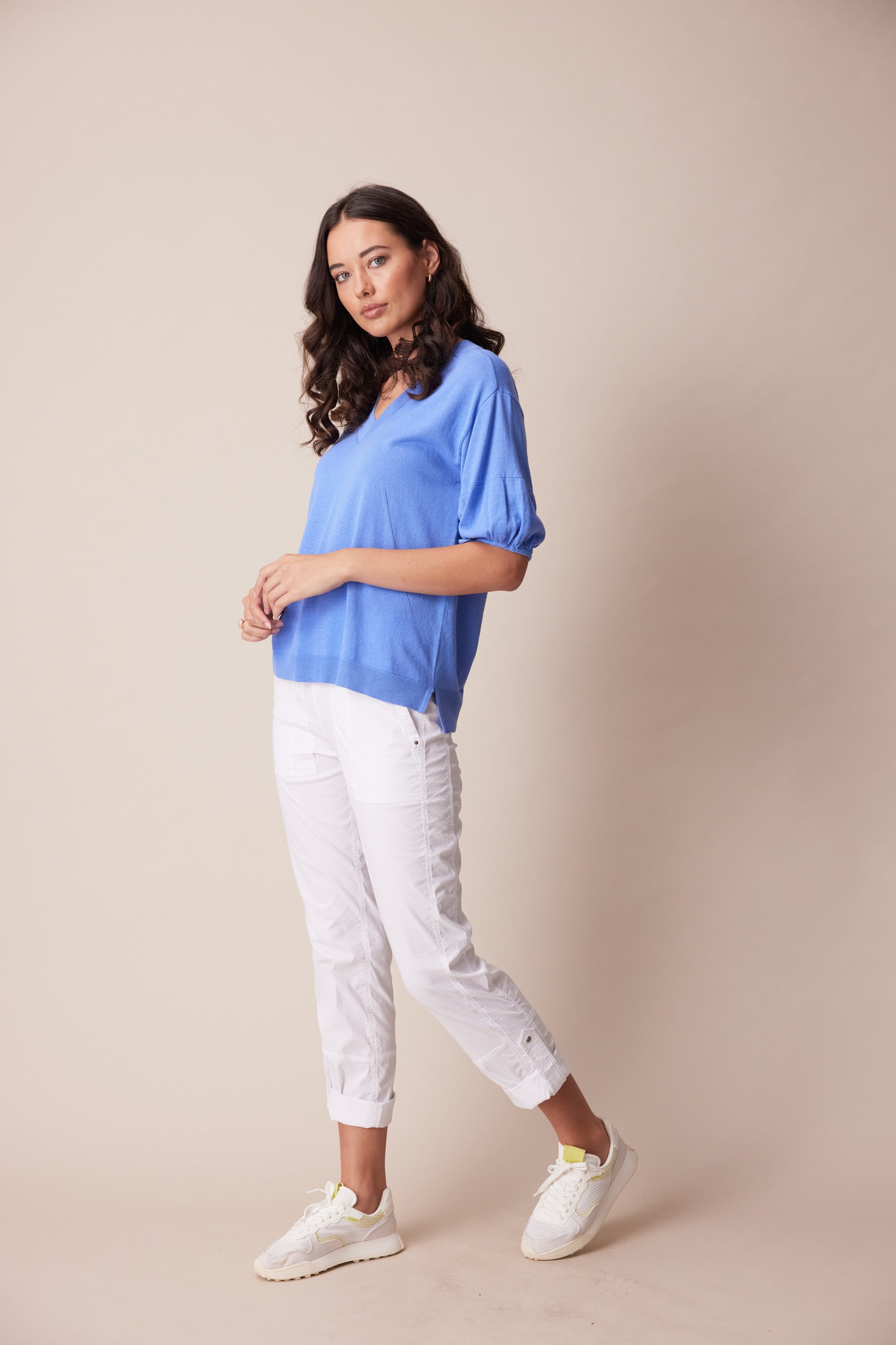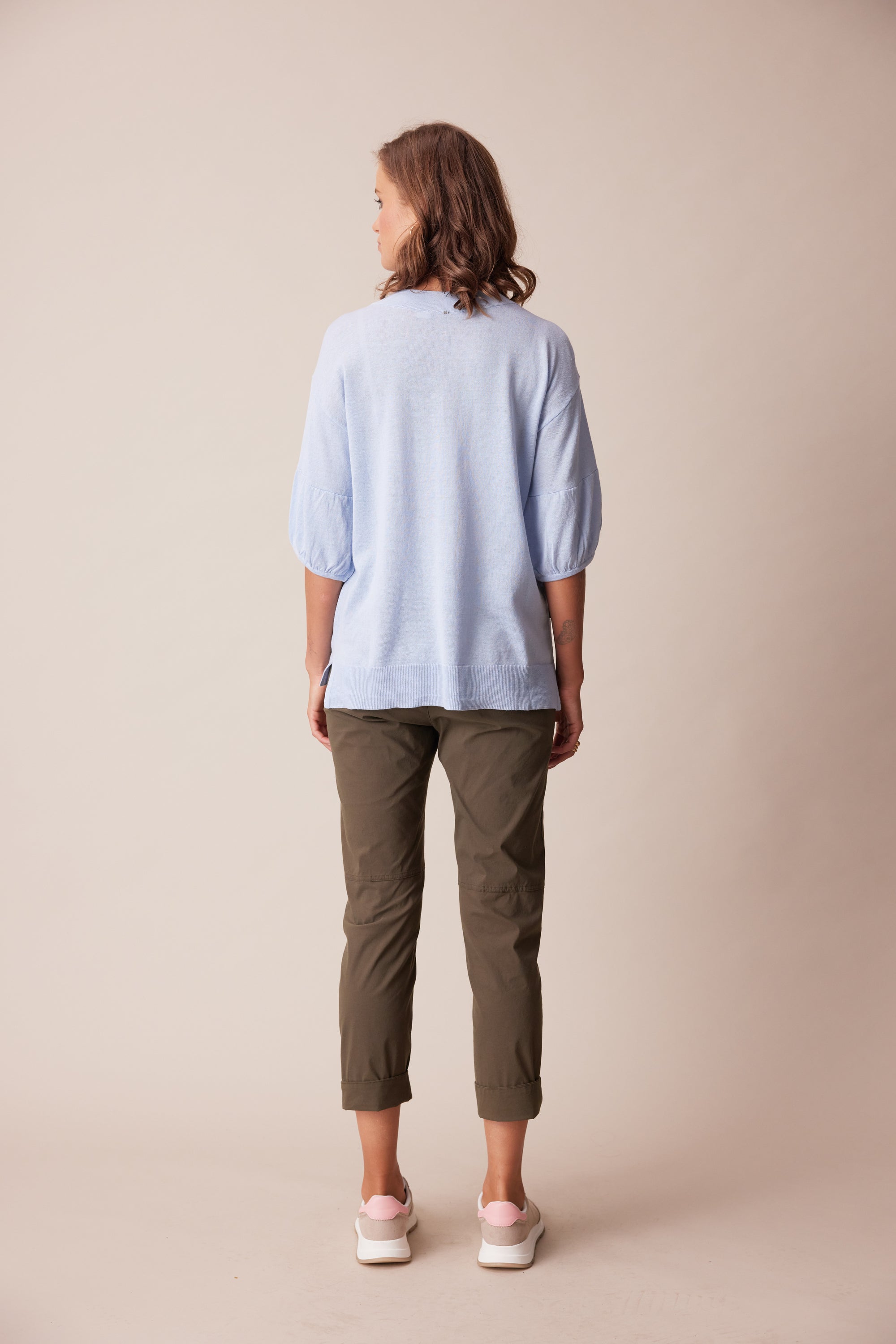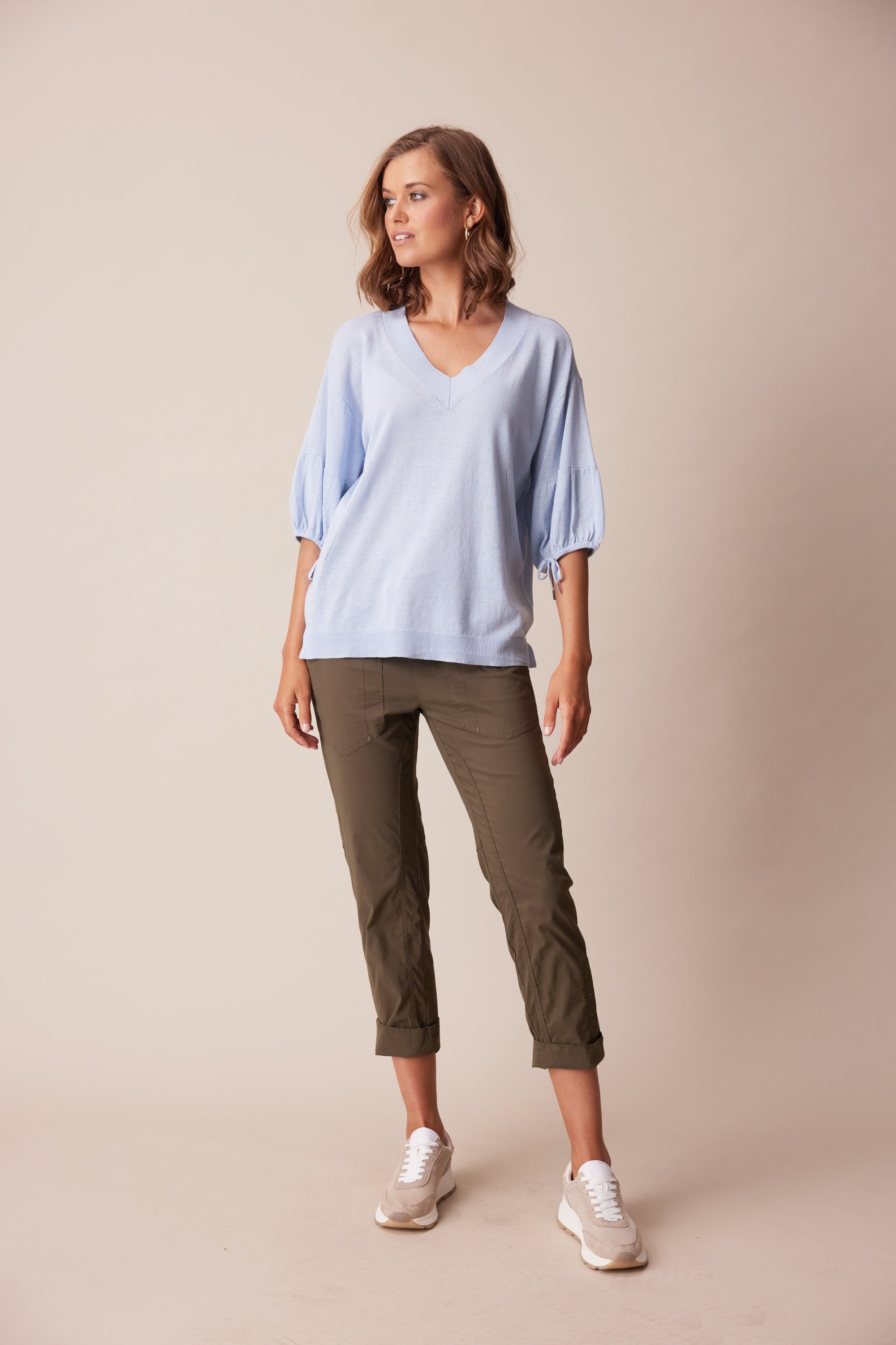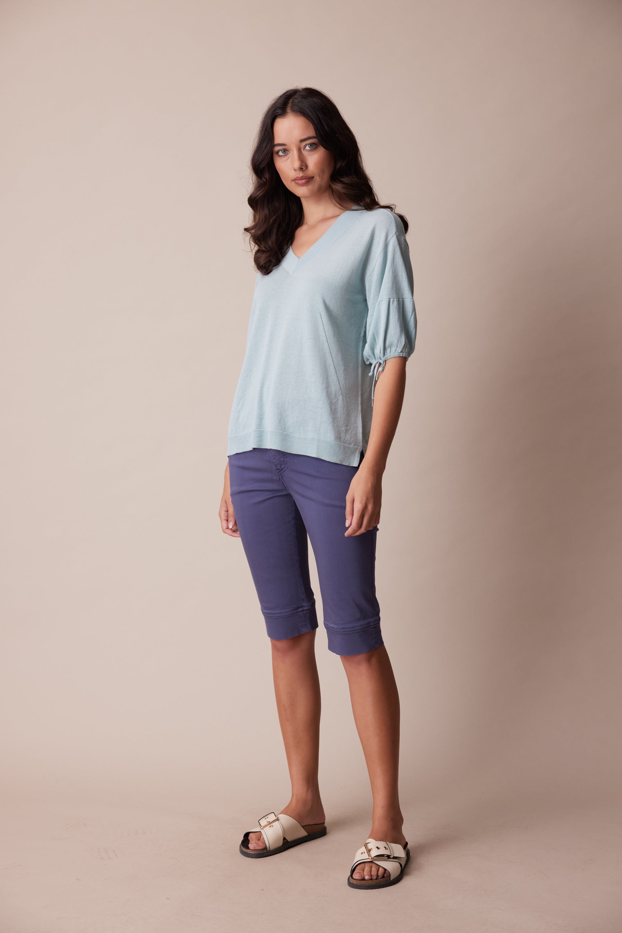 A soft and lightweight linen cotton knit sweater featuring a deep v-neck, pointelle detailing, and soft puff sleeves with adjustable tie.
