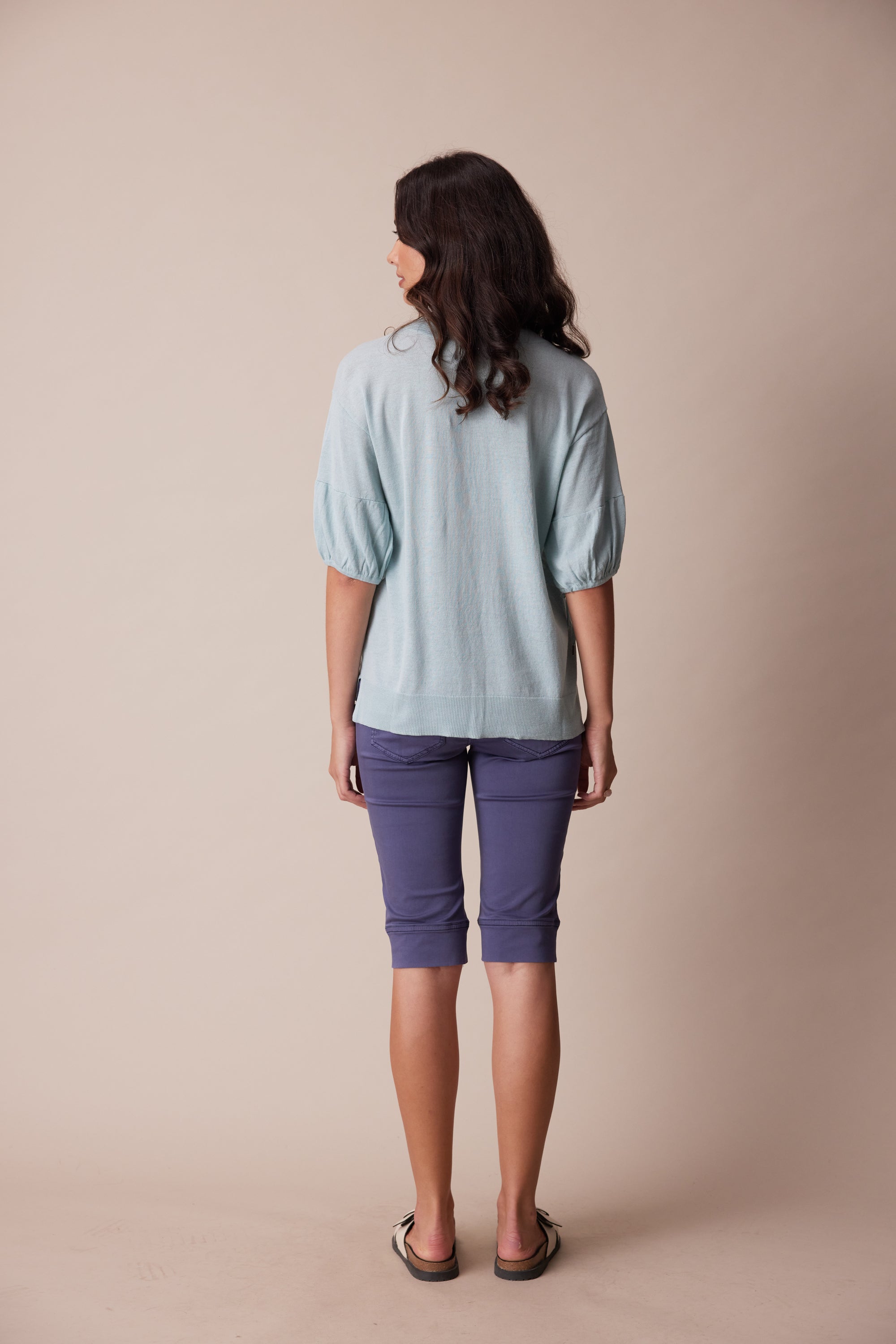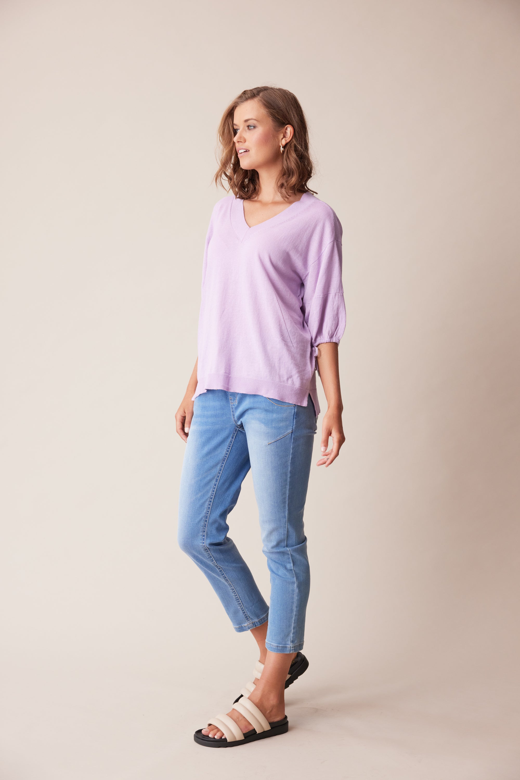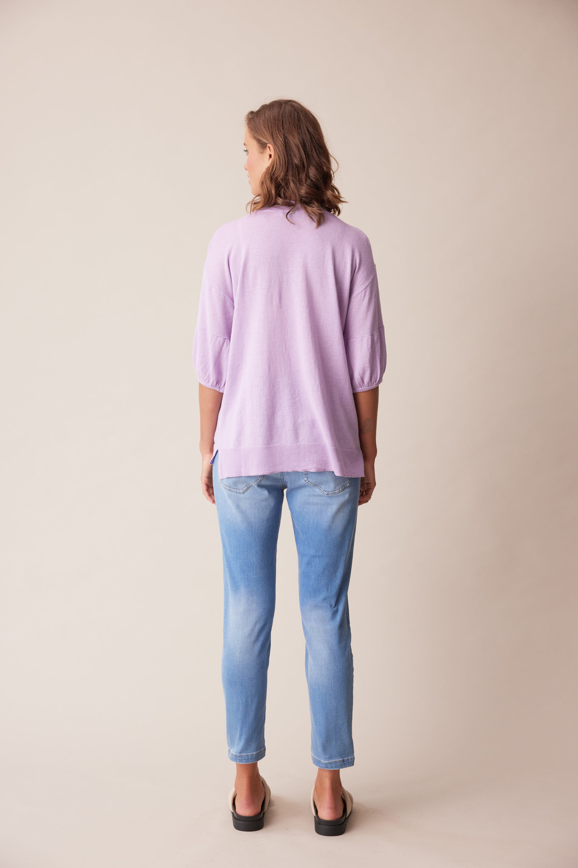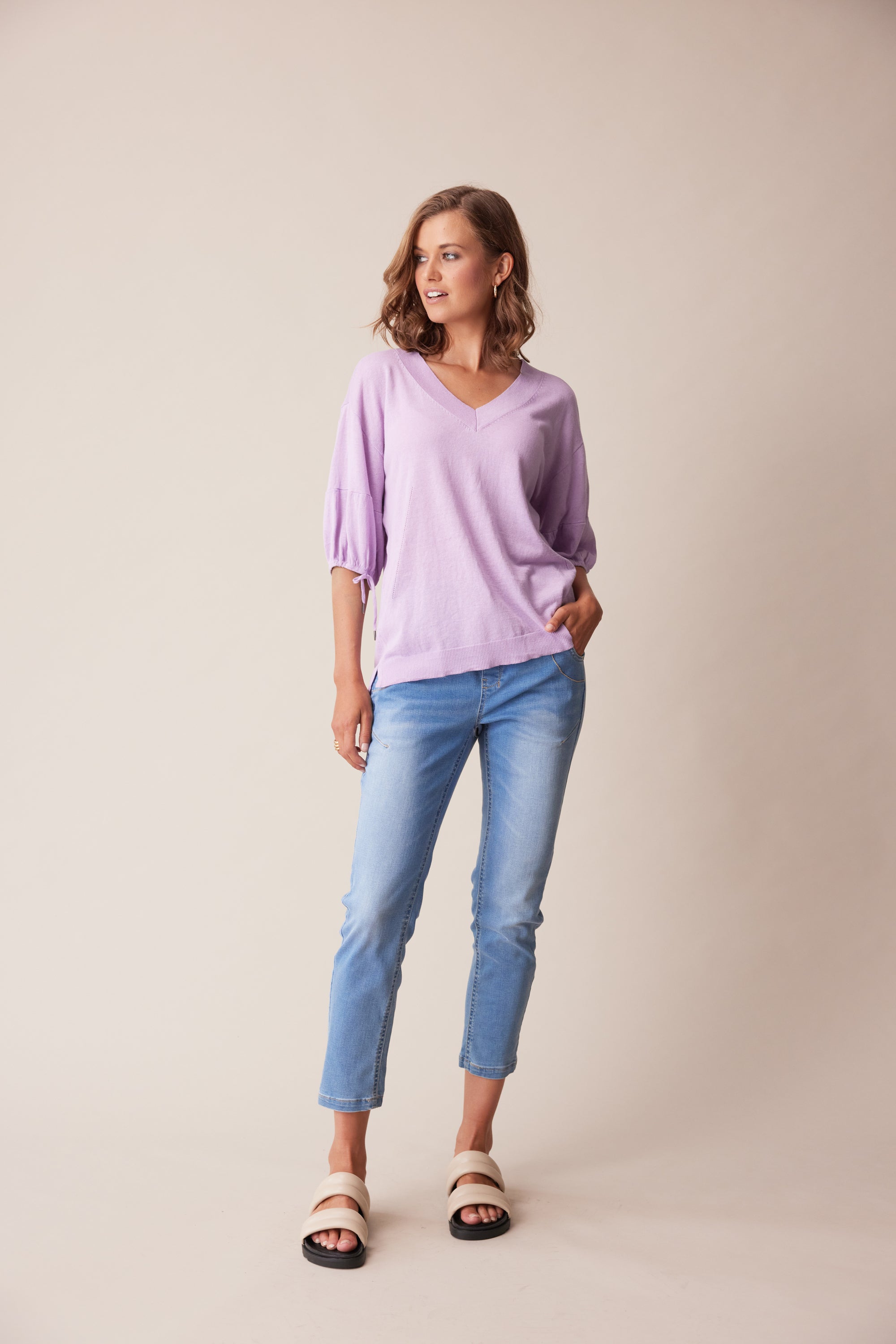 A soft and lightweight linen cotton knit sweater featuring a deep v-neck, pointelle detailing, and soft puff sleeves with adjustable tie.