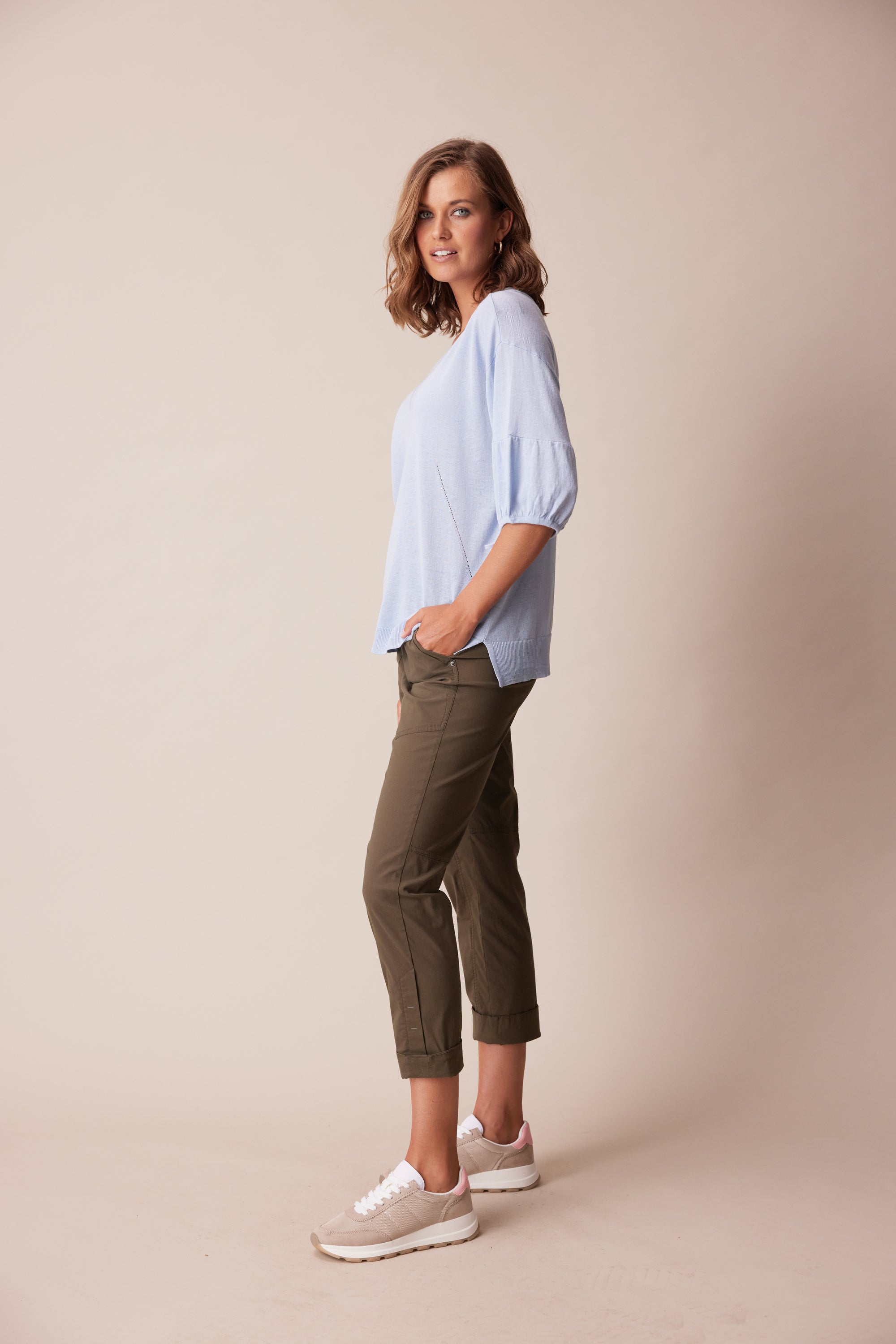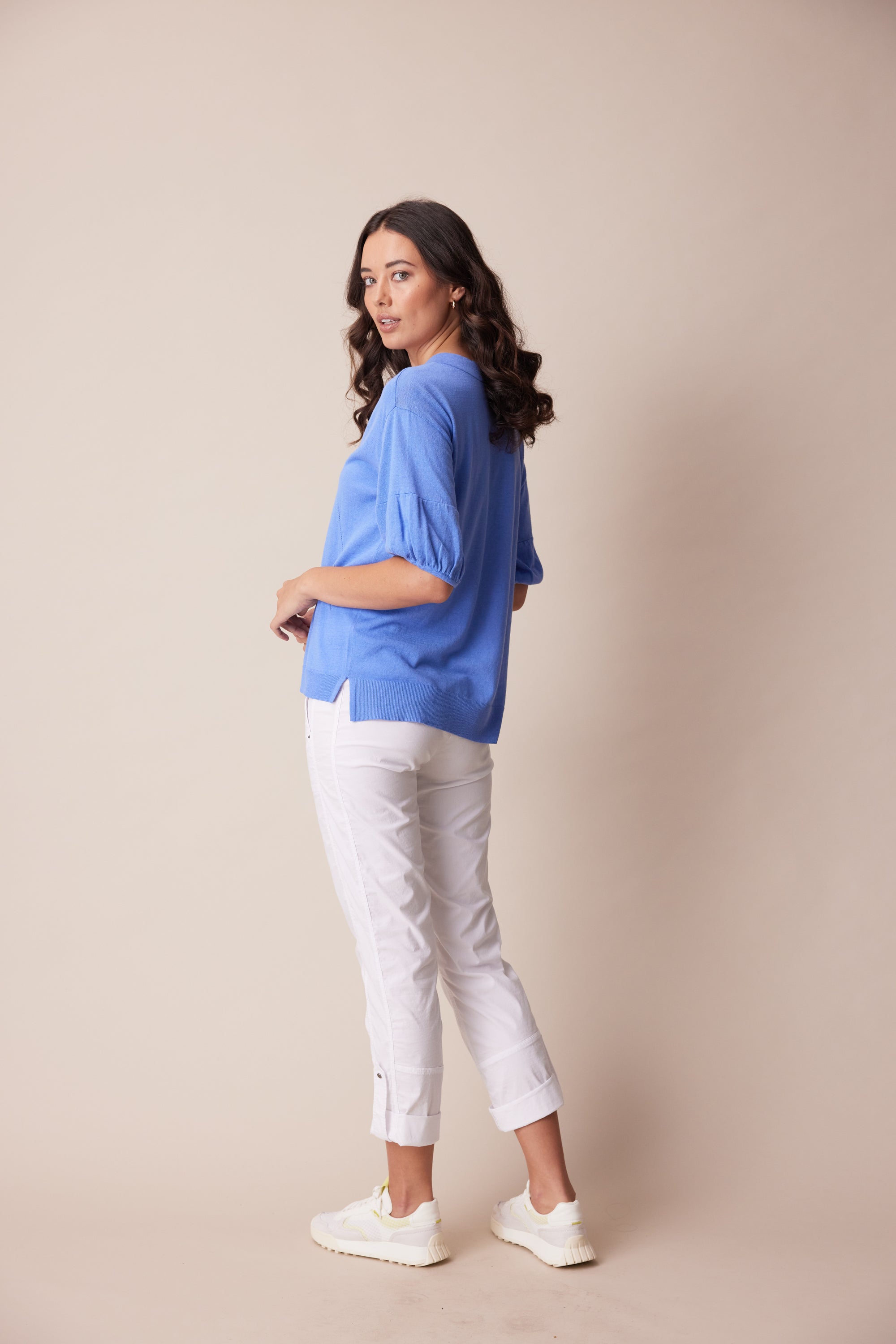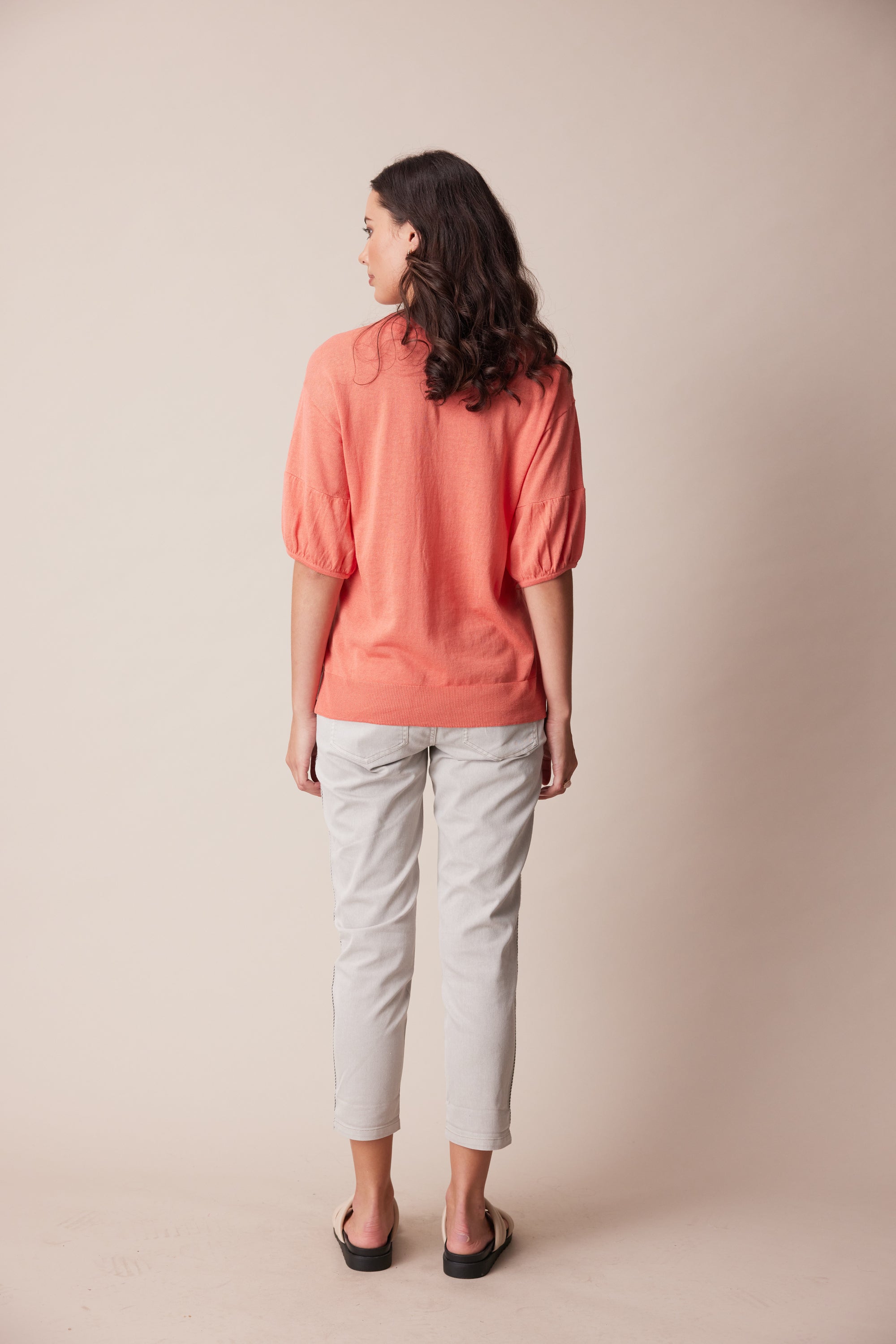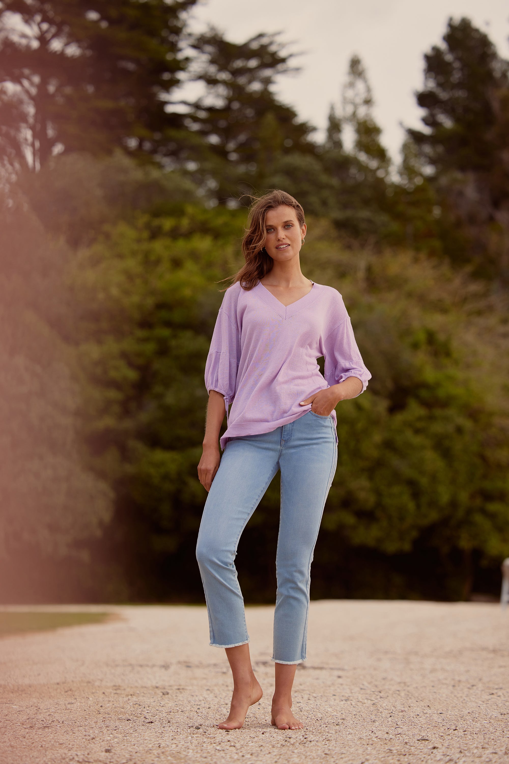 A soft and lightweight linen cotton knit sweater featuring a deep v-neck, pointelle detailing, and soft puff sleeves with adjustable tie.