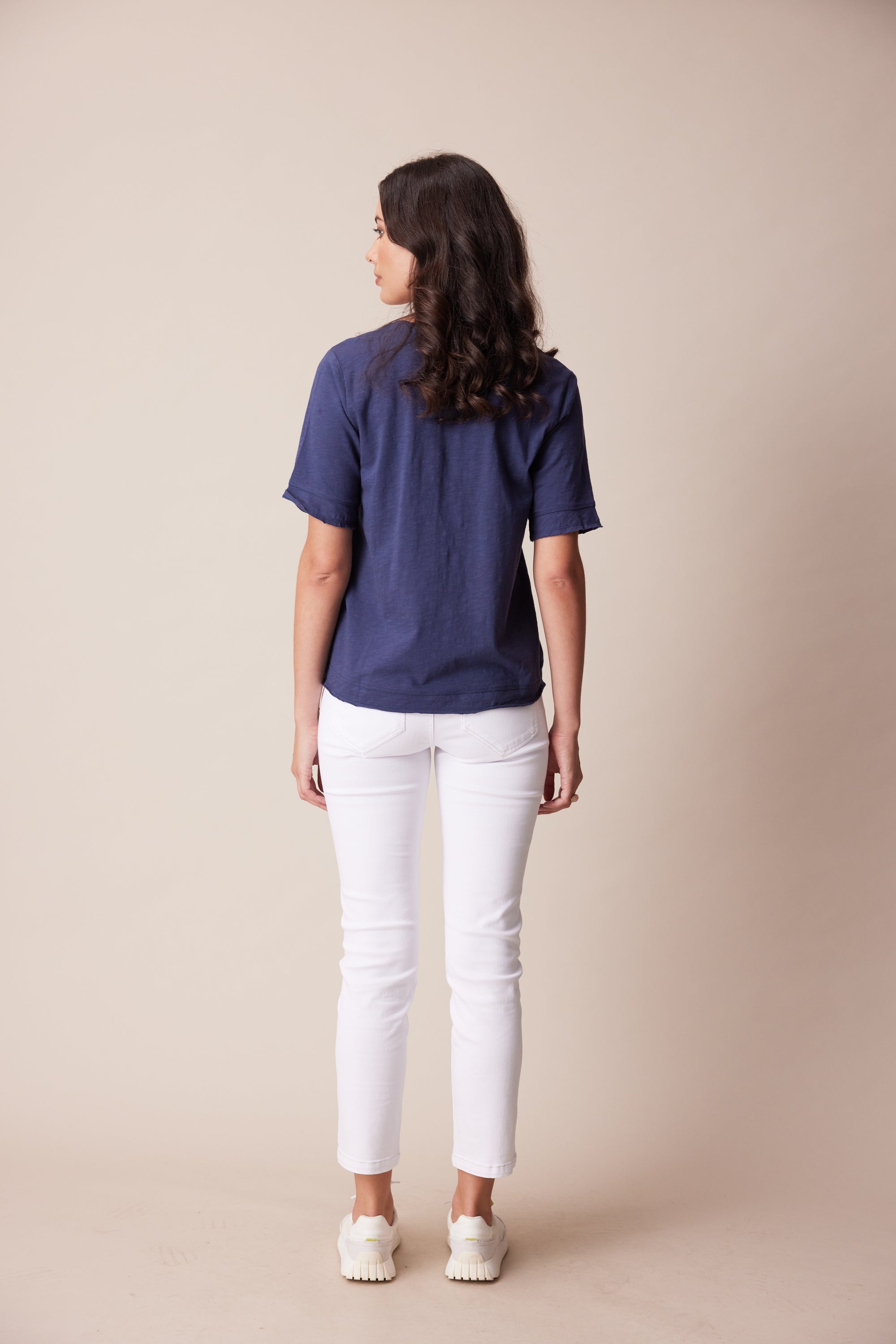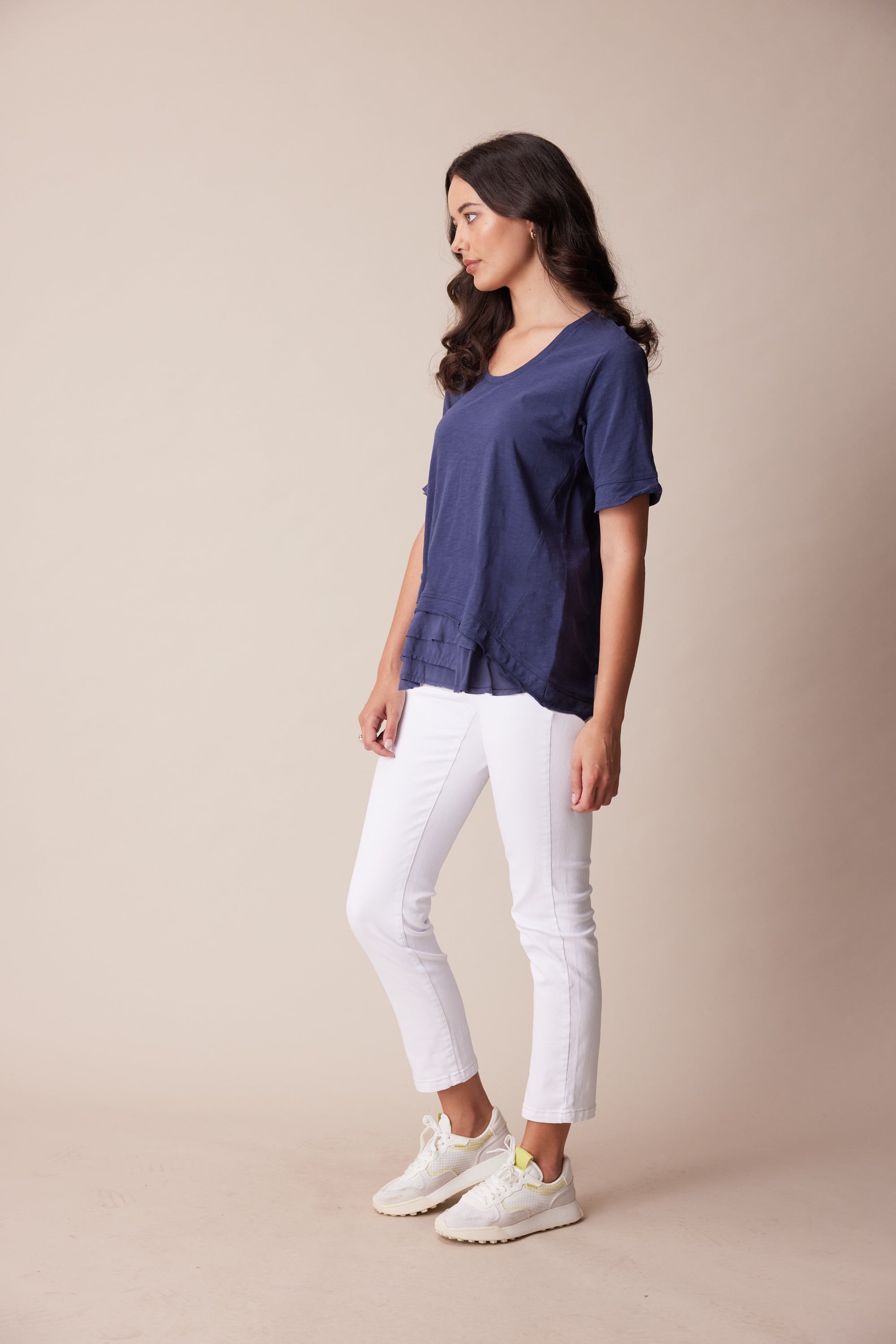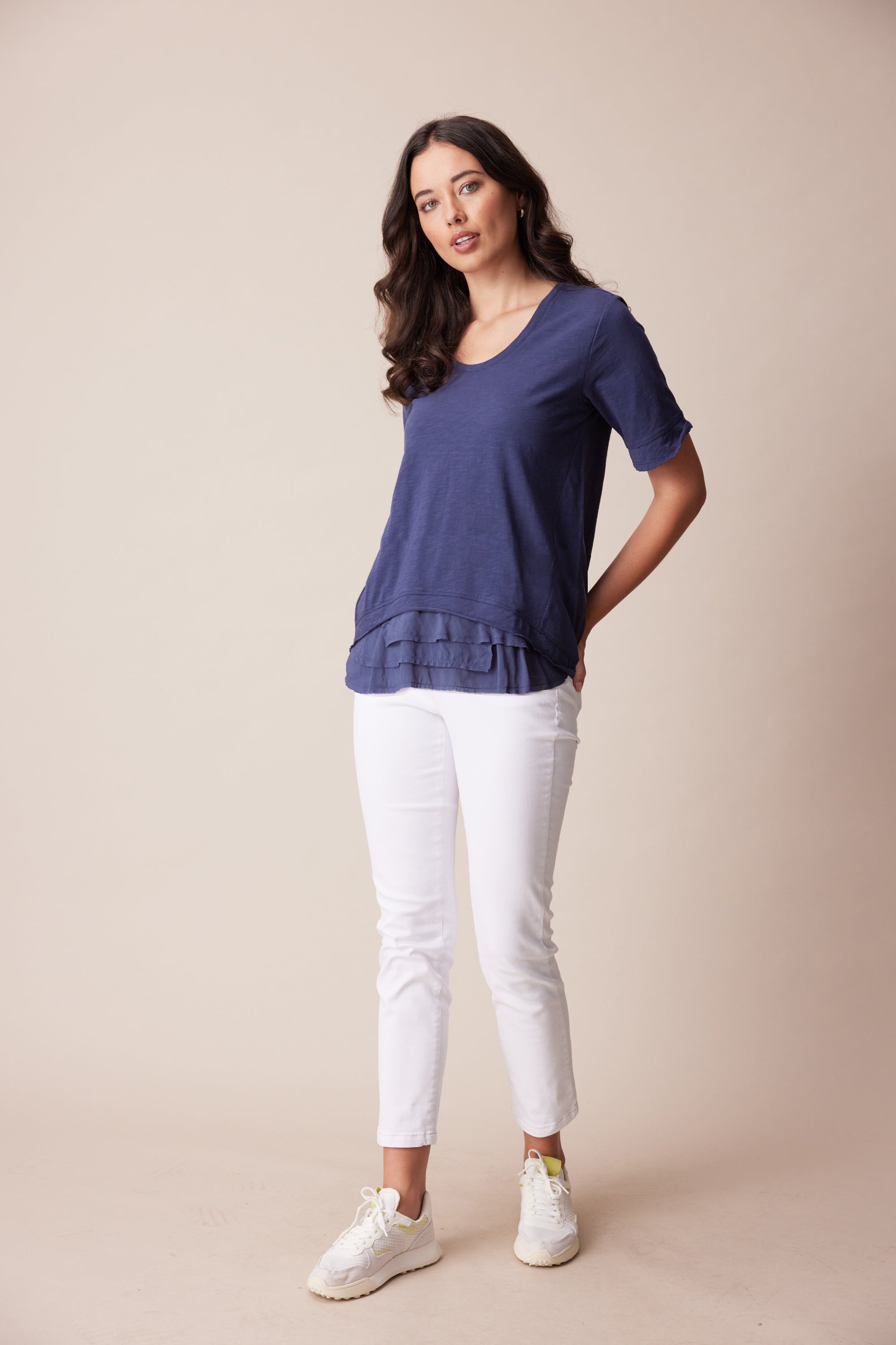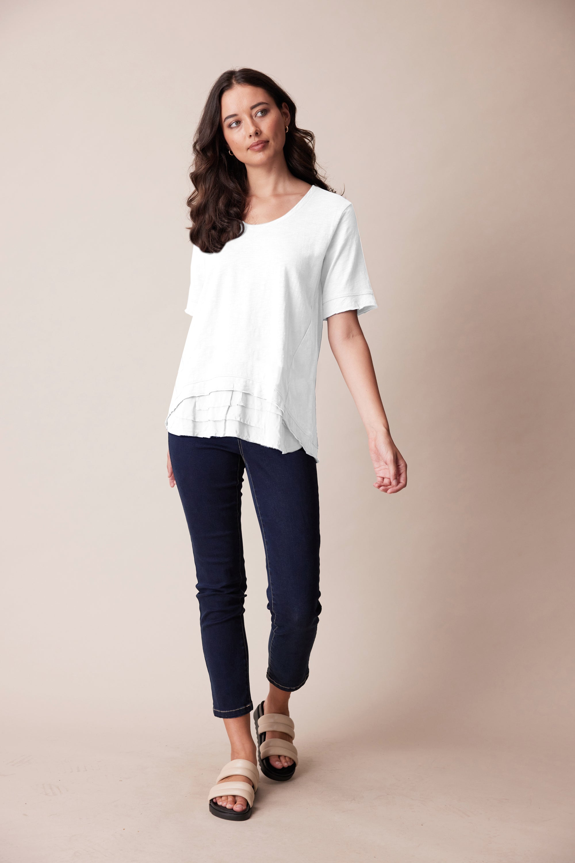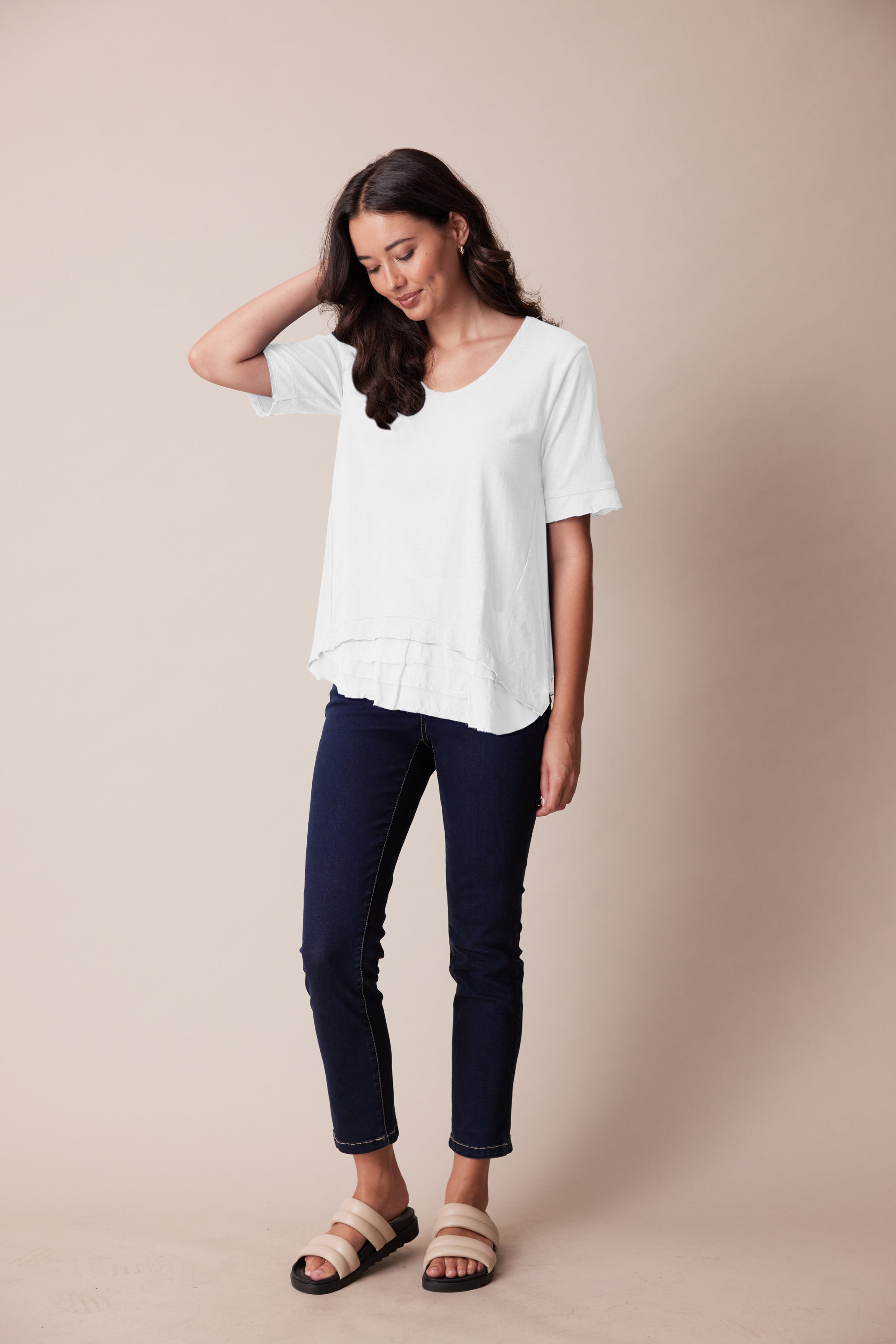 A feminine A-line tee featuring angled side seams, a flattering scoop neck and layered front hem detailing. Elevate your favourite pair of jeans with this elegant off-duty style.