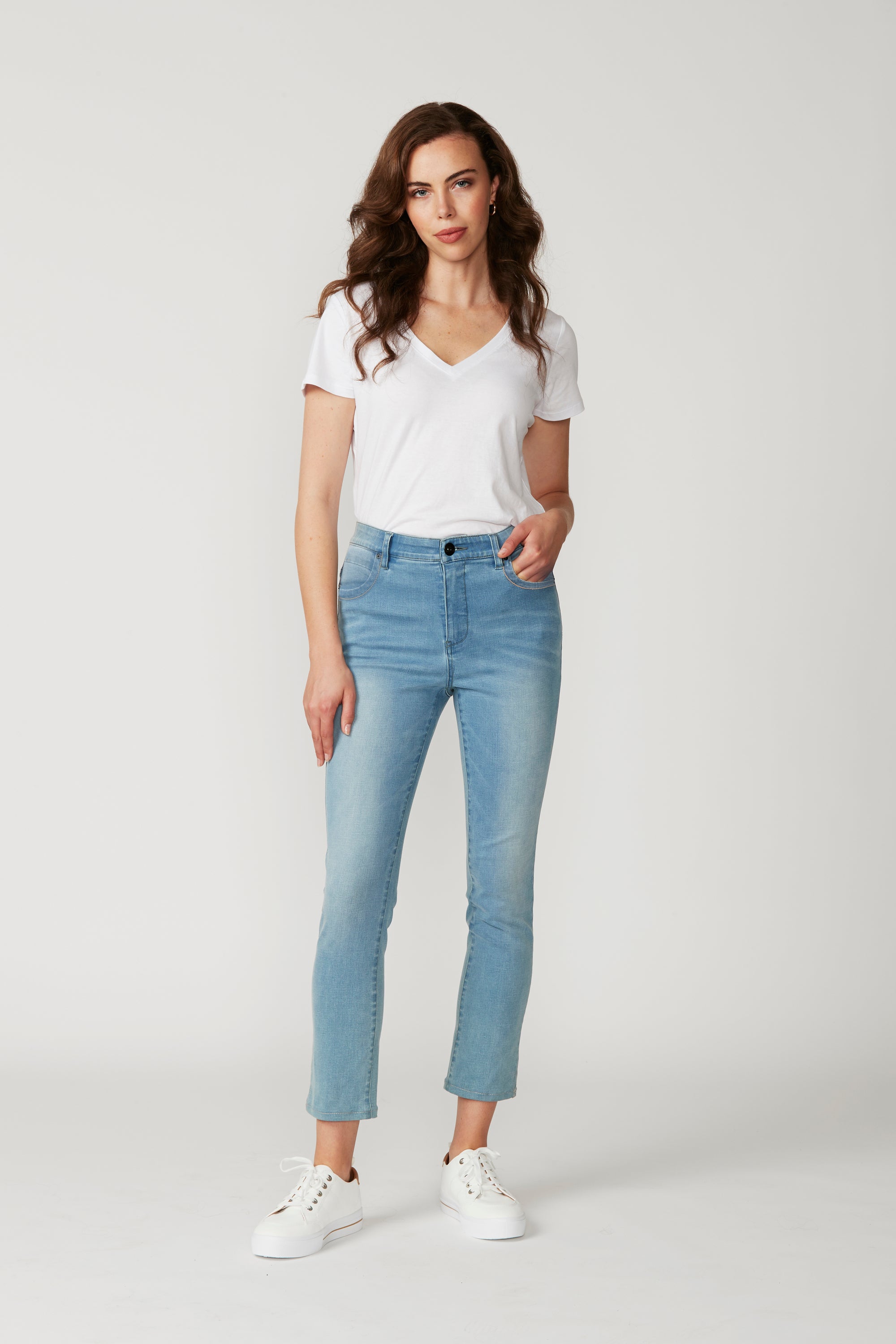 Our new five-pocket mid-rise jean in a super stretchy denim featuring contrast embroidered stitching around pocket openings and our signature stretch waist construction for superior fit and comfort. 7/8 length, straight leg fit.