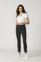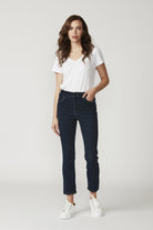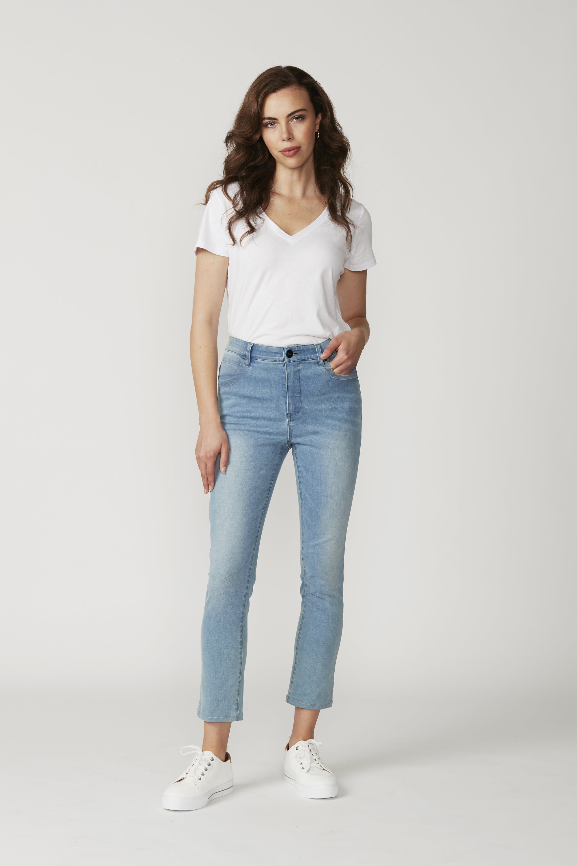 A five-pocket mid-rise jean in a super stretchy denim featuring contrast embroidered stitching around pocket openings and our signature stretch waist construction for superior fit and comfort. 7/8 length, straight leg fit.
