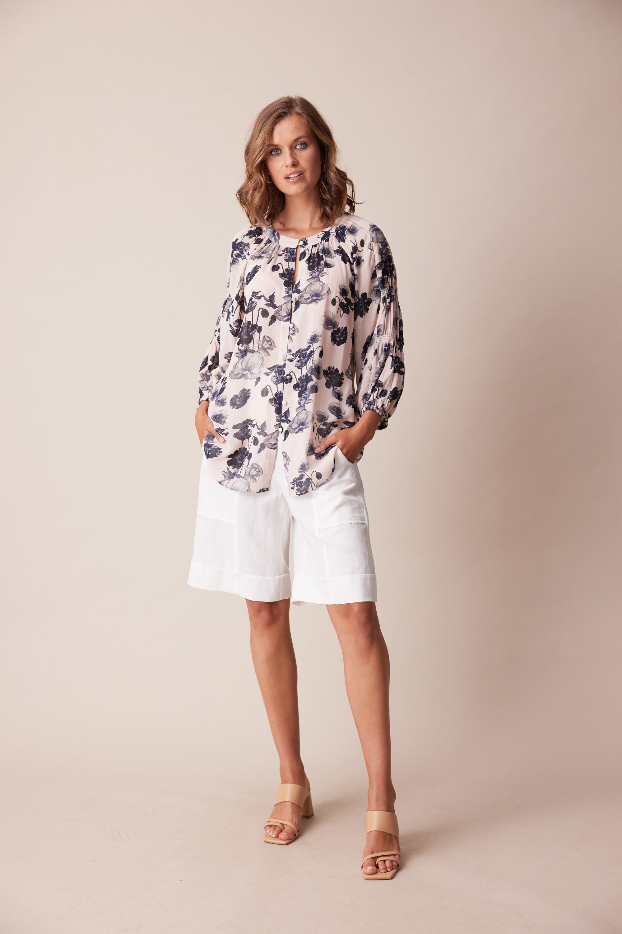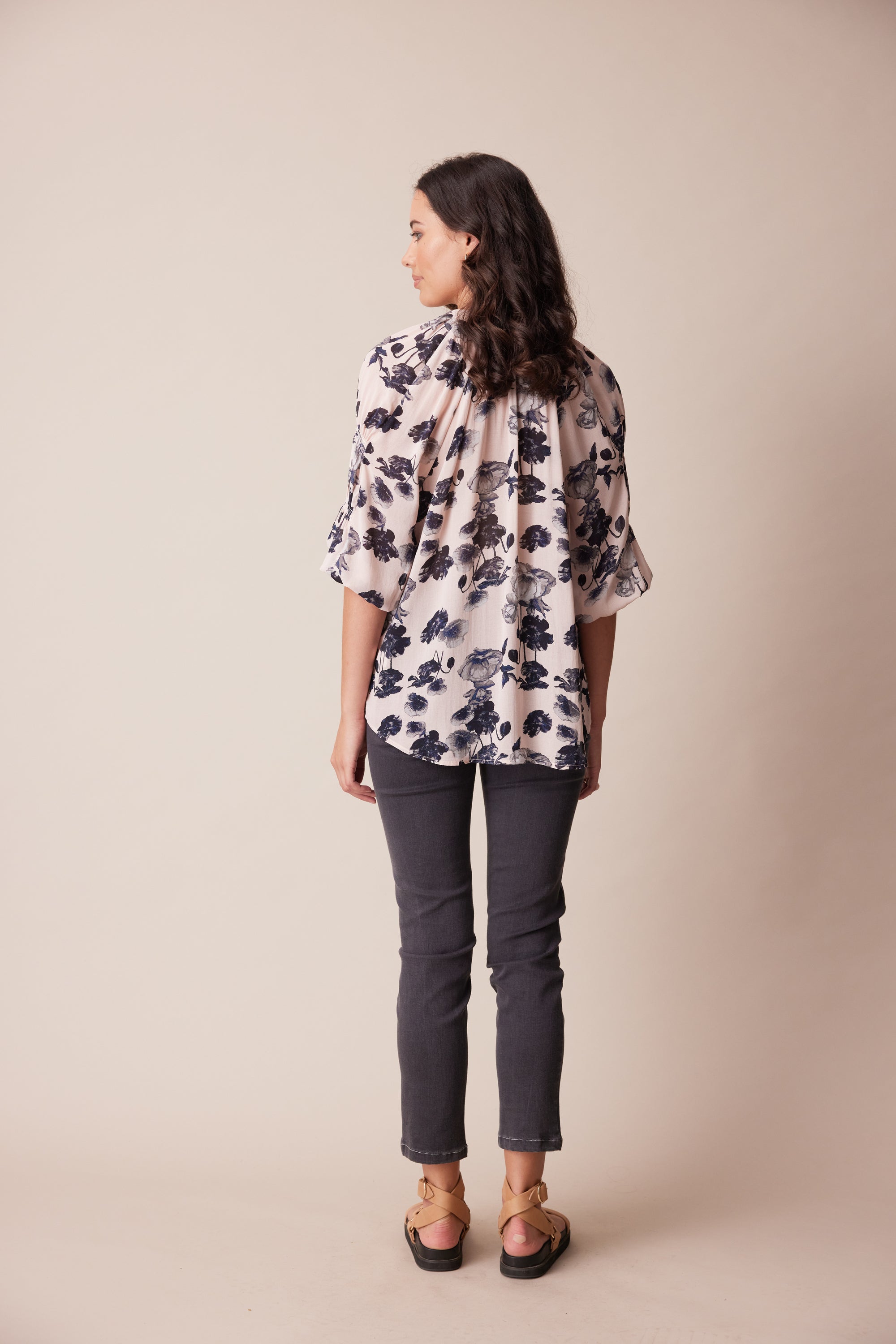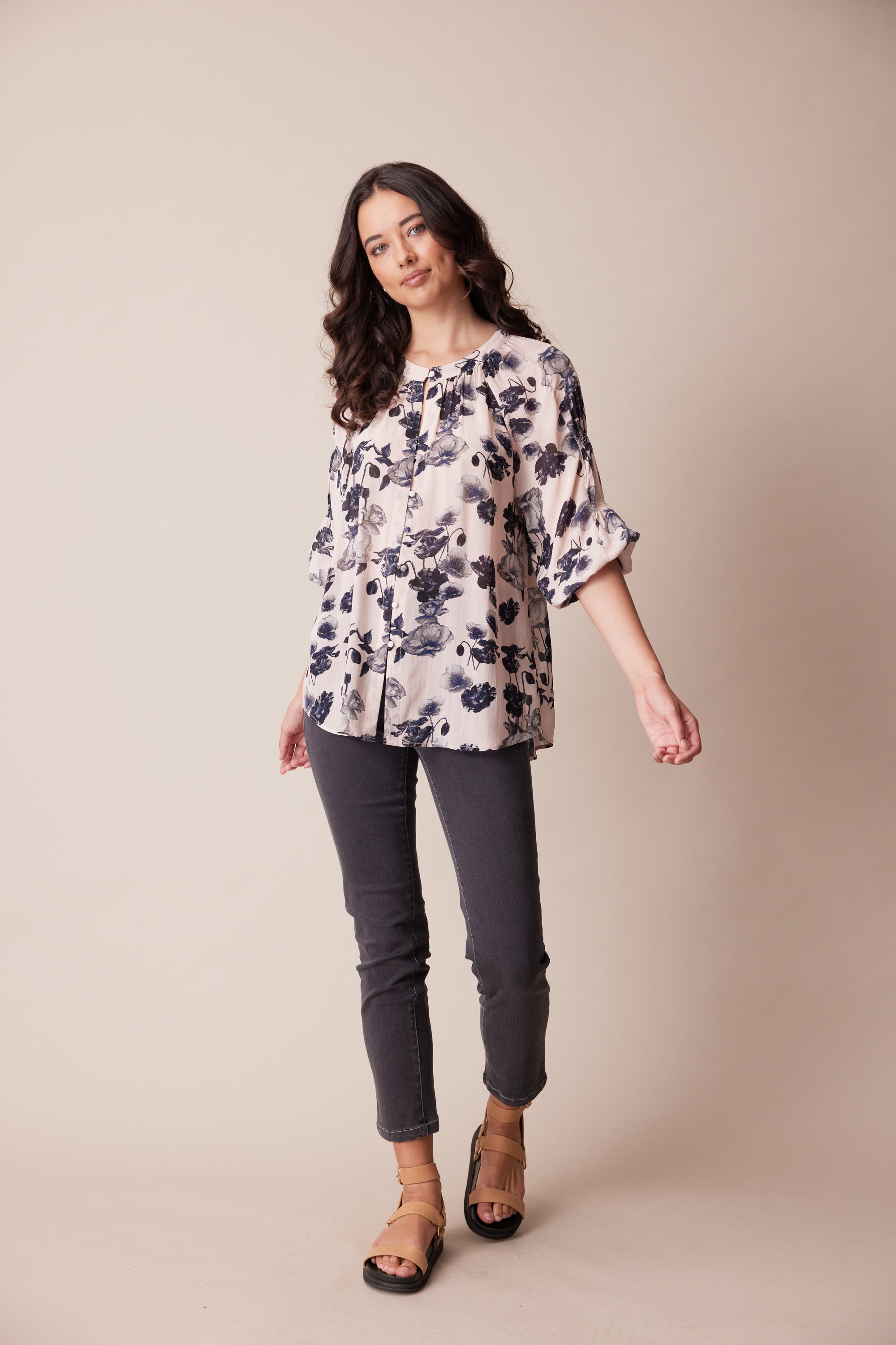 The Wall Flower print takes form in a relaxed fit raglan sleeve shirt. The soft gathered neckline, fabric covered buttons and shirring detail at the outer sleeves all contribute to the modern femininity of this style.