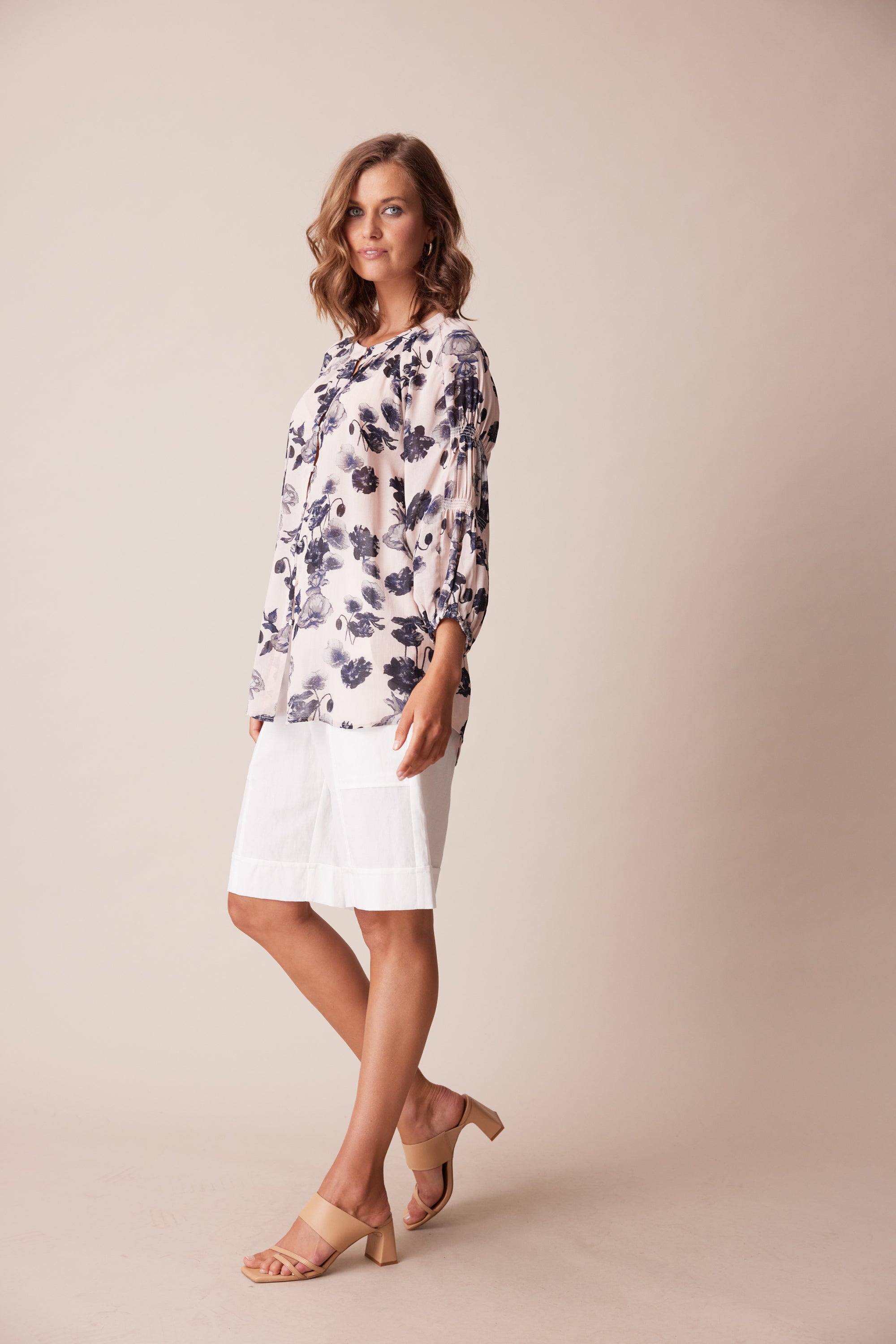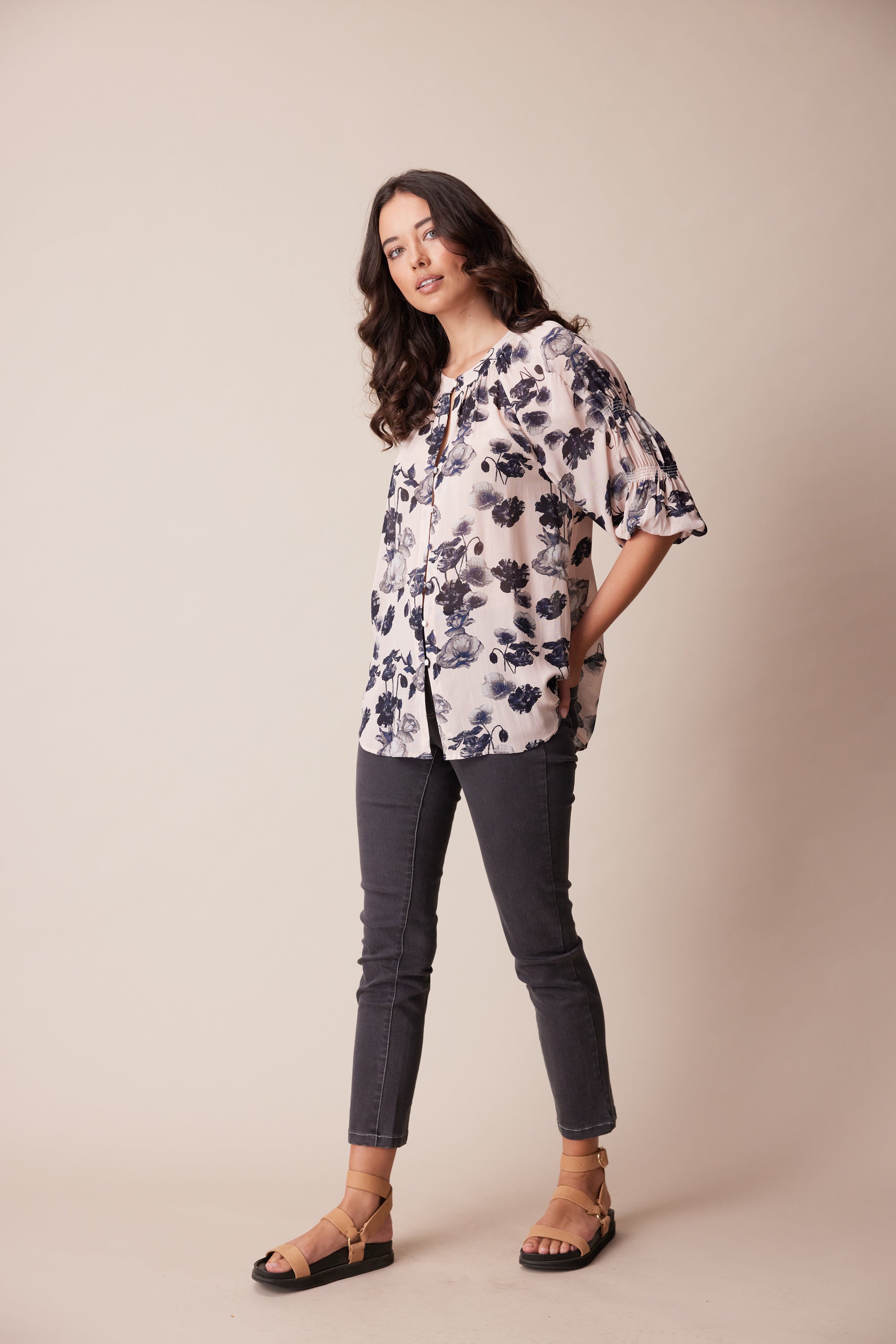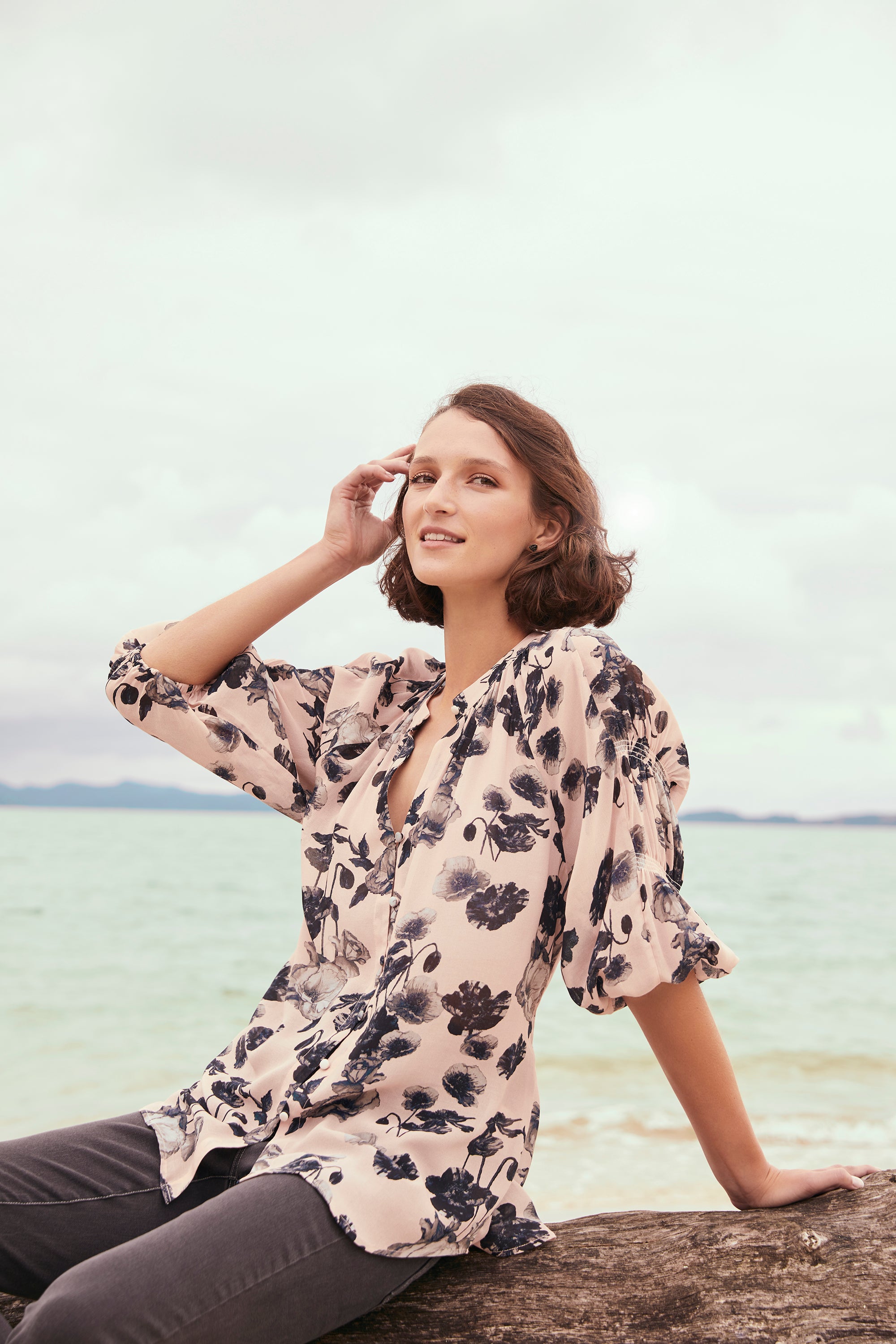 The Wall Flower print takes form in a relaxed fit raglan sleeve shirt. The soft gathered neckline, fabric covered buttons and shirring detail at the outer sleeves all contribute to the modern femininity of this style.