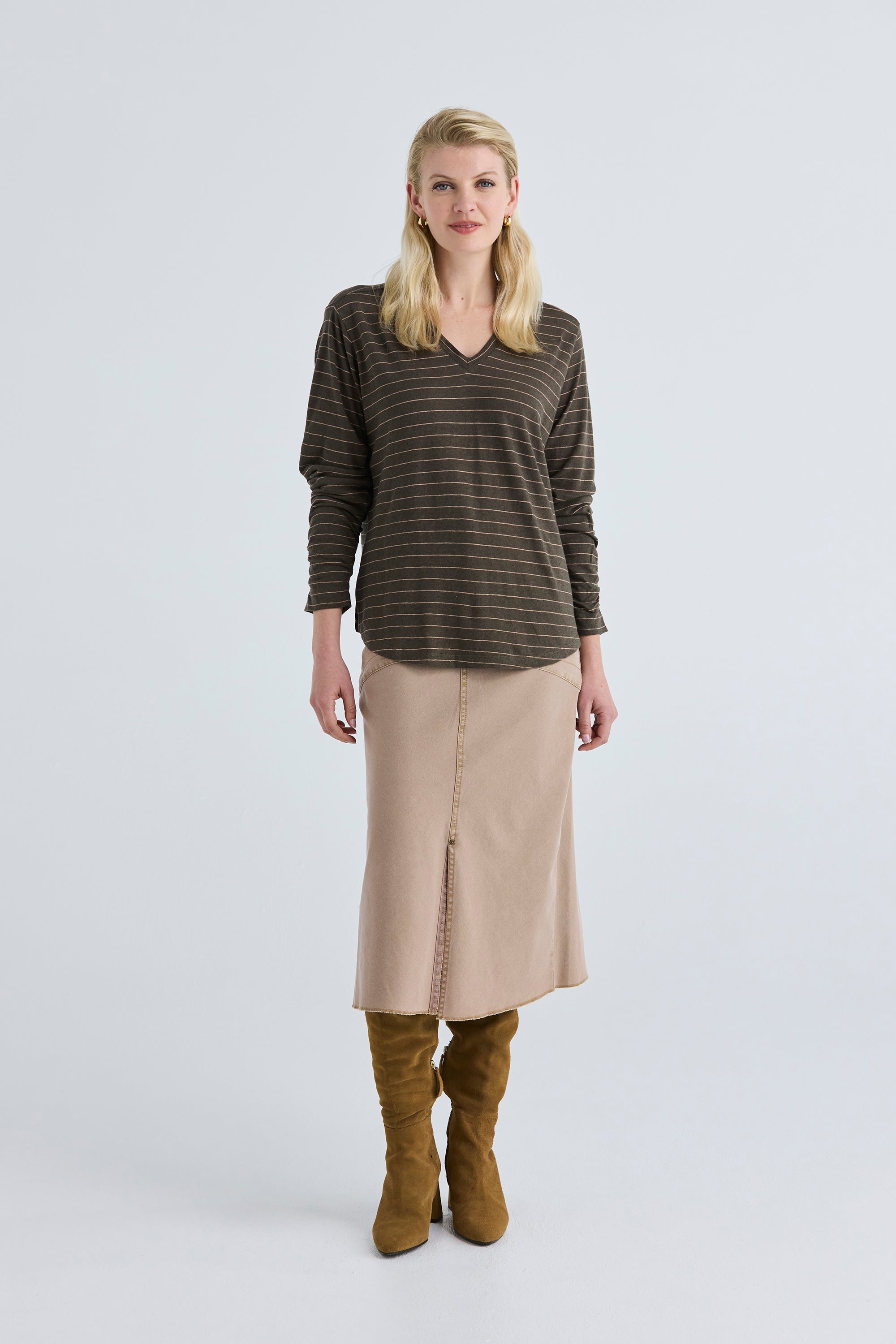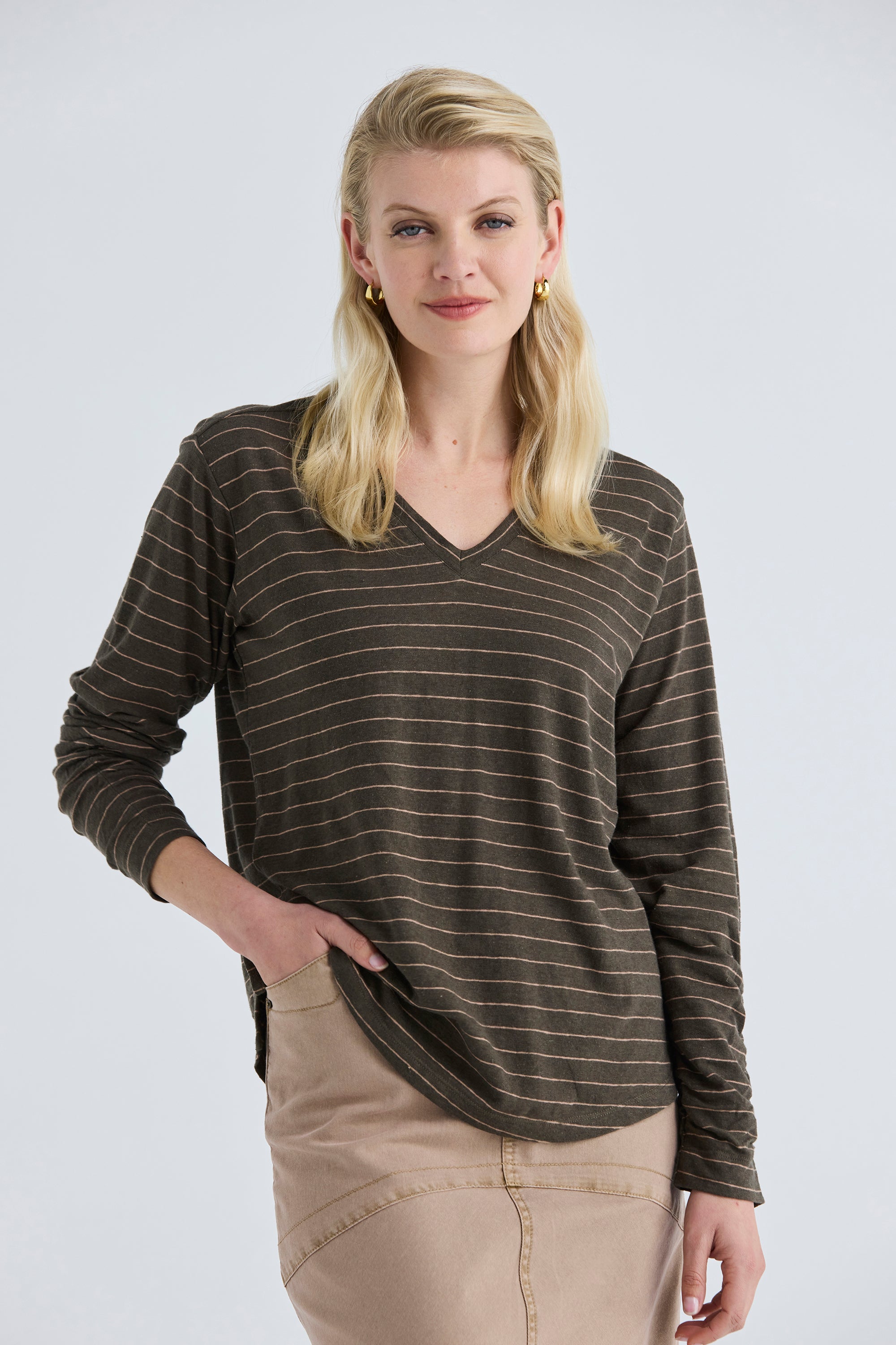 Embrace relaxed charm with the Wave Top. This top is made from a blend of linen and cotton in a striped design. Relaxed fit with V-neckline, featuring ruched detailing at the sleeve cuffs. This style is the perfect timeless basic to complete your wardrobe this season.