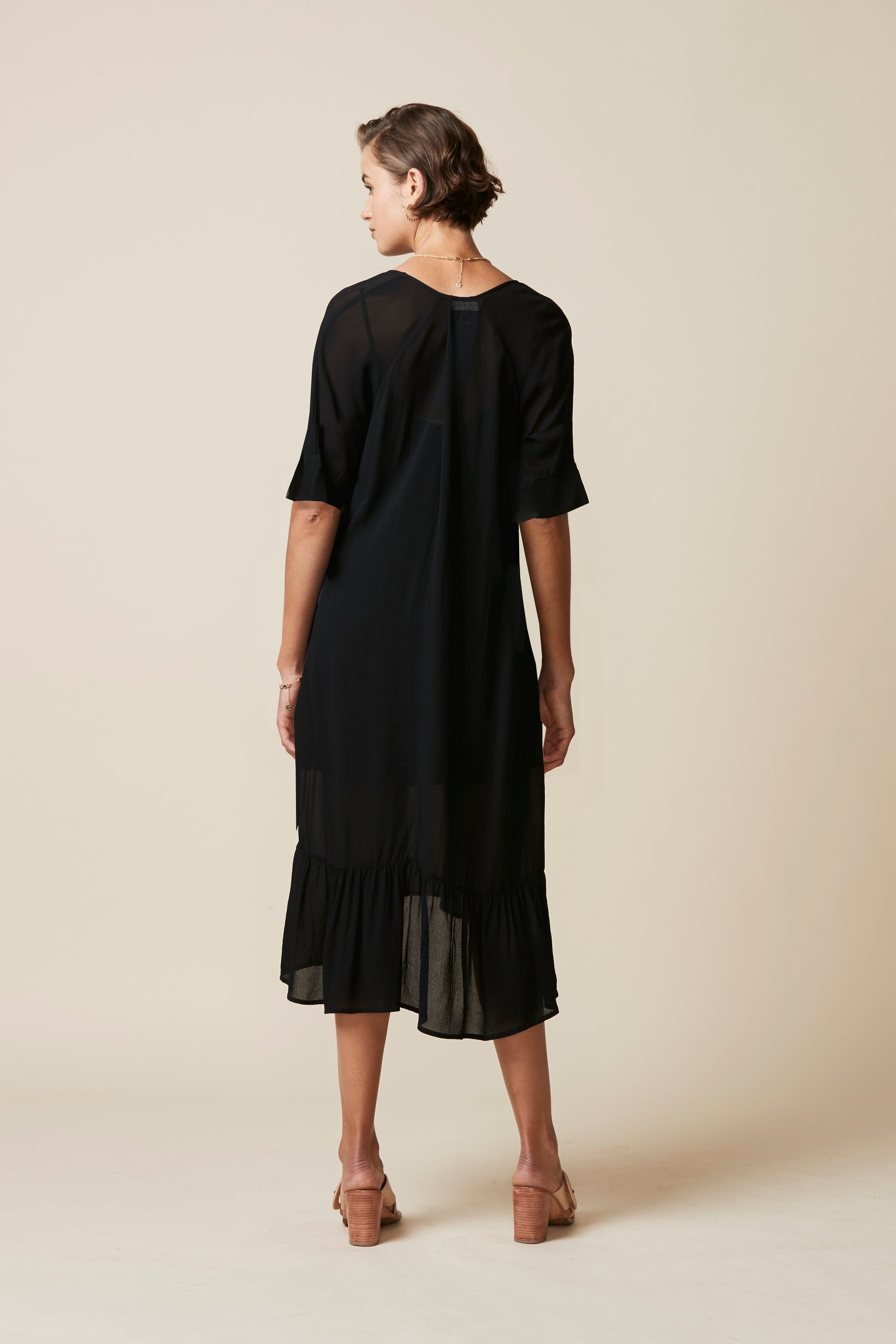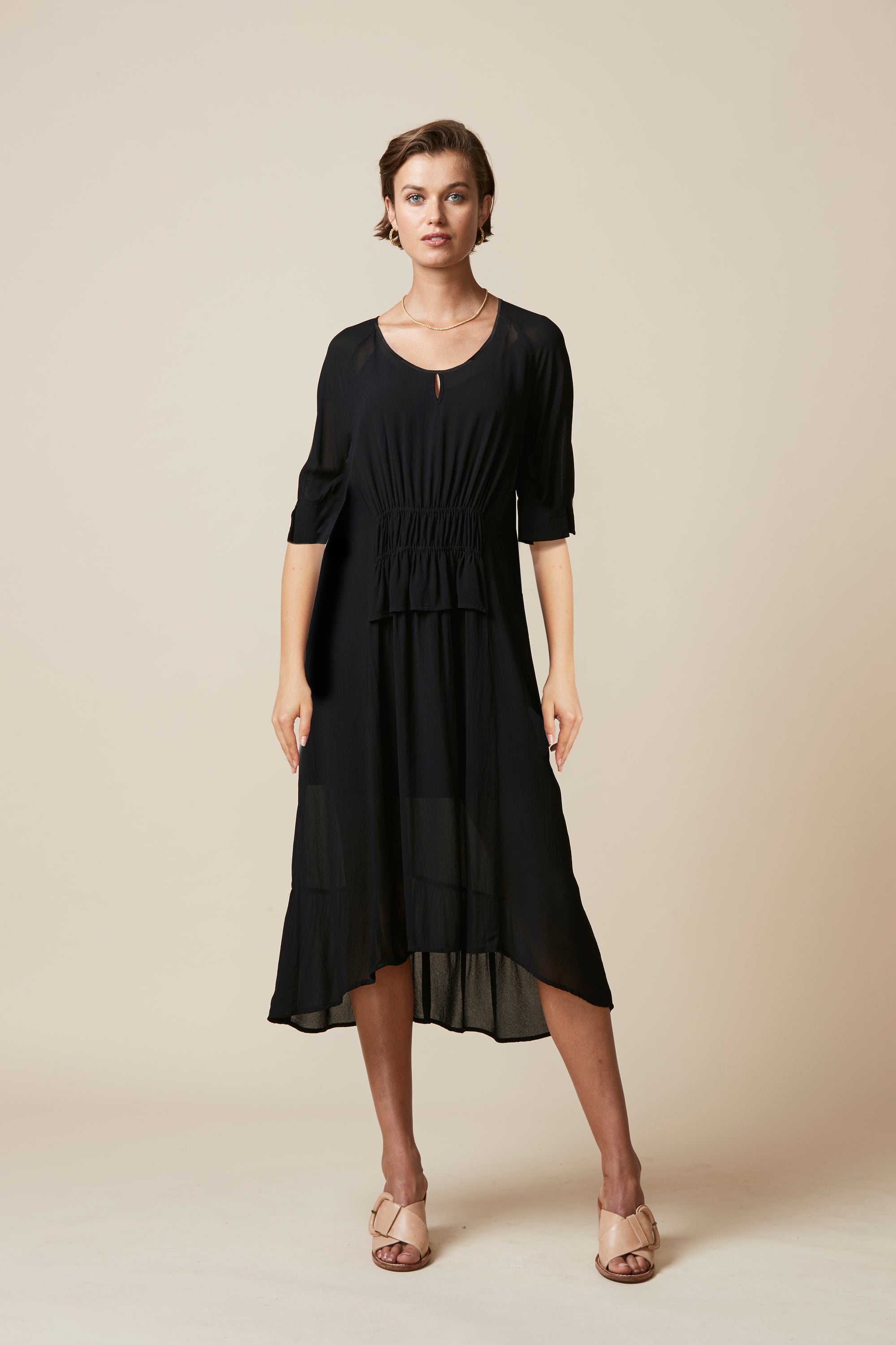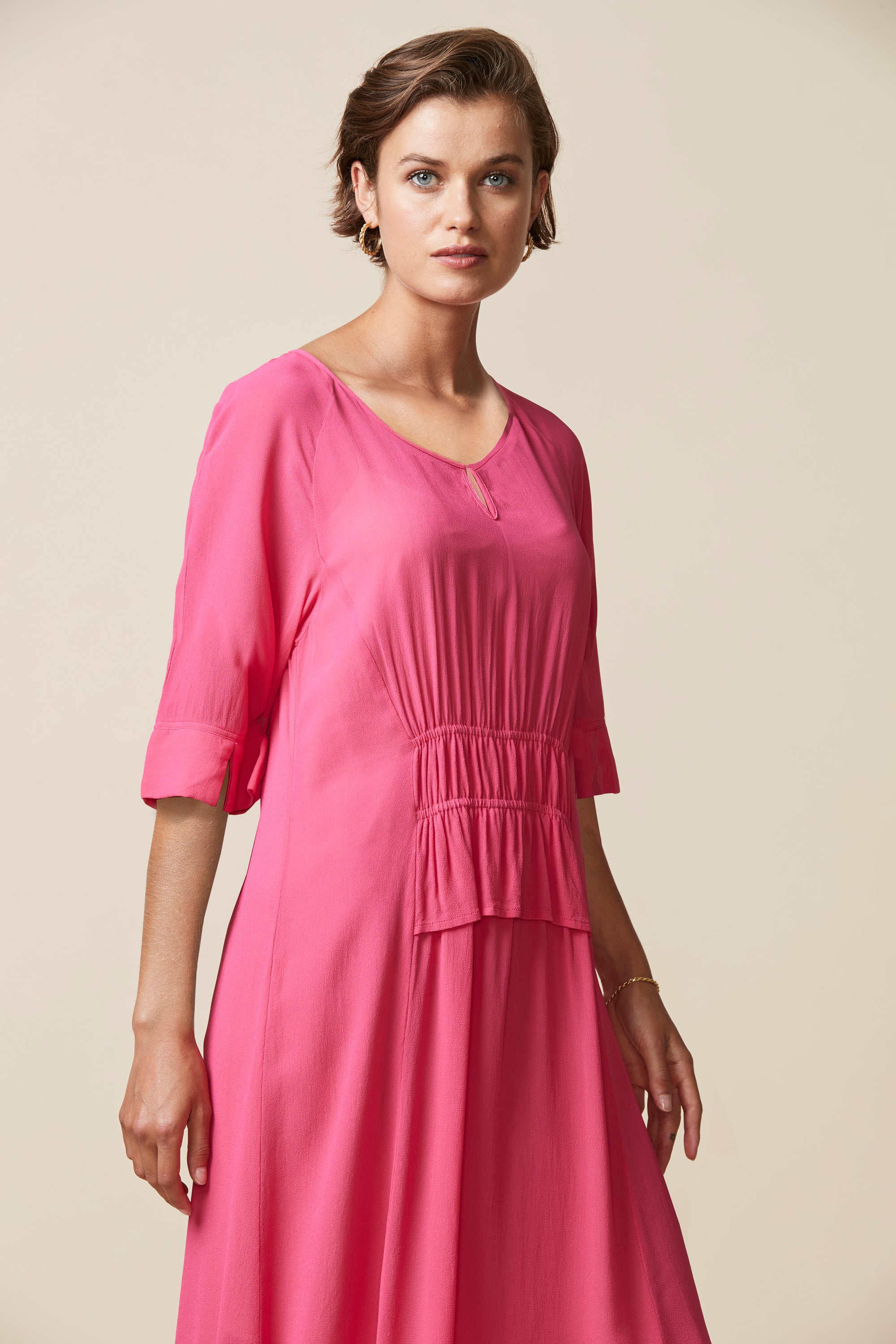 Beautiful occasion dress, with small keyhole opening at front neck, and ruching detail at front waist.