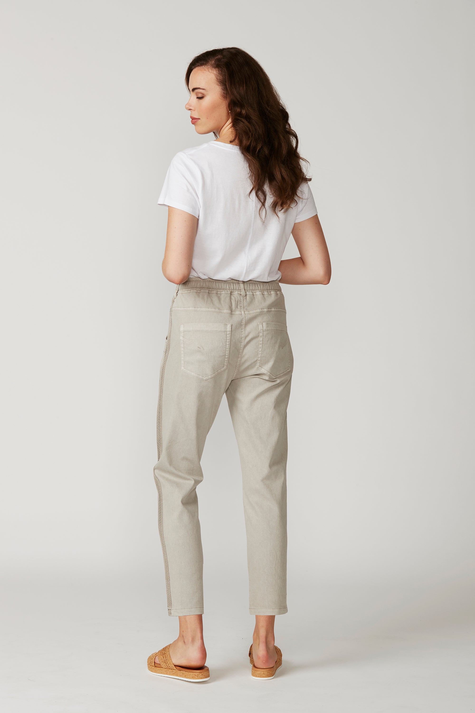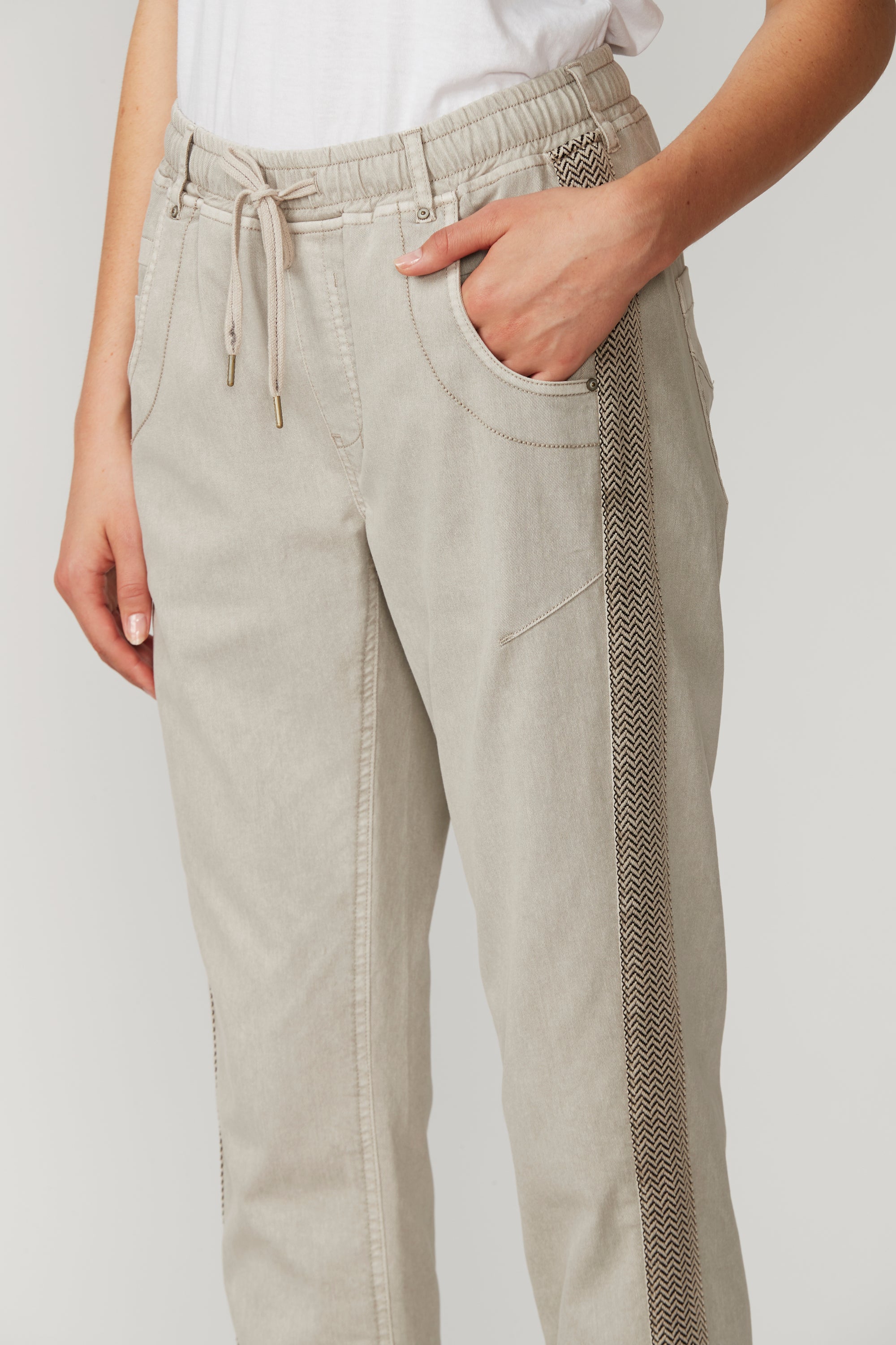 Casual jean with elasticated waist and adjustable drawstring tie. Novelty tape at outside leg. Soft handle and distressed finish are created by special garment wash.