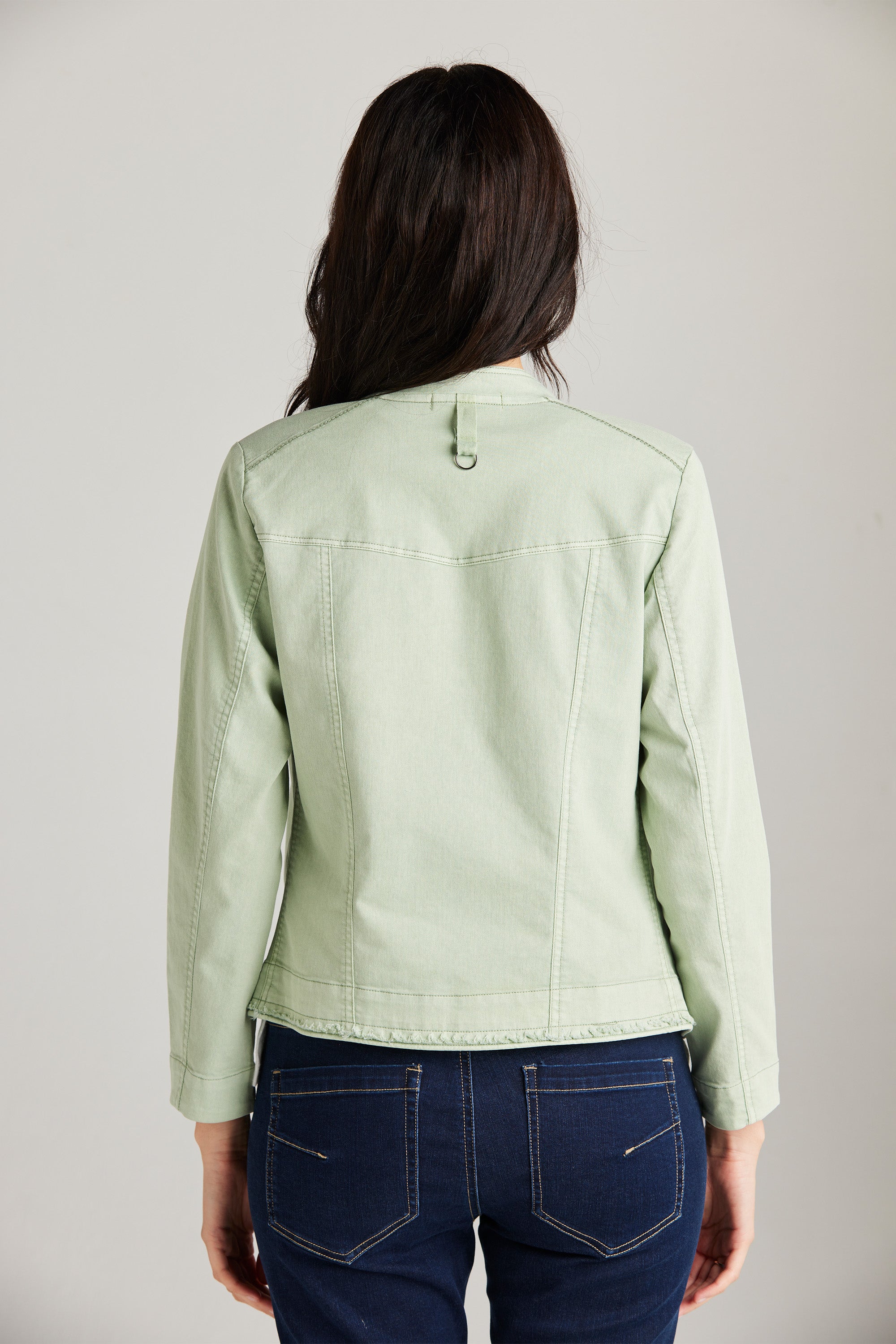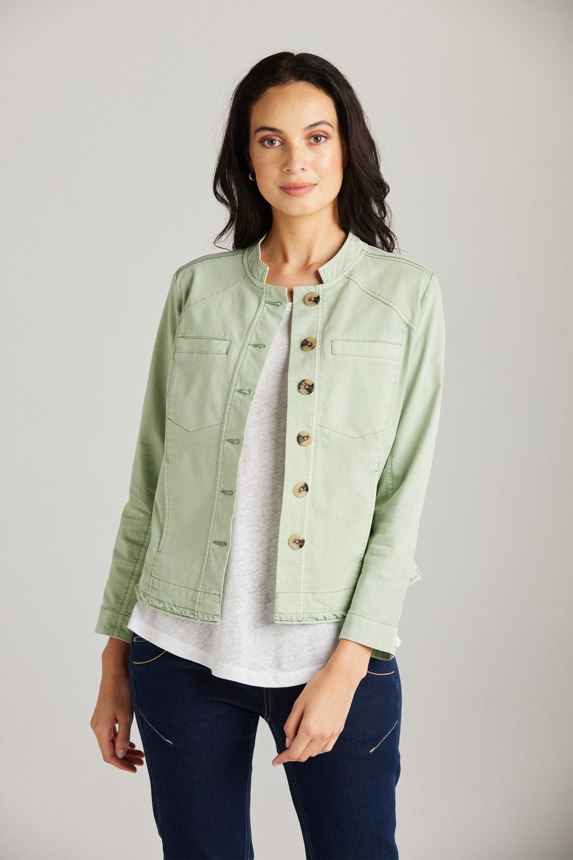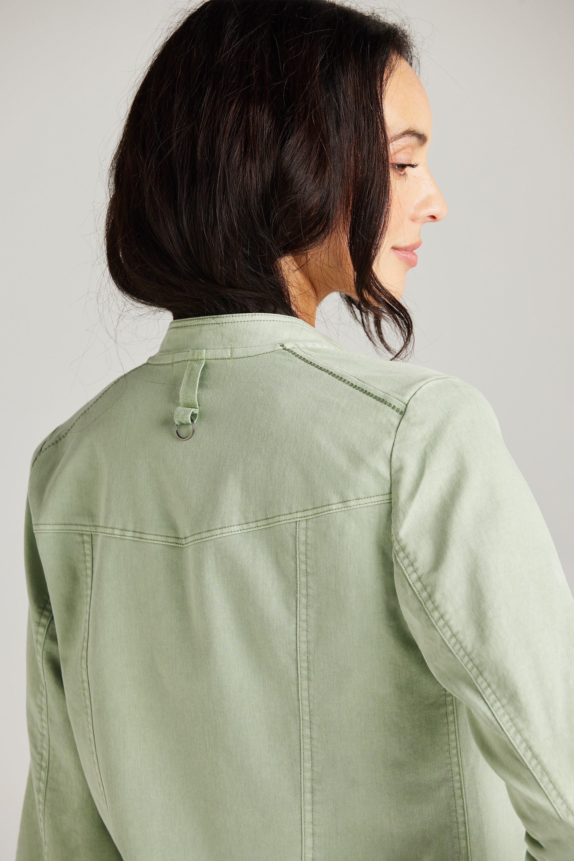 This neat-fit jacket takes form in a stretch cotton twill – perfect for cooler days or spring evenings. Designed with a frayed hem finish, embroidery stitching at yoke seams and novelty-cuff facing tape to elevate this classic wardrobe staple. This style is garment dyed to achieve a distressed look and soft hand feel.