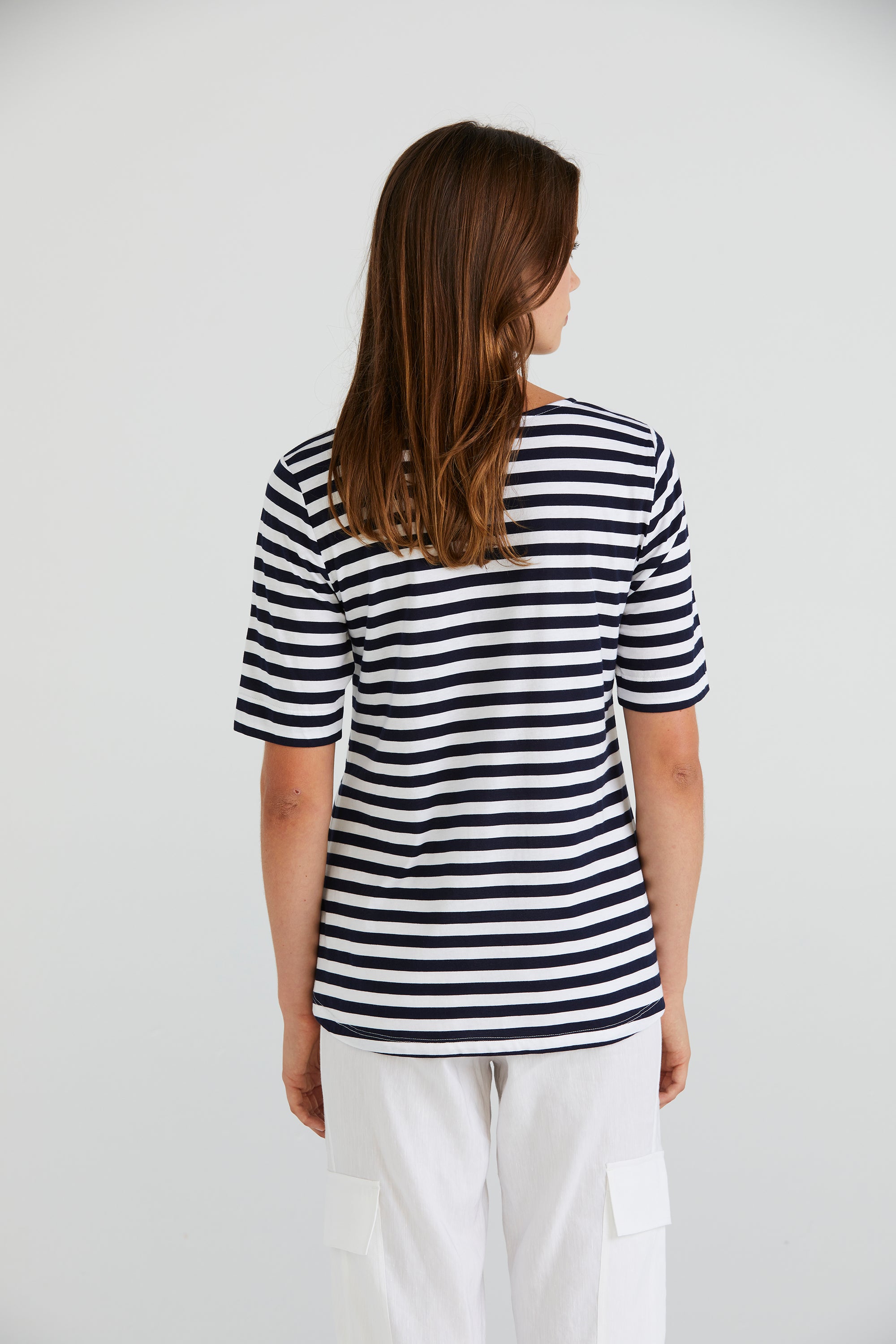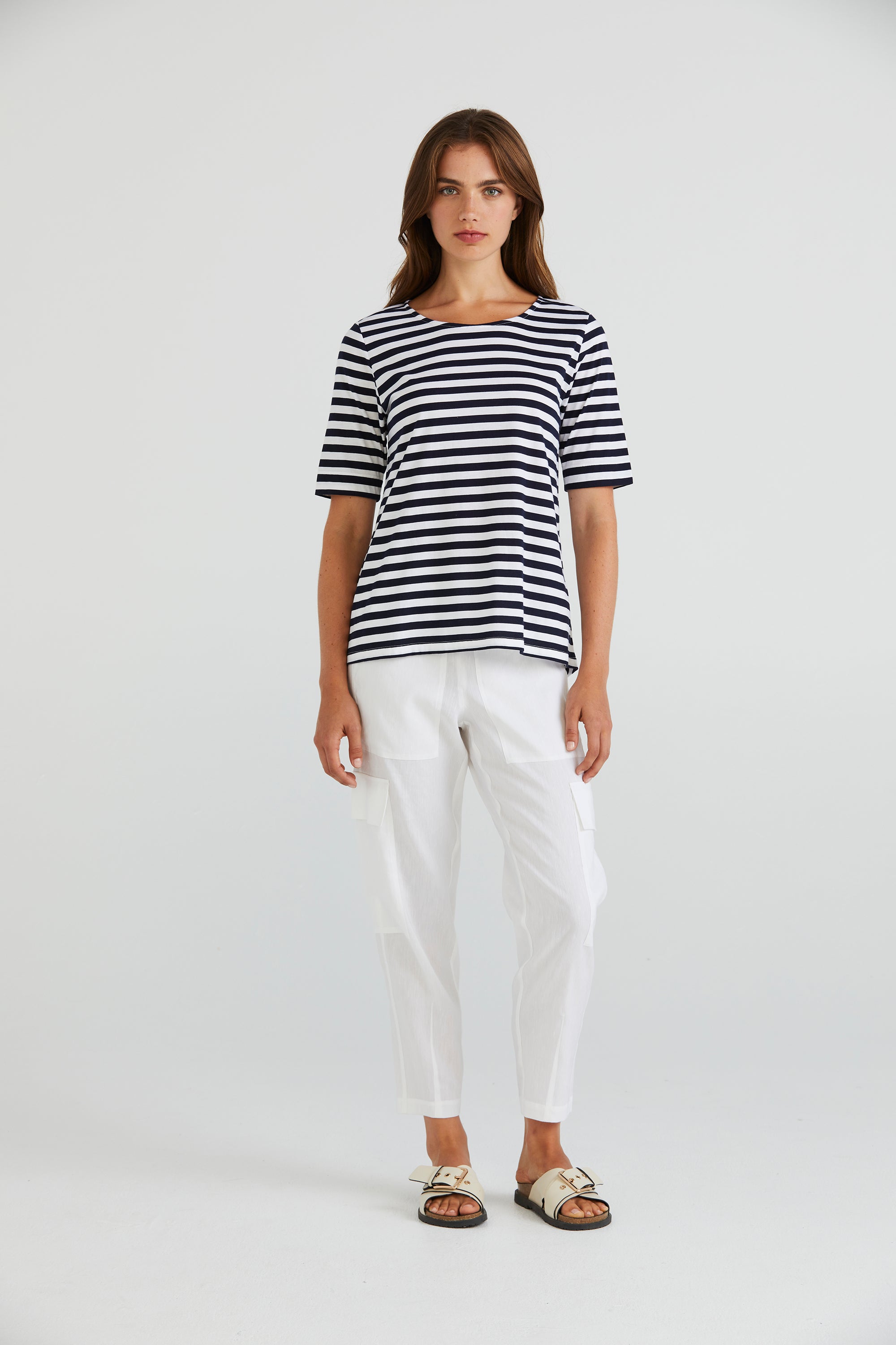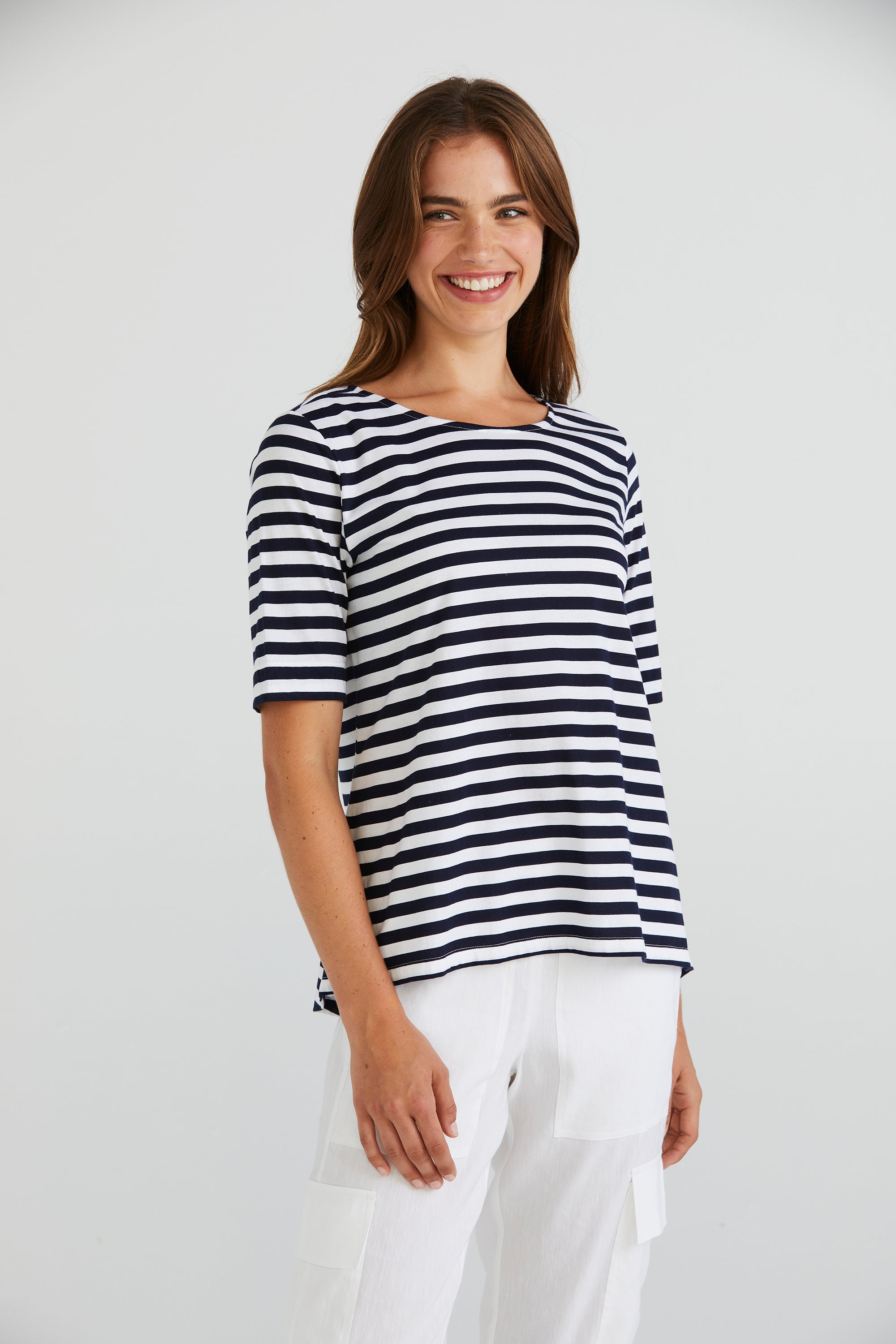 Embrace casual chic with the Zeal Stripe Top, a relaxed fit tee crafted from soft organic cotton. Featuring printed stripes, and a classic round neckline, this versatile piece is perfect for effortless everyday styling. Pair it with your favourite jeans or shorts for a laid-back yet stylish look.