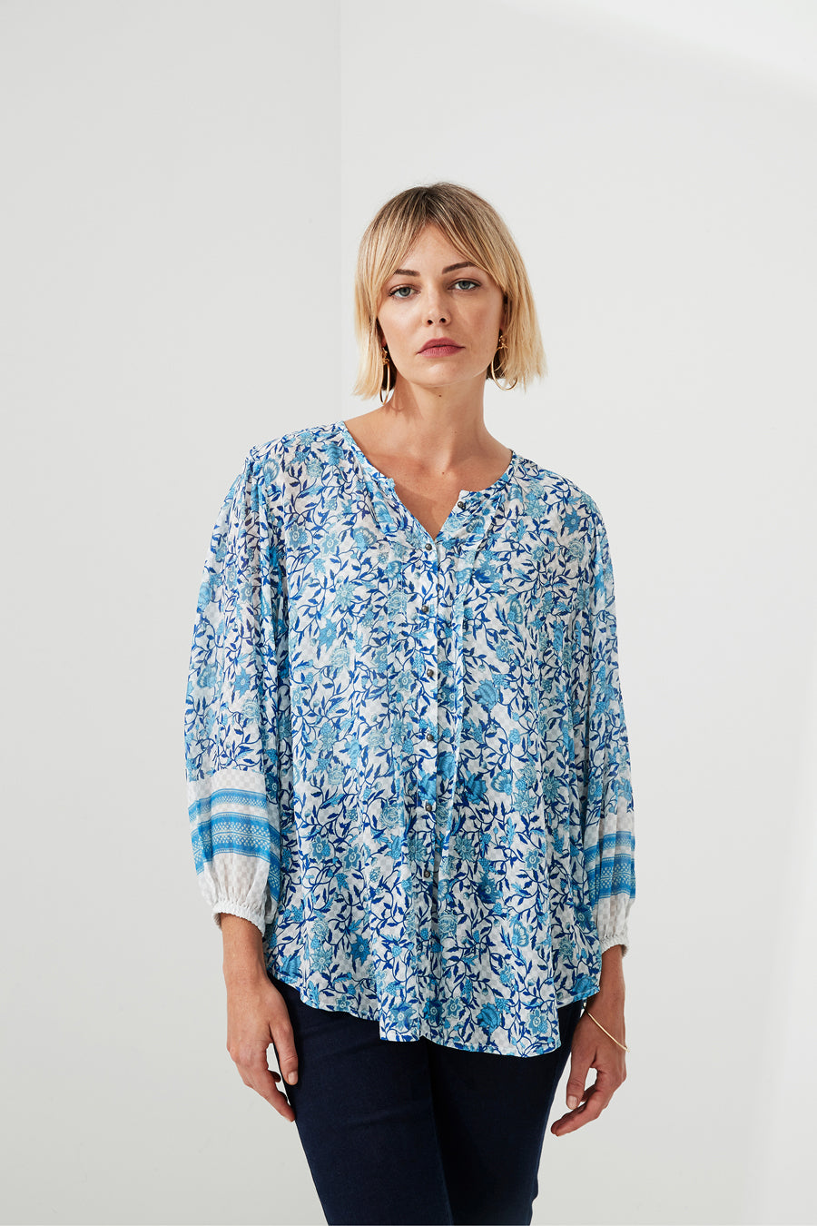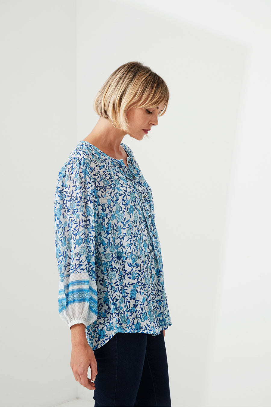 Rhythm and Blues, sheer, pretty gathered silhouette with elasticated border sleeve, dainty metal buttons at front opening.